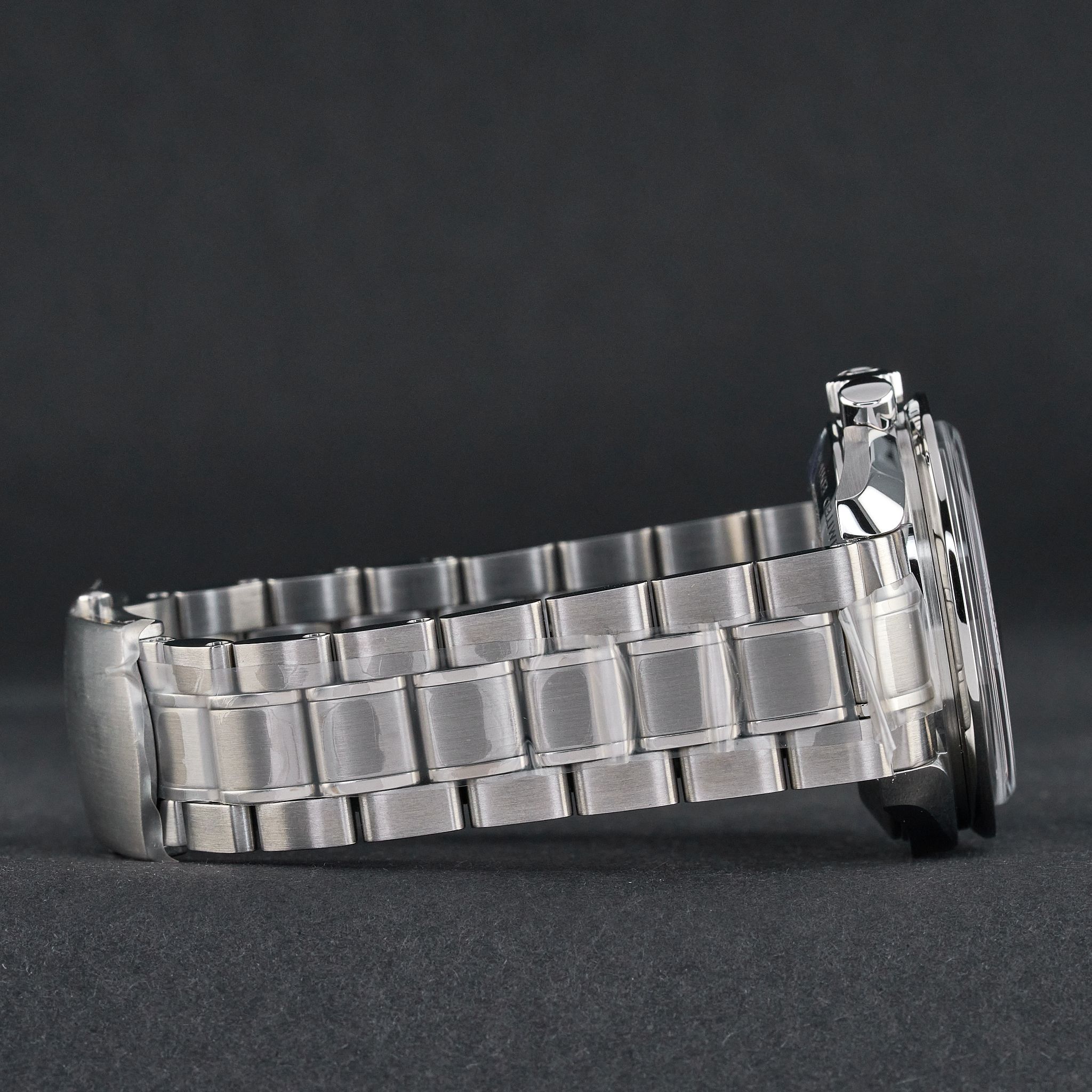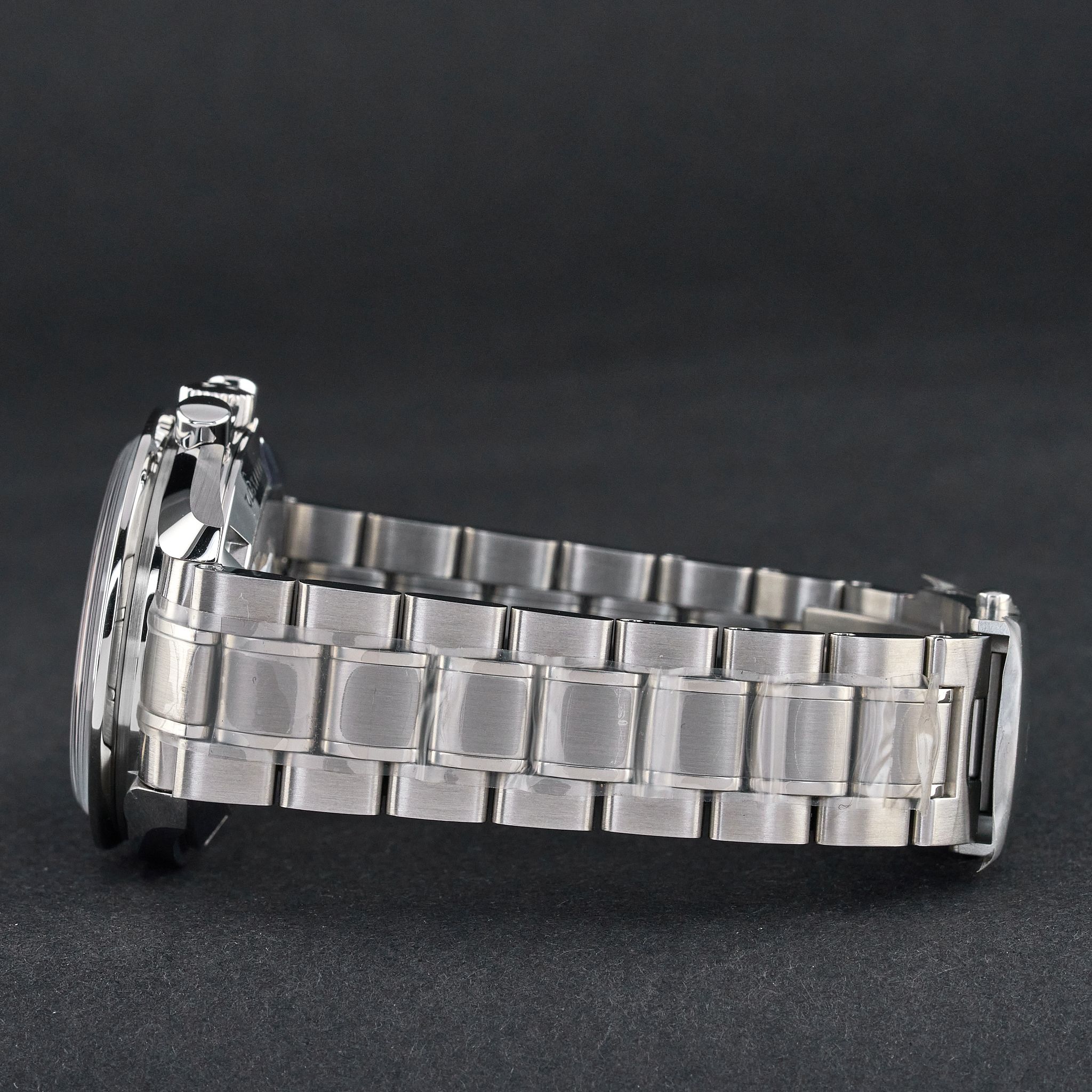 Armband: Die Uhr wird an einem originalen Edelstahlarmband mit Faltschließe "Omega" präsentiert, das ca. 21,5 cm lang ist, einschließlich des Uhrengehäuses, mit der "Omega"-Logoschließe.