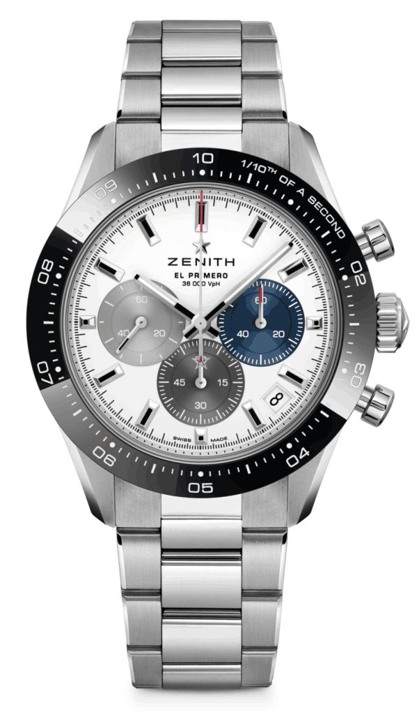 Die CHRONOMASTER Sport kombiniert Elemente früherer ZENITH-Chronographen wie das dreifarbige Zifferblatt, die Drücker im Pumpenstil und das Stahlarmband mit einer schwarzen Keramiklünette in einem modernen 41-mm-Gehäuse. Diese Version hat ein weißes Zifferblatt und ein integriertes Stahlarmband. Angetrieben wird sie vom automatischen Chronographenwerk El Primero 3600 mit einer Ganggenauigkeit von einer Zehntelsekunde.
