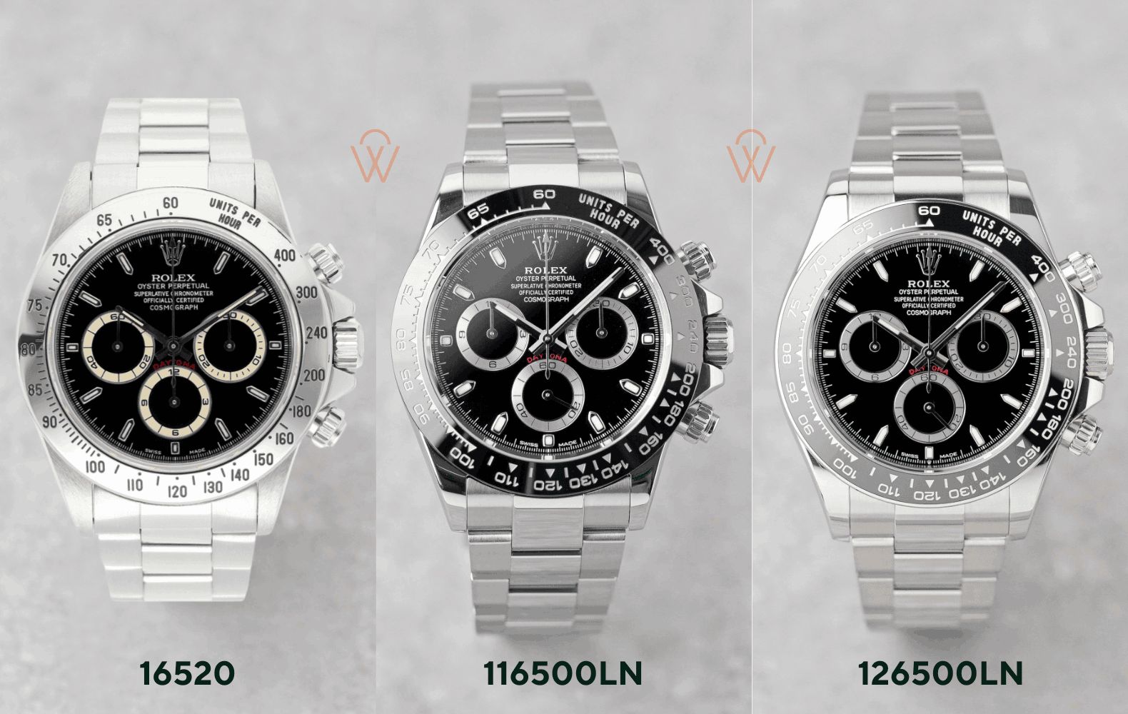 Los últimos Daytonas (126500LN) refinan todo lo que vino antes: perfiles más delgados en comparación con la serie 116, movimientos actualizados y pequeños ajustes estéticos que los coleccionistas notan de inmediato. Aún no se ha decidido cuál es el más popular: algunos dicen que el 116, otros votan por la referencia 126. ¿Nuestra opinión? El 116 se siente audaz, mientras que el 126 es un poco más elegante. Así que, mantente elegante. Estas referencias están en la cima de la demanda del mercado y son de los relojes Rolex más difíciles de conseguir. A pesar de que la especificación de 40 mm permanece sin cambios en papel, los Daytonas modernos se sienten más pesados, densos y sustanciales que sus predecesores de 5 dígitos.