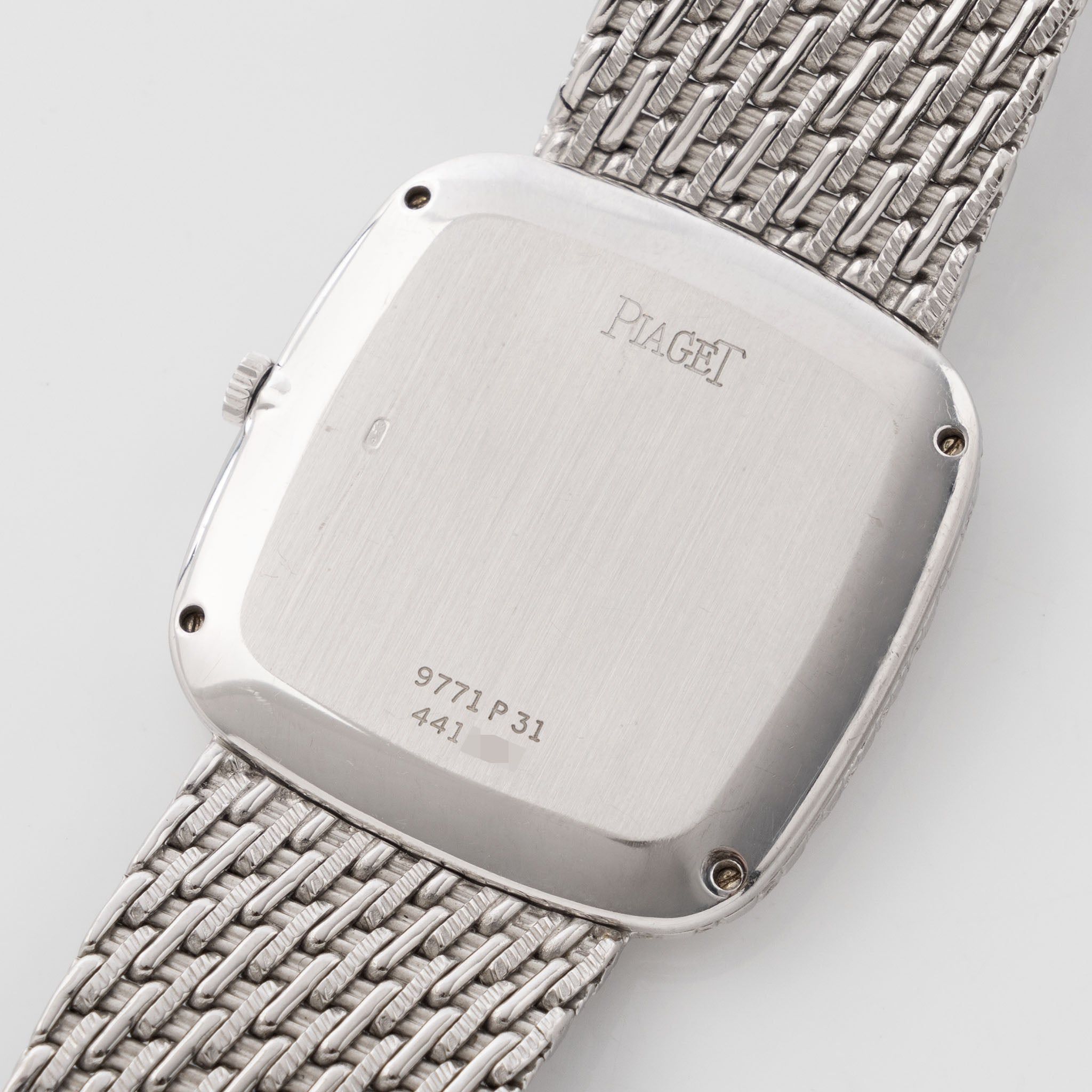 This Piaget, reference 9771P31, is a prime example from the brand's golden era—a period between the 1960s and 1990s when Piaget perfected the art of seamlessly combining high-end watchmaking with exceptional jewelry craftsmanship! This particular model captures the essence of the iconic Piaget style: an ultra-slim, distinctive cushion-shaped case in 18K white gold, measuring 30 x 30 mm, and a masterful blend of onyx, 18K white gold, and a special hand-engraved area on the dial. The thin and very cool "woven" integrated white gold bracelet fits wrists up to 17.5 cm. This fine dresser is powered by the hand-wound Caliber 9P2, which has been fully checked by our watchmaker. We have a full quartet of these iconic Piaget dress watches, and they are finally getting the attention these high-end jewelry timepieces deserve. We’d love to chat with you to help you choose the one that suits you best. Get in touch! Specifications: - Piaget Reference 9771P31 Tradition- 30mm 18K white gold cushion-shaped ultra-thin case- Onyx hand-engraved finished dial with four diamond hour markers- No-lume dauphine hands- Hand-wound ultra-thin Cal. 9P2- Integrated "woven" 18K white gold bracelet- Serial 441xxx, dating to the early 1980s- Fully checked by our watchmaker- One-year mechanical warranty- Free worldwide FedEx Priority shipping