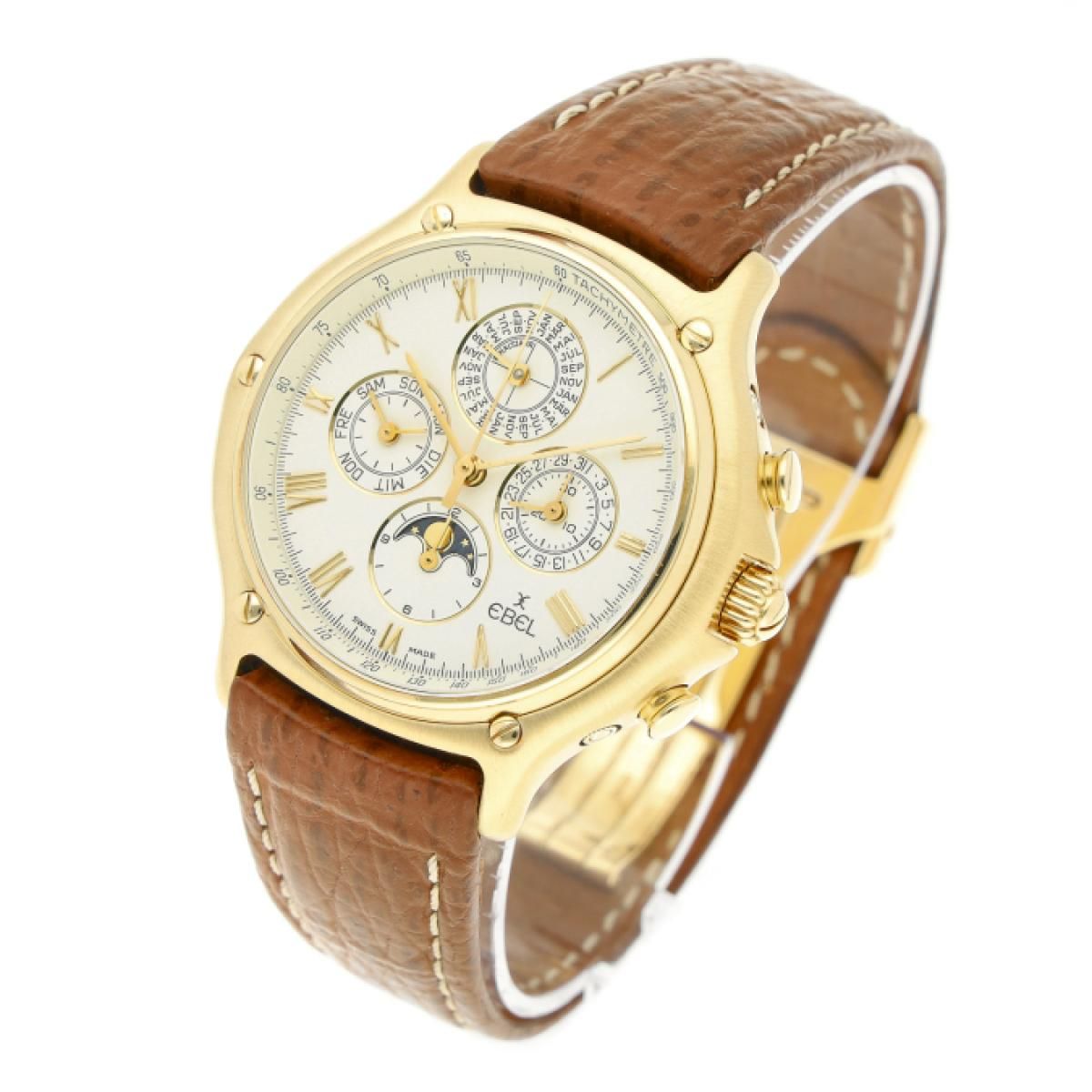 Ebel 1911 from 1990 with a 40mm case in gold and folding clasp. The men's Ebel watch is in very good condition.Very good conditionRef. 813690140mmdateWeekday displayChronographTachymeterAutomaticMonth displayFour-year calendarMoon phase18ct goldRomanWhite Dial