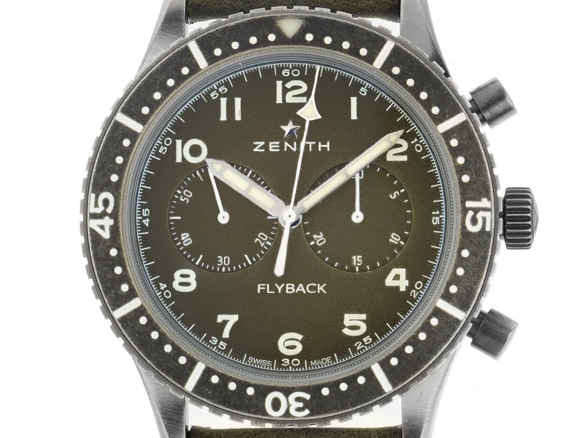 Zenith Pilot Chronometer Flyback Typ CP-2 Stahl Automatik Flyback Chronograph Armband Leder KautschukGehäuse Edelstahl satiniert, Gehäusedurchmesser ohne Krone 43mm, Gehäusehöhe 13mm. Lünette Edelstahl mit olivgrünem Inlay und 60-Minuten Skala, beidseitig drehbar. Zenith Armband Leder/ Kautschuk olivgrün, Anstoßbreite 22mm, Stiftschließe Edelstahl mit Hersteller-Logo. Zifferblatt olivgrün mit arabischen Ziffern und Edelstahl Leuchtzeigern. Uhrwerk Automatik, Chronograph, Kaliber El Primo 405 B mit 31 Edelsteinen. Anzeige von Stunde und Minute über Zeiger aus der Mitte, kleine Sekunde mit Sekundenstopp zur sekundengenauen Einstellung der Uhrzeit bei 9 Uhr. Saphirglas kratzfest gewölbt. Krone geriffelt mit Hersteller-Logo. Boden Edelstahl 4-fach verschraubt und graviert, mit Saphirglas Sichtfenster. Gewicht der Uhr inklusive Armband 86g. Wasserdicht bis 10 ATM. Referenznummer: 11.2240.405/21.C773, ID: ST1160105300322H-7900, Artikelnummer: 10000063685. Original Zenith Box mit Umkarton und Garantie Papiere von 03/2022 sowie Beschreibung und Ledermäppchen, Full Set. Ungetragen. Lieferzeit sofort.