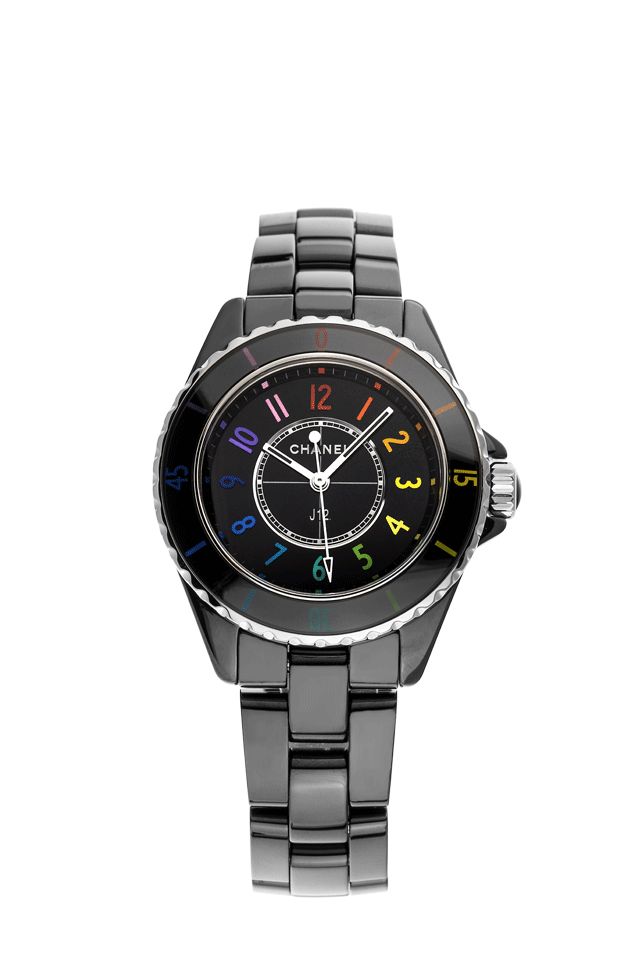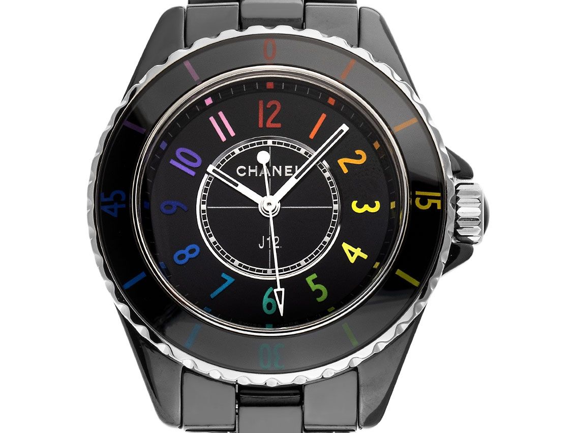 Chanel J12 Keramik Black Stahl Quarz Armband Keramik Black LimitiertGehäuse Keramik schwarz, Gehäusedurchmesser ohne Krone 33mm, Gehäusehöhe 12,8mm. Lünette Edelstahl mit schwarzem Keramik Inlay und bunter 60-Minuten Skala, einseitig drehbar. Armband Keramik schwarz, verdeckte Doppelfaltschließe Edelstahl / Keramik schwarz. Zifferblatt schwarz mit aufgesetzten bunten arabischen Ziffern und Edelstahl Leuchtzeigern. Uhrwerk quarzgesteuert. Anzeige von Stunde, Minute und Sekunde über Zeiger aus der Mitte mit Sekundenstopp zur sekundengenauen Einstellung der Uhrzeit. Saphirglas kratzfest und gewölbt. Krone verschraubbar mit Flankenschutz und Keramik Inlay. Boden Edelstahl 4-fach verschraubt und graviert. Gewicht der Uhr inklusive Armband 102g, Länge des Armbandes inklusive Gehäuse 165mm. Wasserdicht bis 20 ATM Referenznummer: H7121, Gehäusenummer: KTD07XXX, ID: ST3657110000323H-7900, Artikelnummer: 10000069018. Original Chanel Box mit Umkarton und Garantie Papiere von 03/2023, Full Set. Limitiert auf 1255 Exemplare. Ungetragen. Lieferzeit sofort.