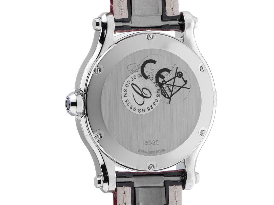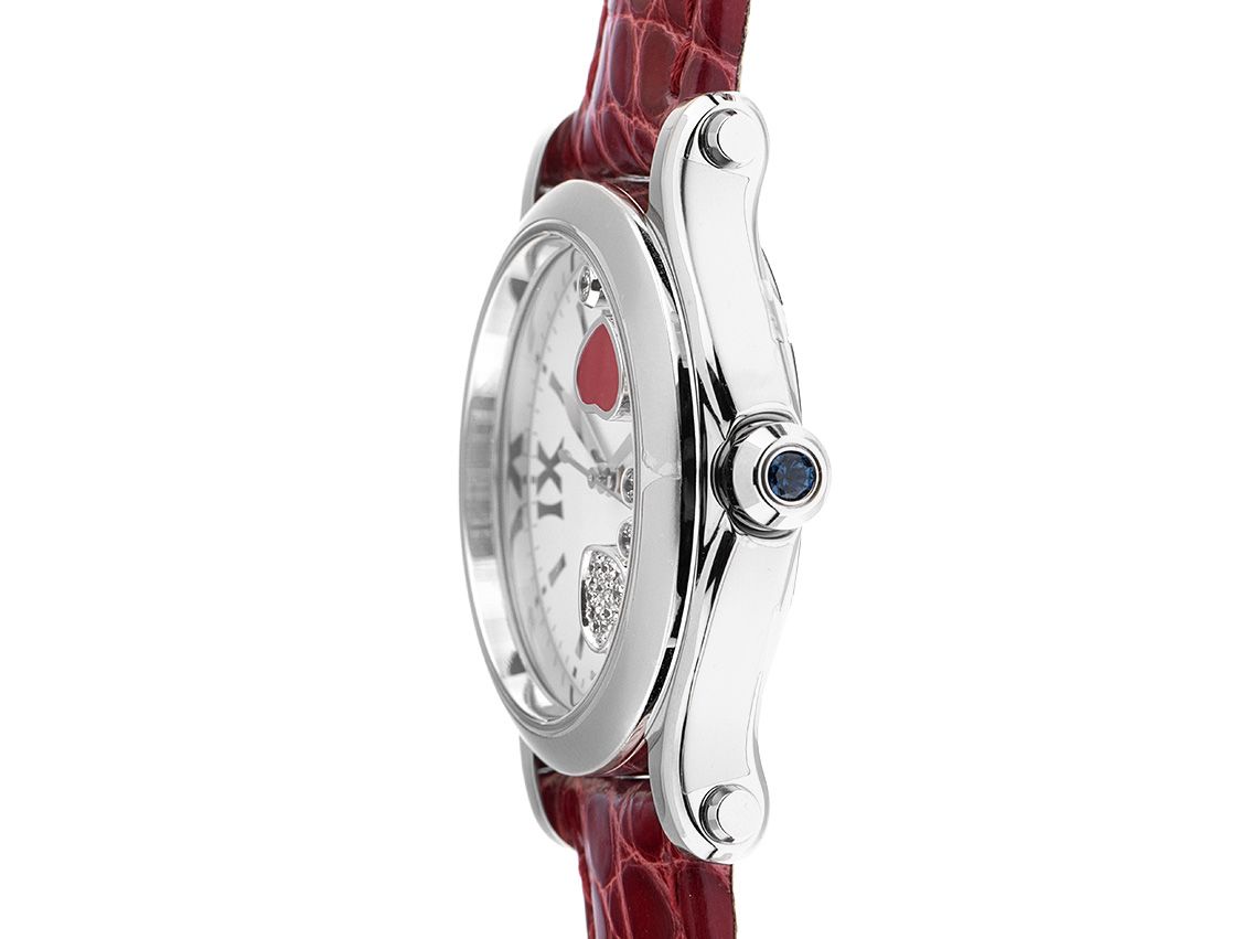 Chopard Happy Hearts Stahl Diamanten Saphir Quarz Armband KrokolederGehäuse Edelstahl poliert, Gehäusedurchmesser ohne Krone 36mm, Gehäusehöhe 10,46mm. Lünette Edelstahl glatt und poliert. Armband Krokoleder rot Anstoßbreite 17mm, Stiftschließe Edelstahl mit Hersteller-Logo. Zifferblatt weiß mit 3 beweglichen Brillanten, einem mit 7 Brillanten besetzten Herz, zusammen ca. 0,24ct TW-W / IF-VVSI (feines Weiß lupenrein bis sehr sehr kleine Einschlüsse) und einem Herz mit rotem Inlay sowie aufgesetzten römischen Edelstahl Ziffern, Edelstahl Indexen und Edelstahl Zeigern. Uhrwerk quarzgesteuert mit 7 Edelsteinen. Anzeige von Stunde, Minute und Sekunde über Zeiger aus der Mitte mit Sekundenstopp zur sekundengenauen Einstellung der Uhrzeit, Datumsanzeige mit Schnellverstellung zwischen 4 und 5 Uhr. Saphirglas kratzfest. Krone mit Saphir Cabochon. Boden Edelstahl 6-fach verschraubt und graviert. Gewicht der Uhr inklusive Armband 54g. Wasserdicht bis 3 ATM. Referenznummer: 278582-3005, ID: ST1160103560224H-7930, Artikelnummer: 10000073285. Original Chopard Box mit Umkarton und und Garantie Papiere von 10/2023 sowie Beschreibung, Full Set. Ungetragen, teilverklebt. Lieferzeit sofort.