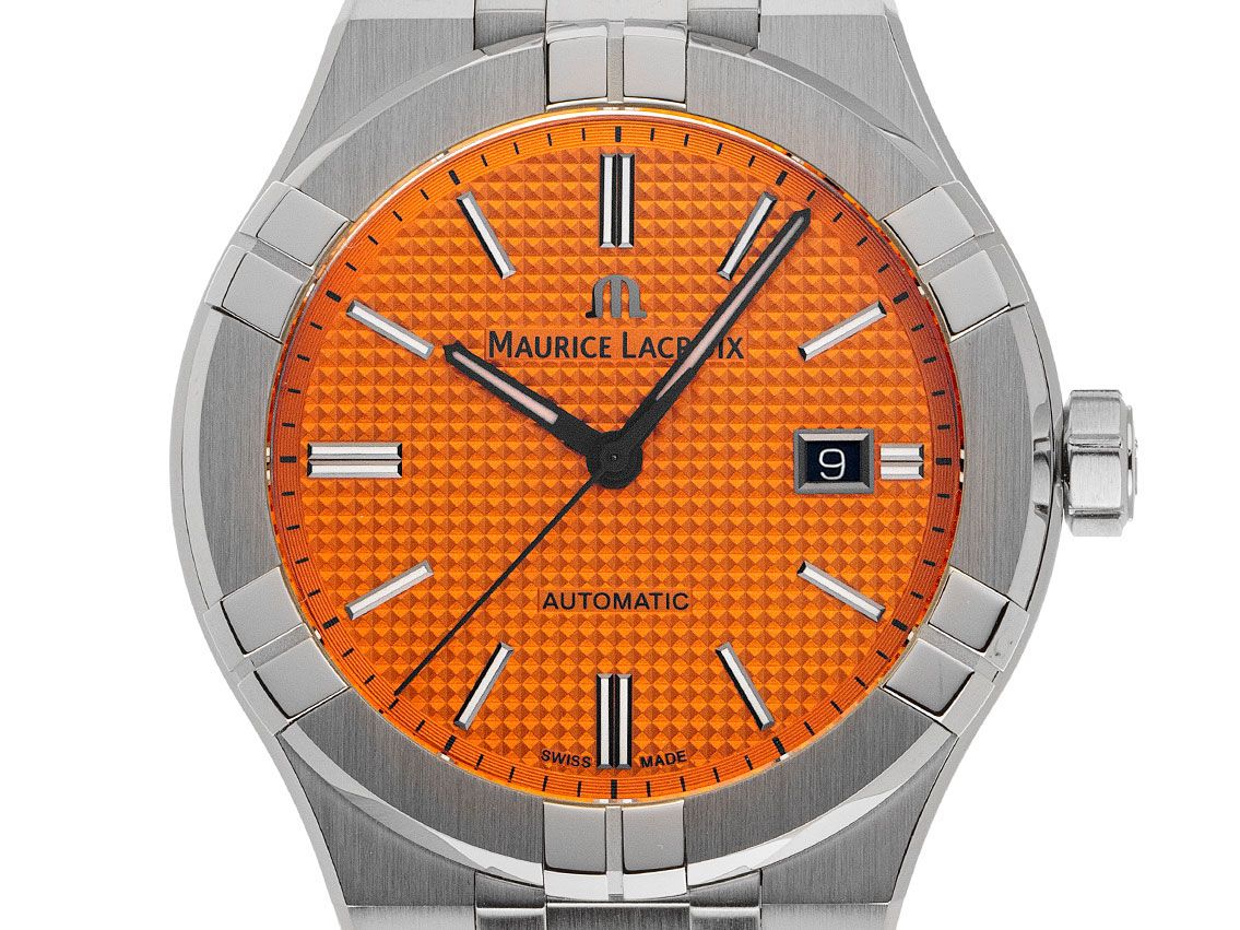 Maurice Lacroix Aikon Summer Edition Limitiert Stahl Automatik ArmbandGehäuse Edelstahl poliert und satiniert, Gehäusedurchmesser ohne Krone 42mm, Gehäusehöhe 11,0mm. Lünette Edelstahl satiniert mit polierten Reitern. Armband Edelstahl poliert und satiniert, verdeckte Doppelsicherheitsfaltschließe Edelstahl mit Hersteller-Logo. Zifferblatt orange mit Waffelmuster, aufgesetzten Leuchtindexen und polierten Leuchtzeigern. Uhrwerk Automatik, Maurice Lacroix Manufakturkaliber ML115 mit 26 Edelsteinen, 28.800 A/h, Gangreserve ca. 38 Stunden. Anzeige von Stunde, Minute und Sekunde über Zeiger aus der Mitte mit Sekundenstopp zur sekundengenauen Einstellung der Uhrzeit, Datumsanzeige mit Schnellverstellung bei 3 Uhr. Saphirglas kratzfest. Krone verschraubbar mit Hersteller-Logo. Boden Edelstahl 7-fach verschraubt, graviert mit Saphirglas Sichtfenster. Gewicht der Uhr inklusive Armband 175g, Länge des Armbandes inkl. Gehäuse 210mm. Wasserdicht bis 20 ATM. Referenznummer: AI6008-SS00F-530-E, Gehäusenummer: BB09XXX, ID: ST197530340724RE-2700, Artikelnummer: 10000075631. Original Maurice Lacroix Box mit Umkarton und Garantie Papiere sowie Beschreibung und Wechselarmband Kautschuk orange, limitiert auf 888 Exemplare. Full Set. Neu. Lieferzeit sofort.