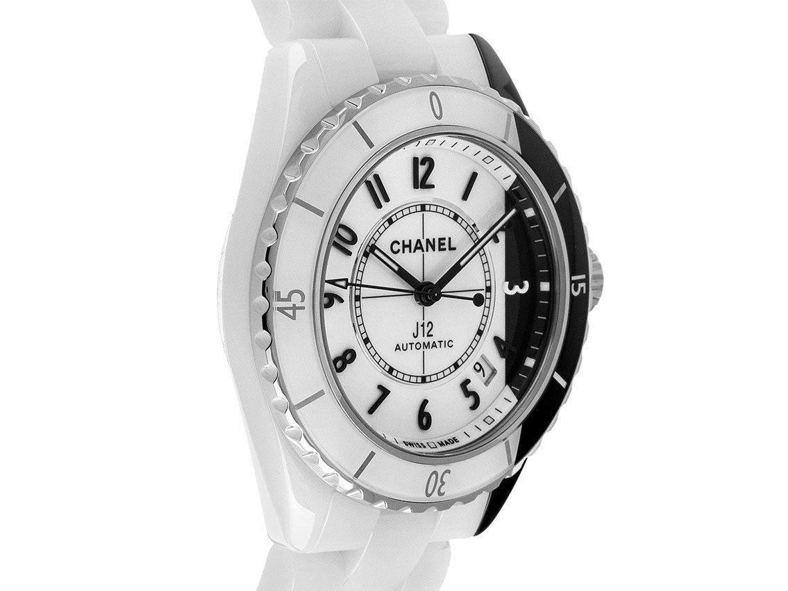 Chanel J12 Paradox Keramik Stahl Automatik Armband Keramik FaltschließeGehäuse Keramik weiß / schwarz, Gehäusedurchmesser ohne Krone 38mm, Gehäusehöhe 12,8mm. Lünette Edelstahl mit weiß / schwarzem Keramik Inlay und 60-Minuten Skala. Armband Keramik weiß, verdeckte Doppelfaltschließe Edelstahl. Zifferblatt Keramik weiß / schwarz mit aufgesetzten schwarzen arabischen Ziffern und weißer "3" sowie schwarzen Leuchtzeigern. Uhrwerk Automatik, Kaliber 12.1 mit 28 Edelsteinen, Gangreserve ca. 70 Stunden. Anzeige von Stunde, Minute und Sekunde über Zeiger aus der Mitte mit Sekundenstopp zur sekundengenauen Einstellung der Uhrzeit, Datumsanzeige mit Schnellverstellung zwischen 4 und 5 Uhr. Saphirglas kratzfest. Krone verschraubbar mit Flankenschutz und schwarzer Keramik Einlage. Boden Edelstahl 4-fach verschraubt und graviert mit Saphirglas Sichtfenster. Gewicht der Uhr inklusive Armband 136g, Länge des Armbandes inklusive Gehäuse 170mm. Wasserdicht bis 5 ATM. Referenznummer: H6515, ID: ST1160138221024H-10100, Artikelnummer: 10000076653. Original Chanel Box mit Umkarton und Garantie Papiere von September 2024 sowie Beschreibung, Full Set. Ungetragen. Lieferzeit sofort.