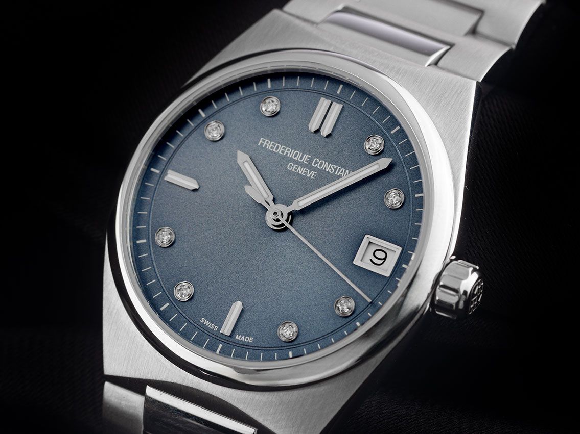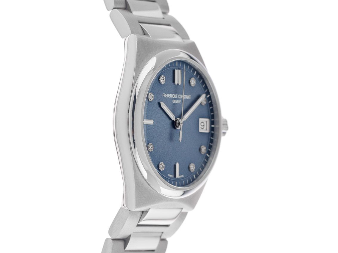 Frederique Constant Highlife Ladies Stahl Diamanten Quarz Armband StahlGehäuse Edelstahl poliert und satiniert, Gehäusedurchmesser ohne Krone 31mm, Gehäusehöhe 8,2mm. Lünette Edelstahl glatt und poliert. Armband Edelstahl poliert und satiniert, verdeckte Doppelfaltschließe Edelstahl mit Hersteller-Logo. Zifferblatt blau mit aufgesetzten Leuchtindexen und 8 Diamantindexen, zusammen ca. 0,04ct W / VSI (Weiß mit sehr kleinen Einschlüssen) sowie Edelstahl Leuchtzeigern. Uhrwerk quarzgesteuert Kaliber Ronda 515.SW. Anzeige von Stunde, Minute und Sekunde über Zeiger aus der Mitte mit Sekundenstopp zur sekundengenauen Einstellung der Uhrzeit, Datumsanzeige mit Schnellverstellung bei 3 Uhr. Saphirglas kratzfest und gewölbt. Krone mit Hersteller-Logo. Boden Edelstahl 4-fach verschraubt und graviert. Gewicht der Uhr inklusive Armband 77g, Länge des Armbandes inklusive Gehäuse 180mm. Wasserdicht bis 5 ATM. Referenznummer: FC-240LND2NH26B, ID: ST254611961024H-1250, Artikelnummer: 10000076674. Original Frederique Constant Box und Garantie Papiere sowie Wechselarmband Kautschuk, Full Set. Neu. Lieferzeit sofort.