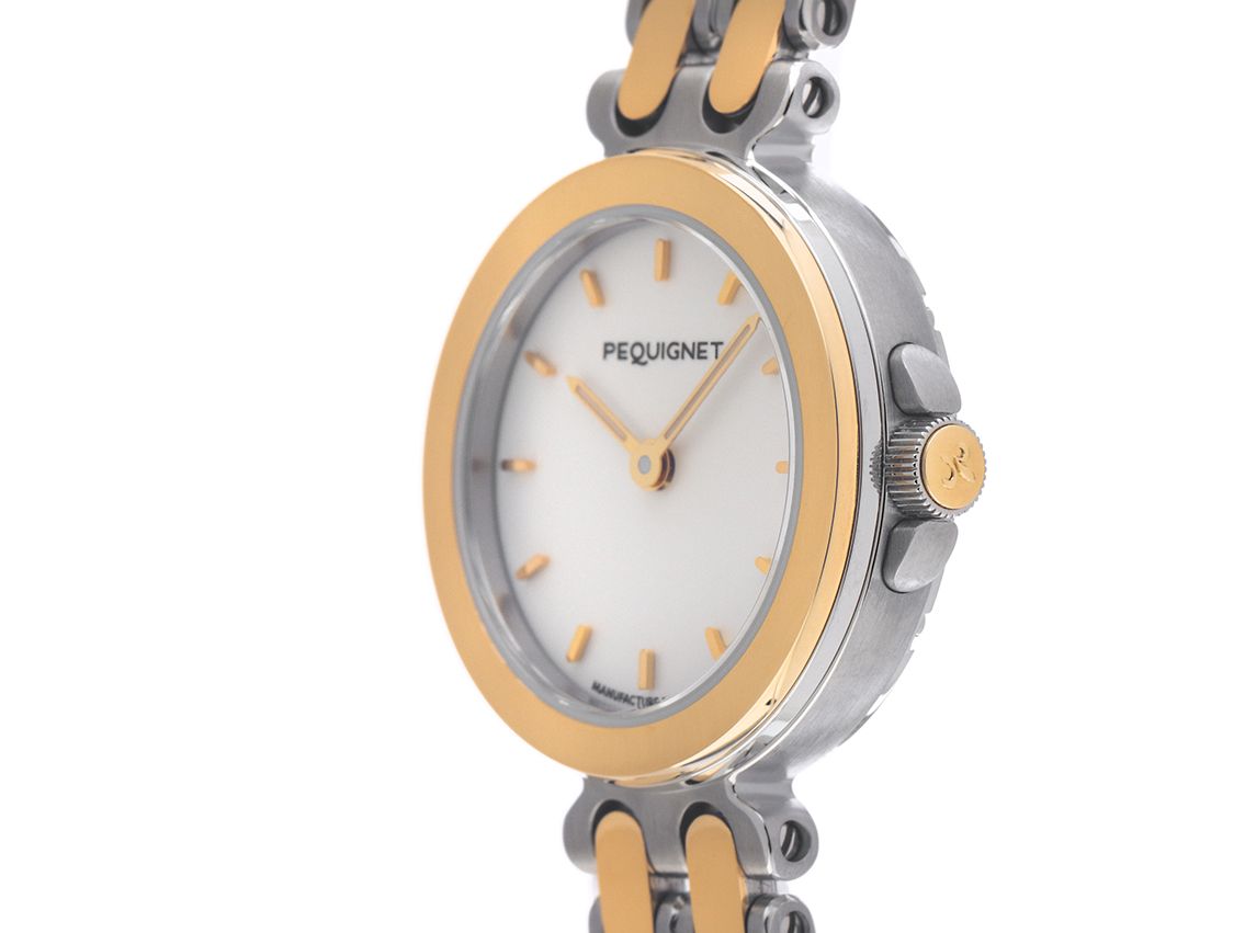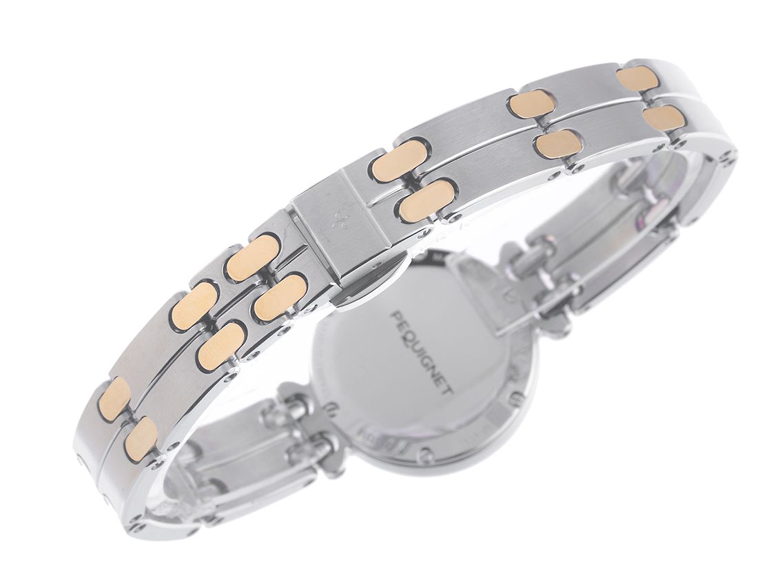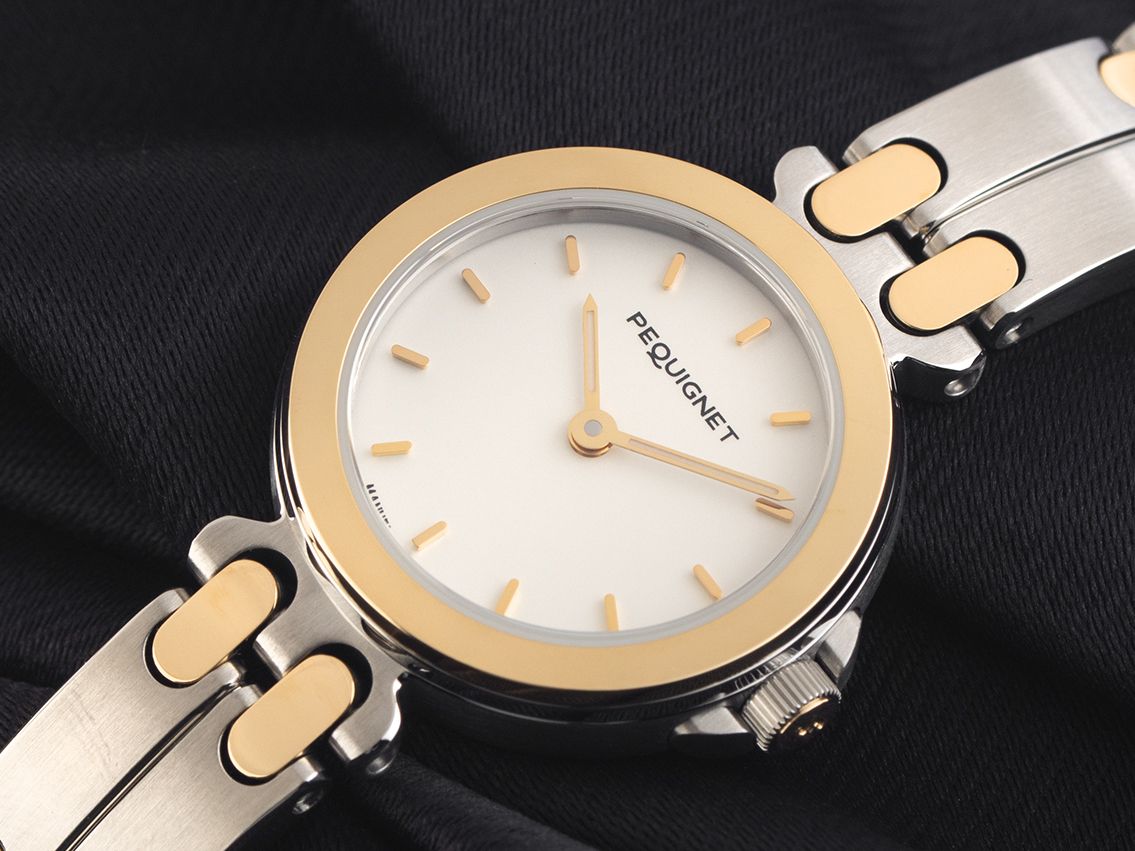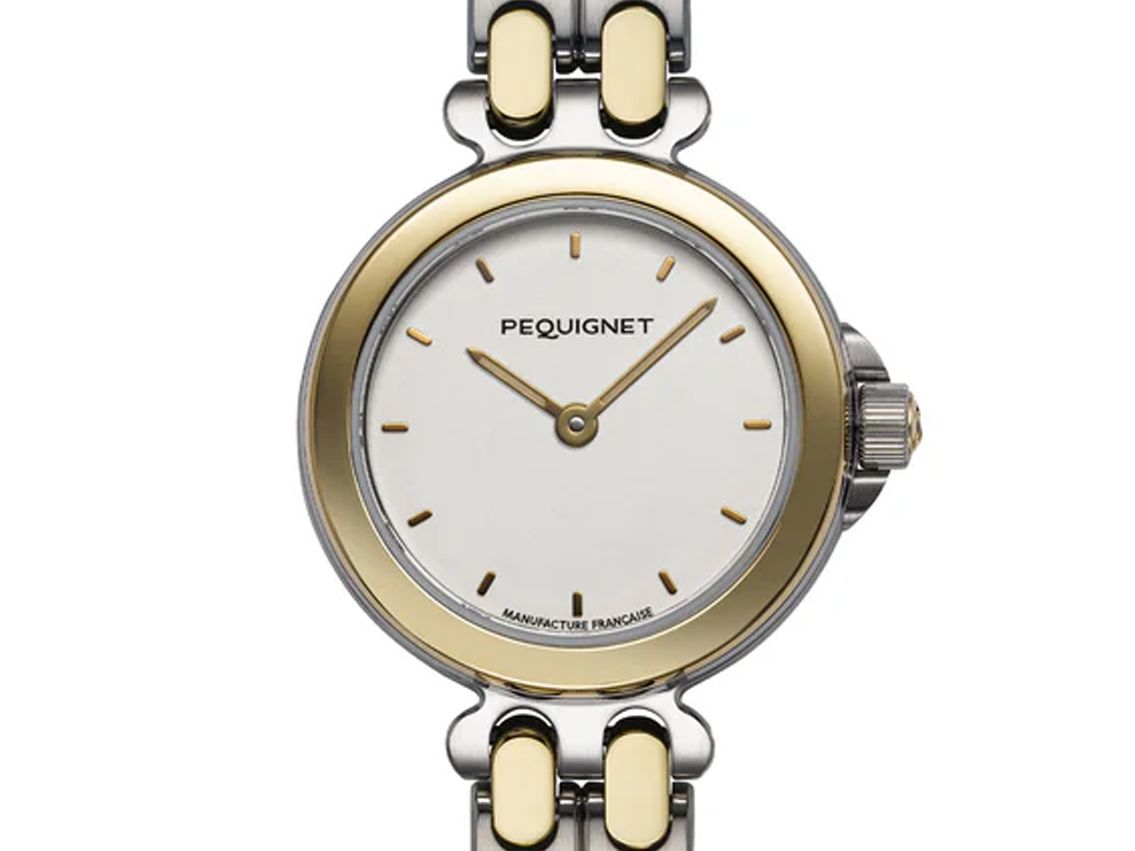 Pequignet Moorea Stahl 18kt Gelbgold Quarz Armband Stahl 18kt GelbgoldGehäuse Edelstahl poliert und satiniert, Gehäusedurchmesser ohne Krone 32mm, Gehäusehöhe 6,2mm. Lünette 18kt Gelbgold vergoldet, glatt und poliert. Armband Edelstahl / 18kt Gelbgold vergoldet, poliert und satiniert, verdeckte Doppelsicherheitsfaltschließe Edelstahl mit Hersteller-Logo. Zifferblatt opalweiß mit aufgesetzten gelbgoldenen Indexen und gelbgoldenen Leuchtzeigern. Uhrwerk quarzgesteuert, Calibre ETA E61.031. Anzeige von Stunde und Minute über Zeiger aus der Mitte. Saphirglas kratzfest. Krone mit Flankenschutz und Hersteller-Logo. Boden Edelstahl 6-fach verschraubt und graviert. Gewicht der Uhr inklusive Armband 58g, Länge des Armbandes inklusive Gehäuse 175mm. Wasserdicht bis 10 ATM. Referenznummer: 7851318, Gehäusenummer: 0XXX, ID: ST506427501024H-2750, Artikelnummer: 10000076688. Original Pequignet Box mit Umkarton und Garantie Papiere sowie Beschreibung, Full Set. Neu. Neuheit. Lieferzeit sofort.