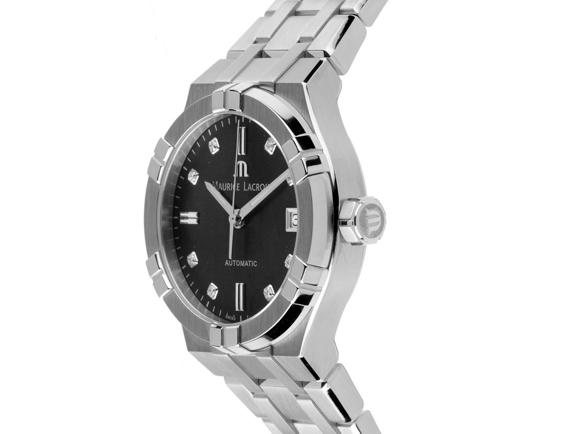 Gehäuse Edelstahl, poliert und satiniert, Gehäusedurchmesser ohne Krone 35mm, Gehäusehöhe 11,0mm, Lünette Edelstahl satiniert mit polierten Reitern. Brazalete de Edelstahl pulido y satinado, con doble bolsillo de seguridad de Edelstahl con el logotipo del fabricante. Zifferblatt Perlmutt schwarz mit 8 aufgesetzten Diamantindexen und polierten Leuchtzeigern. Reloj automático, calibre Maurice Lacroix ML115 con 26 agujas, autonomía aprox. 38 horas. Anzeige von Stunde, Minute und Sekunde über Zeiger aus der Mitte mit Sekundenstopp zur sekundengenauen Einstellung der Uhrzeit, Datumsanzeige mit Schnellverstellung bei 3 Uhr. Saphirglas kratzfest. Cristal negro con logotipo del fabricante. Cuerpo de Edelstahl de 7 pulgadas, recubierto de fibra de vidrio. Gewicht der Uhr inklusive Armband 129g, Länge des Armbandes inkl. Funda 185mm. Consumo de agua hasta 20 ATM. Número de referencia: AI6006-SS002-370-1, ID: ST197526780225H-2350, Artikelnummer: 10000078781. Caja original Maurice Lacroix con estuche y papel de garantía, juego completo. Nuevo. Lieferzeit sofort.