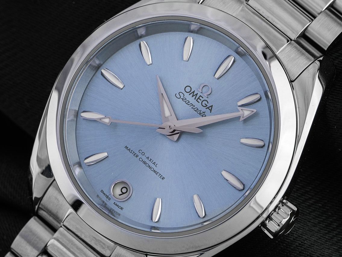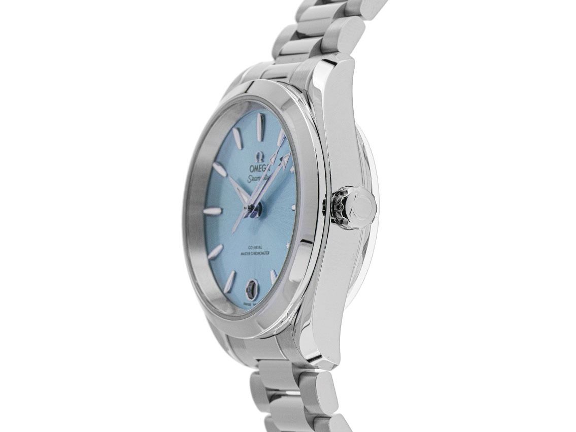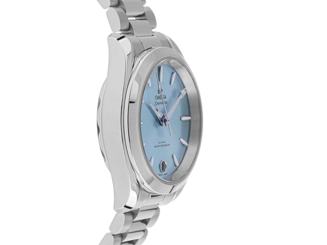 Omega Seamaster Aqua Terra Shades Co-Axial Master Chronometer Stahl Automatik Armband StahlGehäuse Edelstahl poliert und satiniert, Gehäusedurchmesser ohne Krone 34mm, Gehäusehöhe 11,9mm. Lünette Edelstahl glatt und poliert. Armband Edelstahl poliert und satiniert, verdeckte Doppelsicherheitsfaltschließe Edelstahl mit Hersteller-Logo. Zifferblatt hellblau mit aufgesetzten weißgoldenen Leuchtindexen und weißgoldenen Leuchtzeigern. Uhrwerk Automatik, Chronometer mit Zeugnis, Omega Manufakturkaliber 8800 mit 35 Edelsteinen, Gangreserve ca. 55 Stunden. Anzeige von Stunde, Minute und Sekunde über Zeiger aus der Mitte mit Sekundenstopp zur sekundengenauen Einstellung der Uhrzeit, Datumsanzeige mit Schnellverstellung bei 6 Uhr. Saphirglas kratzfest, gewölbt und beidseitig entspiegelt. Krone mit Hersteller-Logo. Boden Edelstahl verschraubt und graviert mit Saphirglas Sichtfenster. Gewicht der Uhr inklusive Armband 101g, Länge des Armbandes inklusive Gehäuse 165mm. Wasserdicht bis 15 ATM. Referenznummer: 220.10.34.20.03.002, ID: ST512285940325RE-7200, Artikelnummer: 10000079270. Original Omega Box mit Umkarton und Garantie Papiere von 2025, Full Set. Ungetragen. Lieferzeit sofort.
