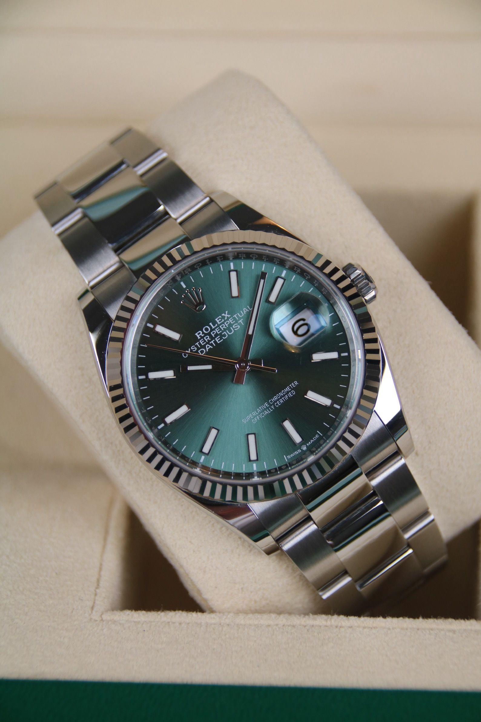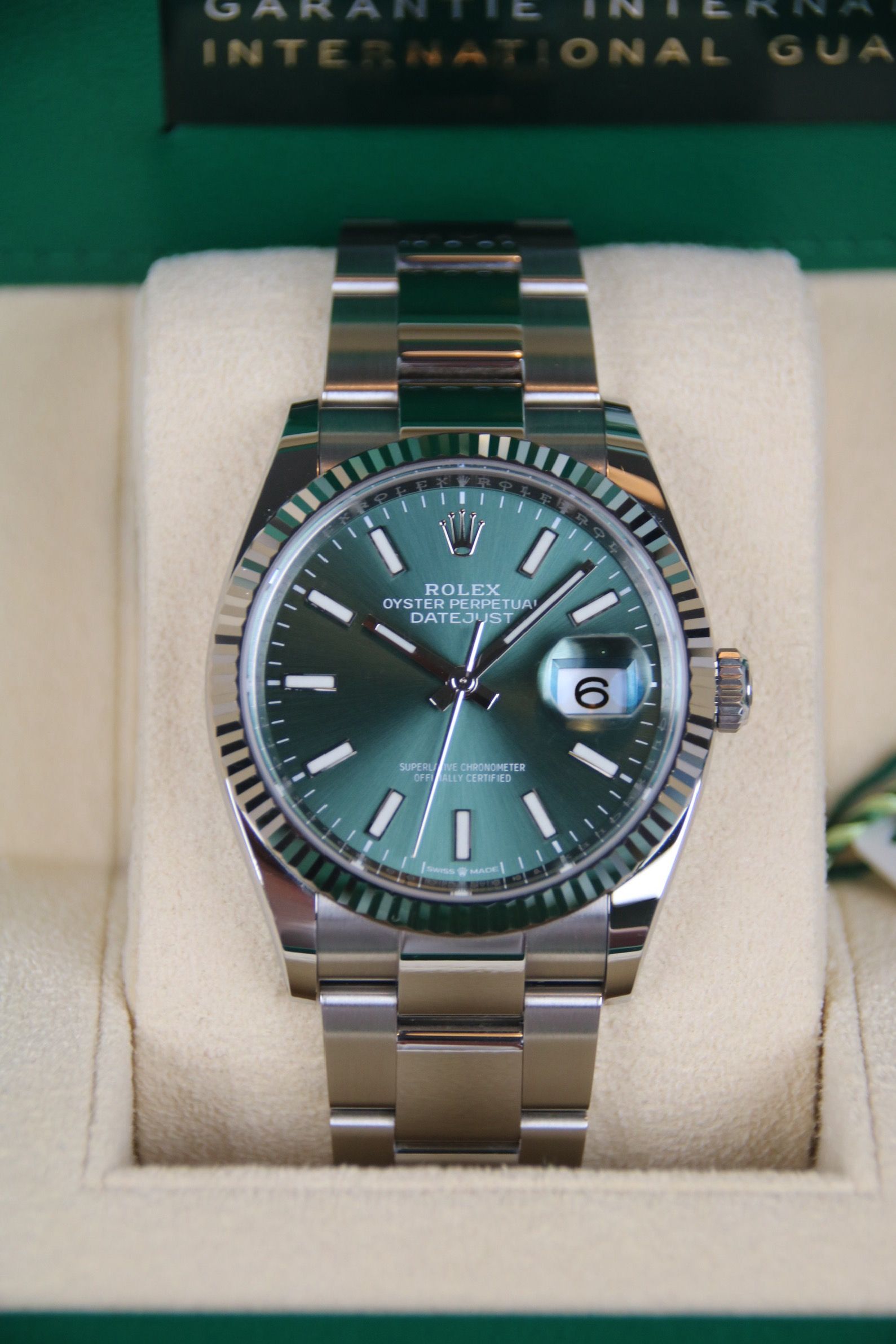 For sale is a Datejust 36 with mint green dial. The watch is in perfect mint condition, only worn a few times by its previous owner. This watch was purchased at the authorized retailer in 2024, Rolex warranty until January 2029! Comes as full set including box, papers, white tag etc.Please contact us in case of any questions.