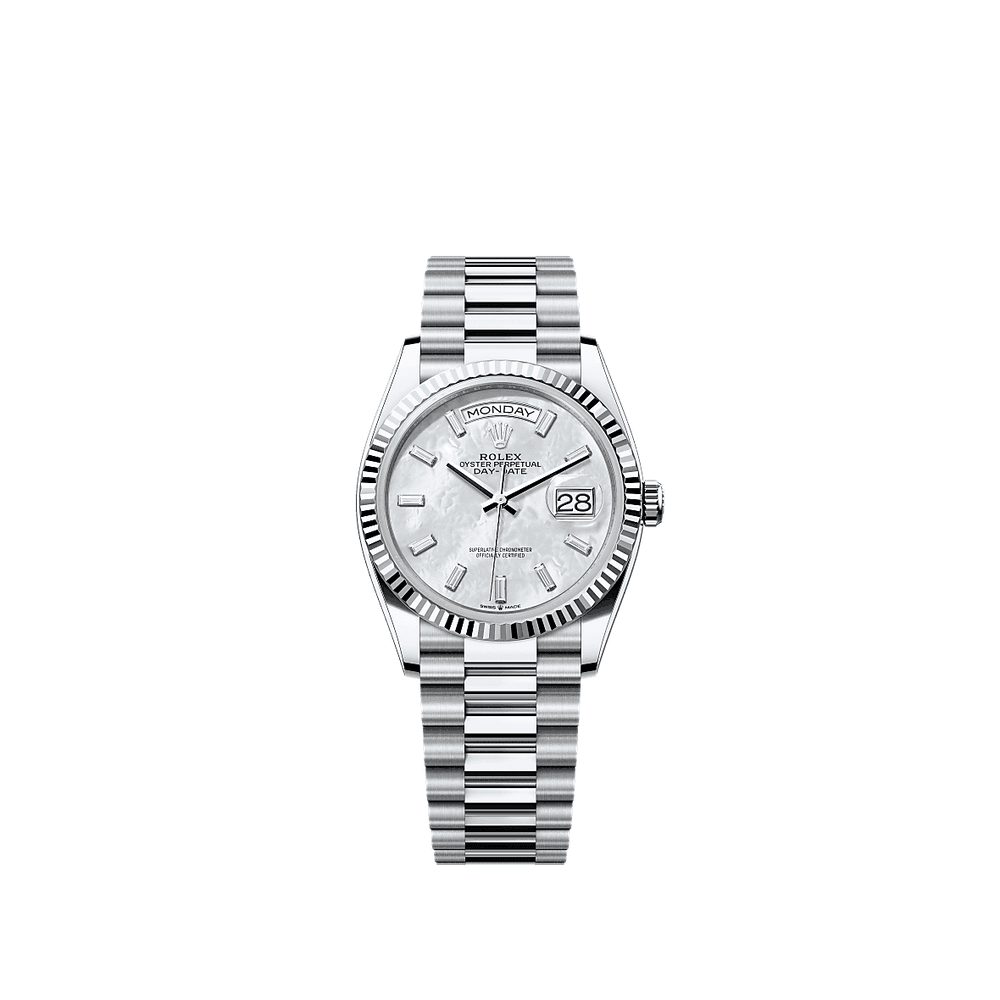 Rolex Day-Date 36 Rolex 128236-0021 - Day-Date 36 Platinum - Fluted / MOP - Baguette / President