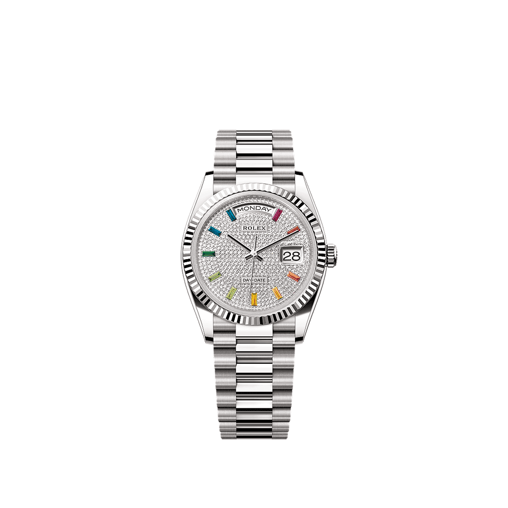 Rolex 128239-0019 Day-Date 36 Oro blanco / estriado / pavé-arco iris / President