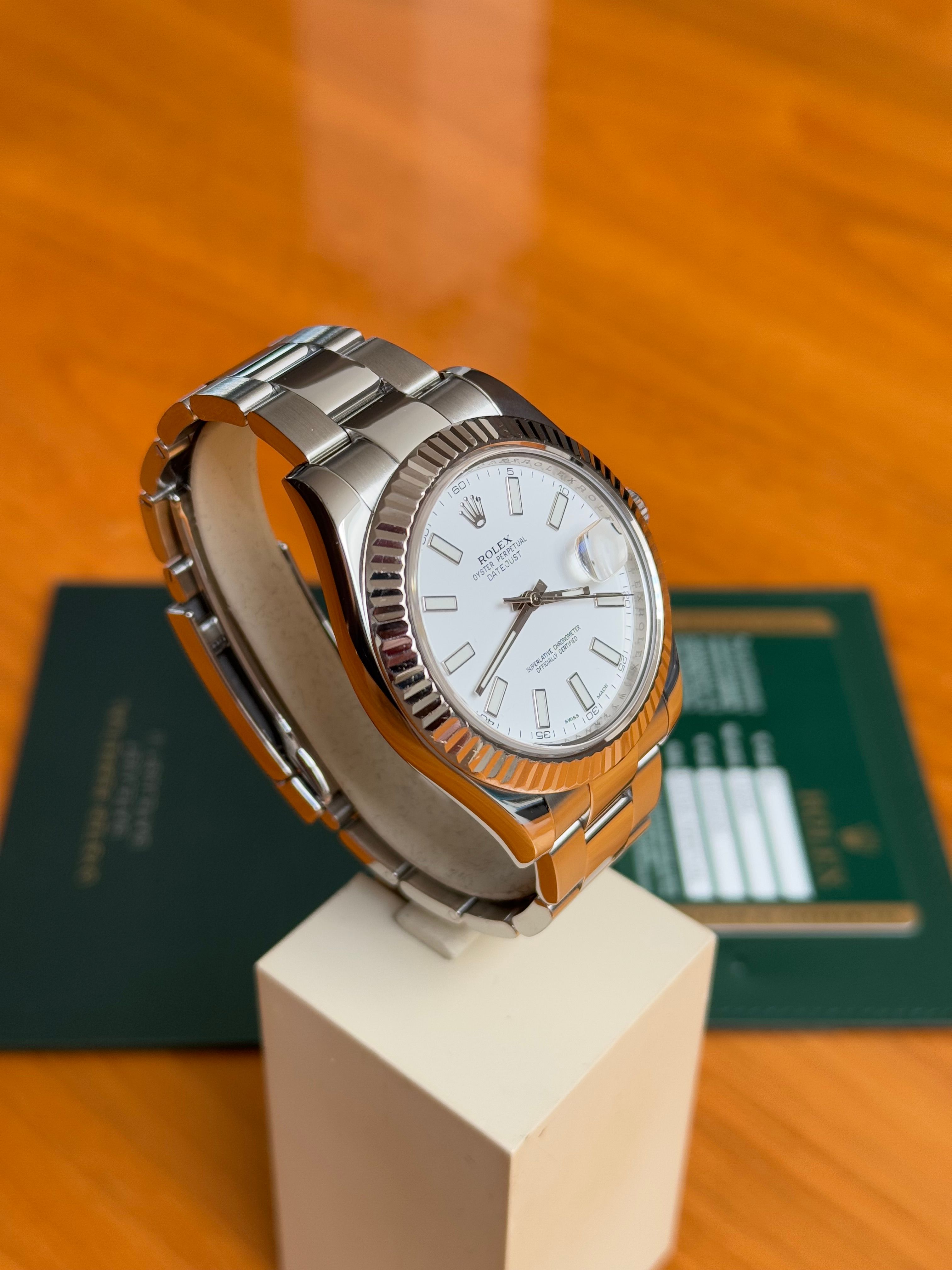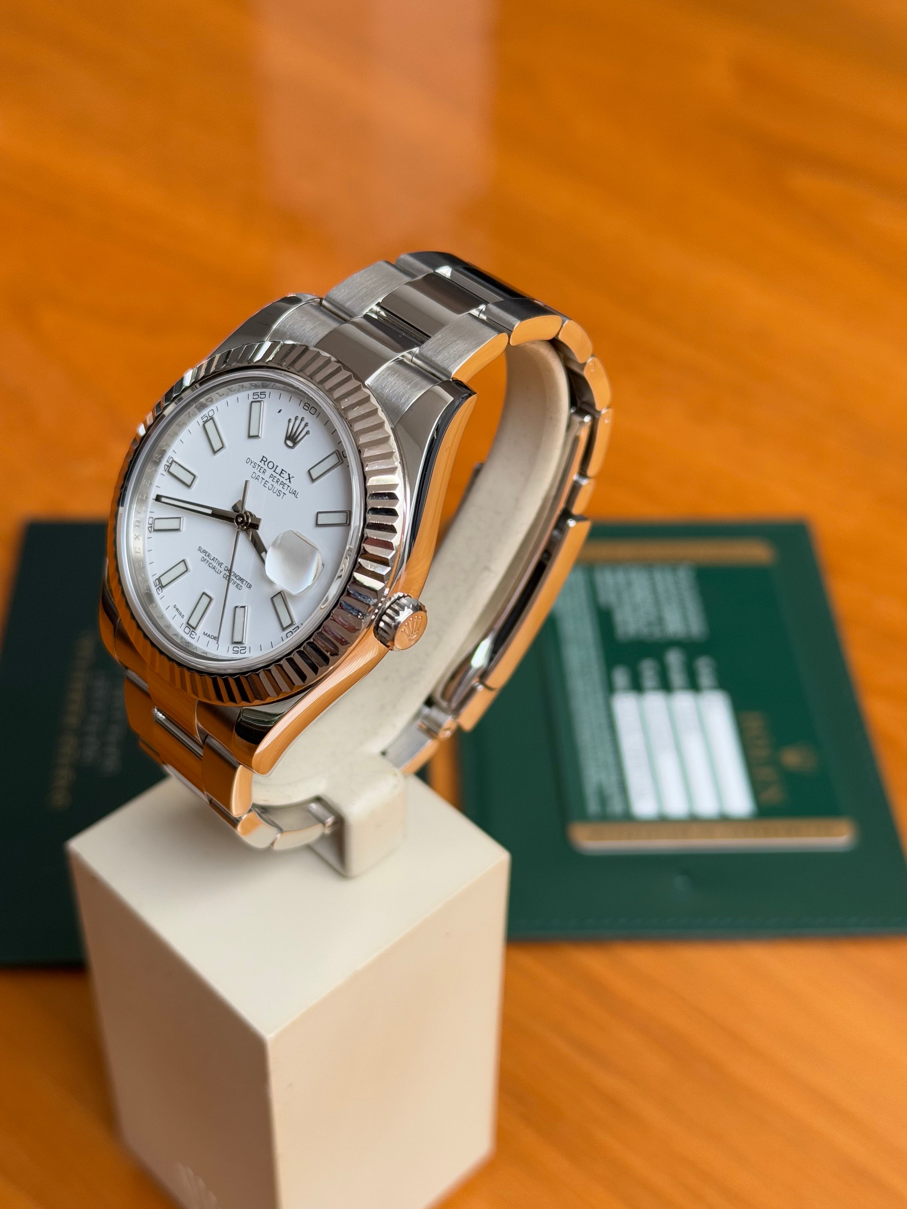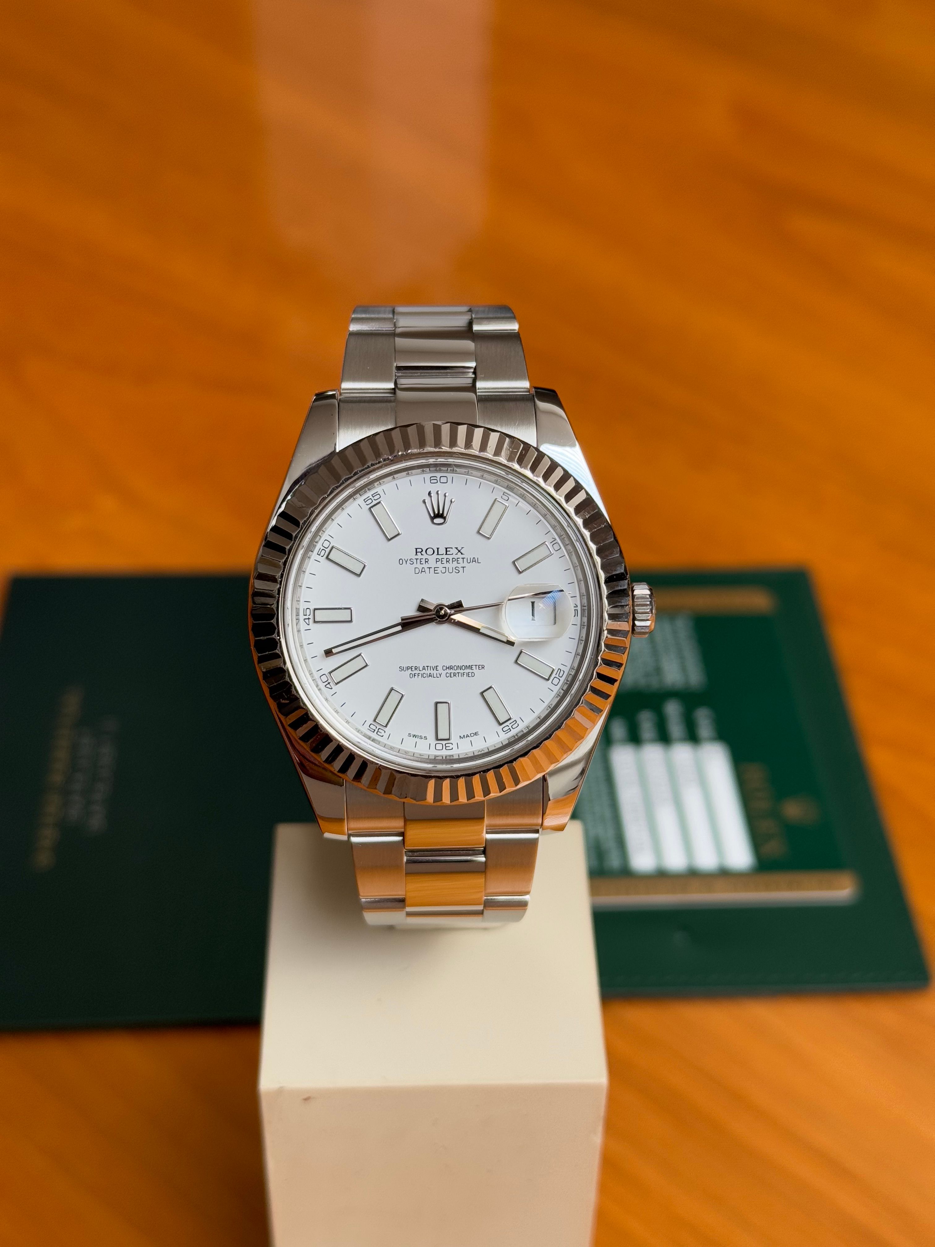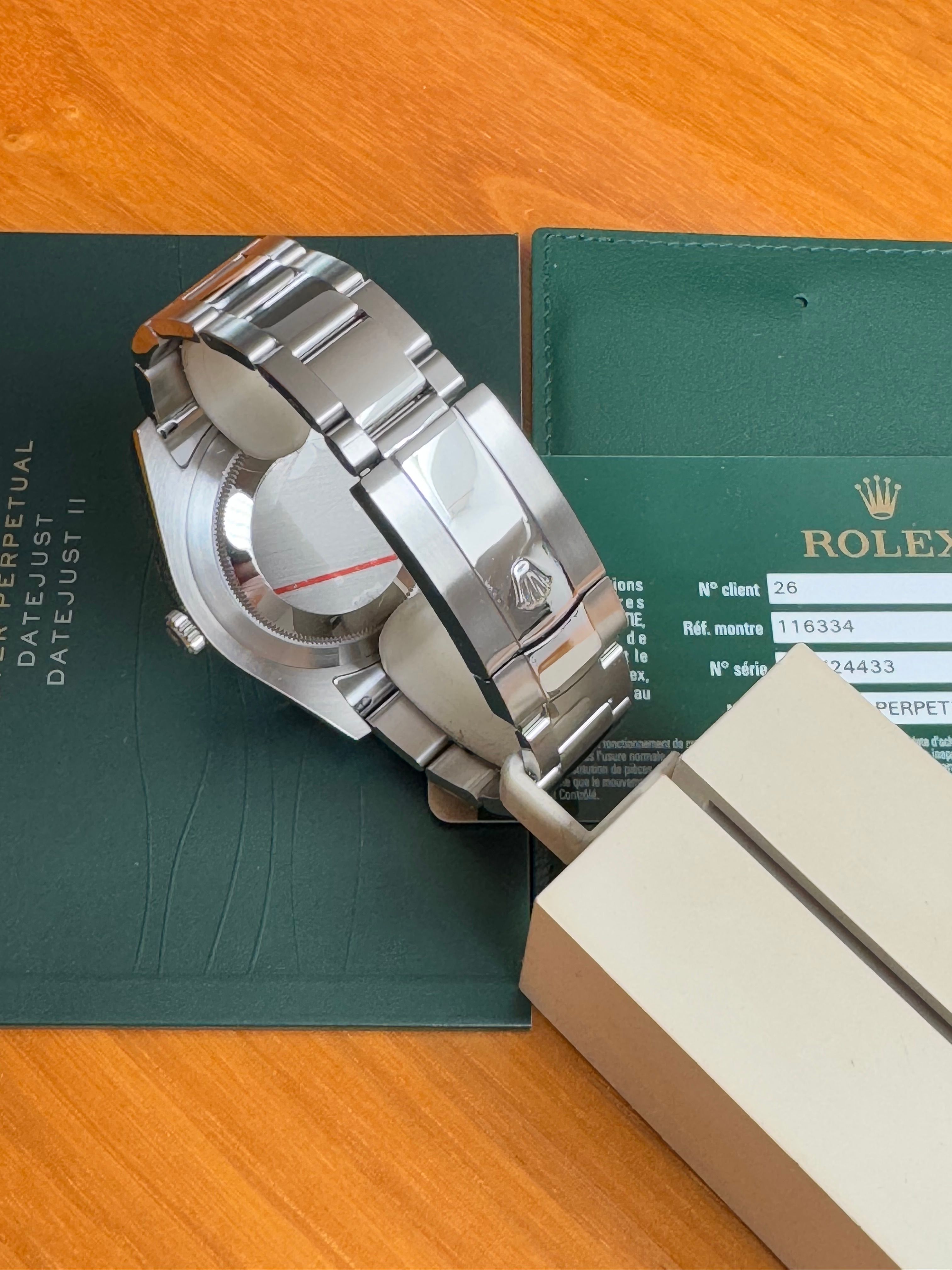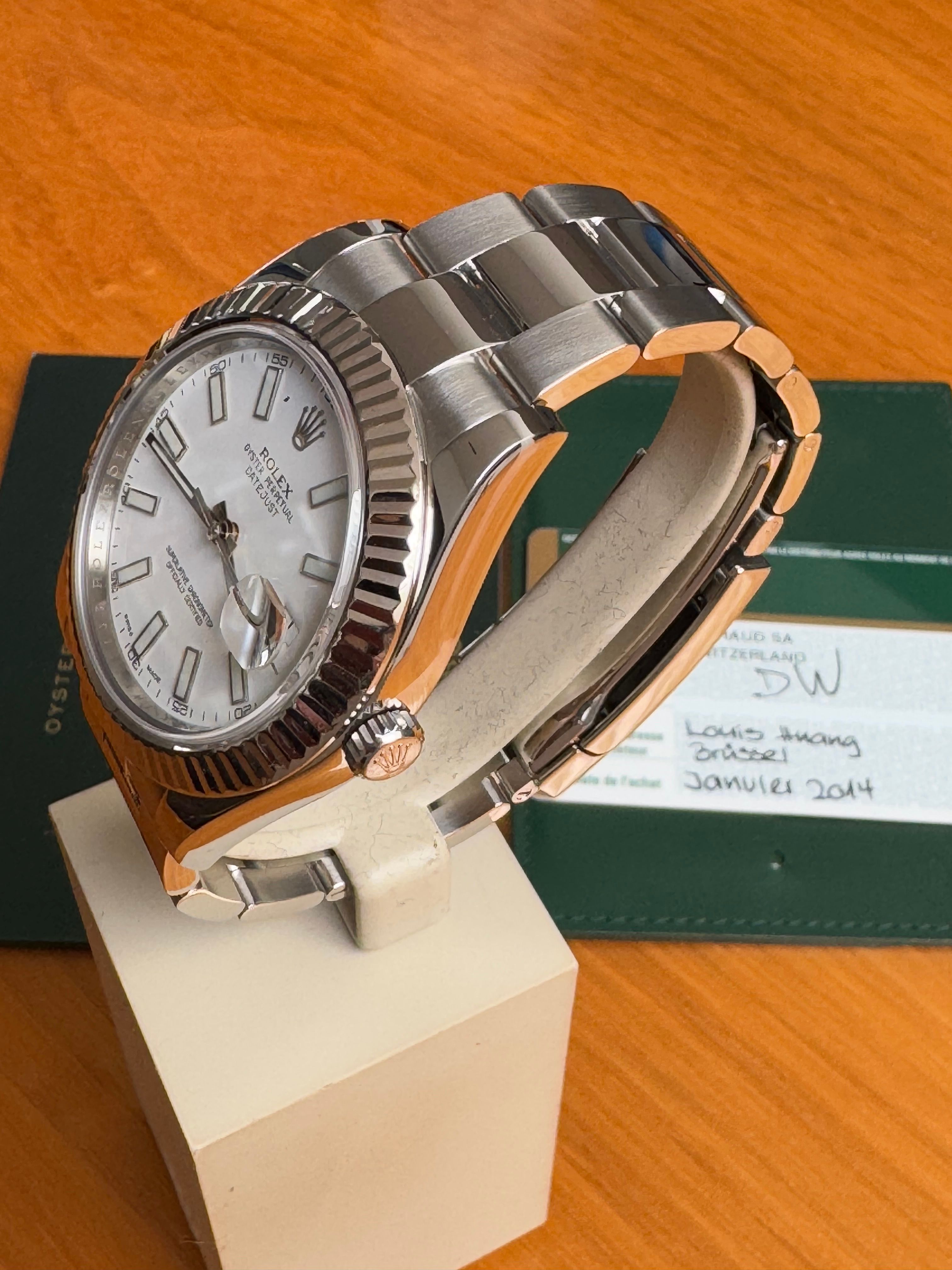 Discontinued Rolex Datejust II with white dial, Oysterbracelet and white golden bezel. Watch is in very nice condition, polished for the sale and not worn since. Comes with the original Rolex guarantee card, stamped in 2014.The watch can be ordered and picked up at Wristler or at Royal Coster Diamonds in Amsterdam (on the Museumplein). Let us know what your preference is so we can make sure the watch is at the correct location.