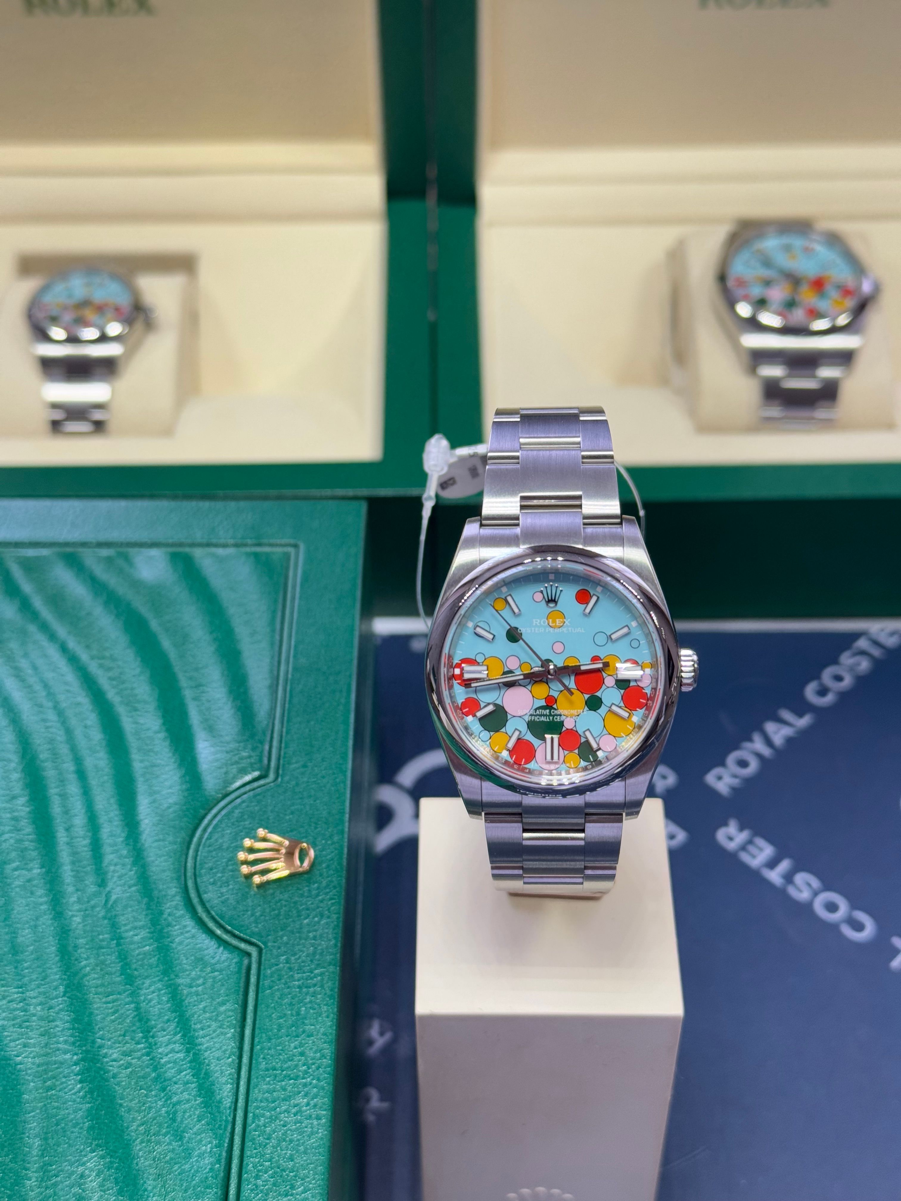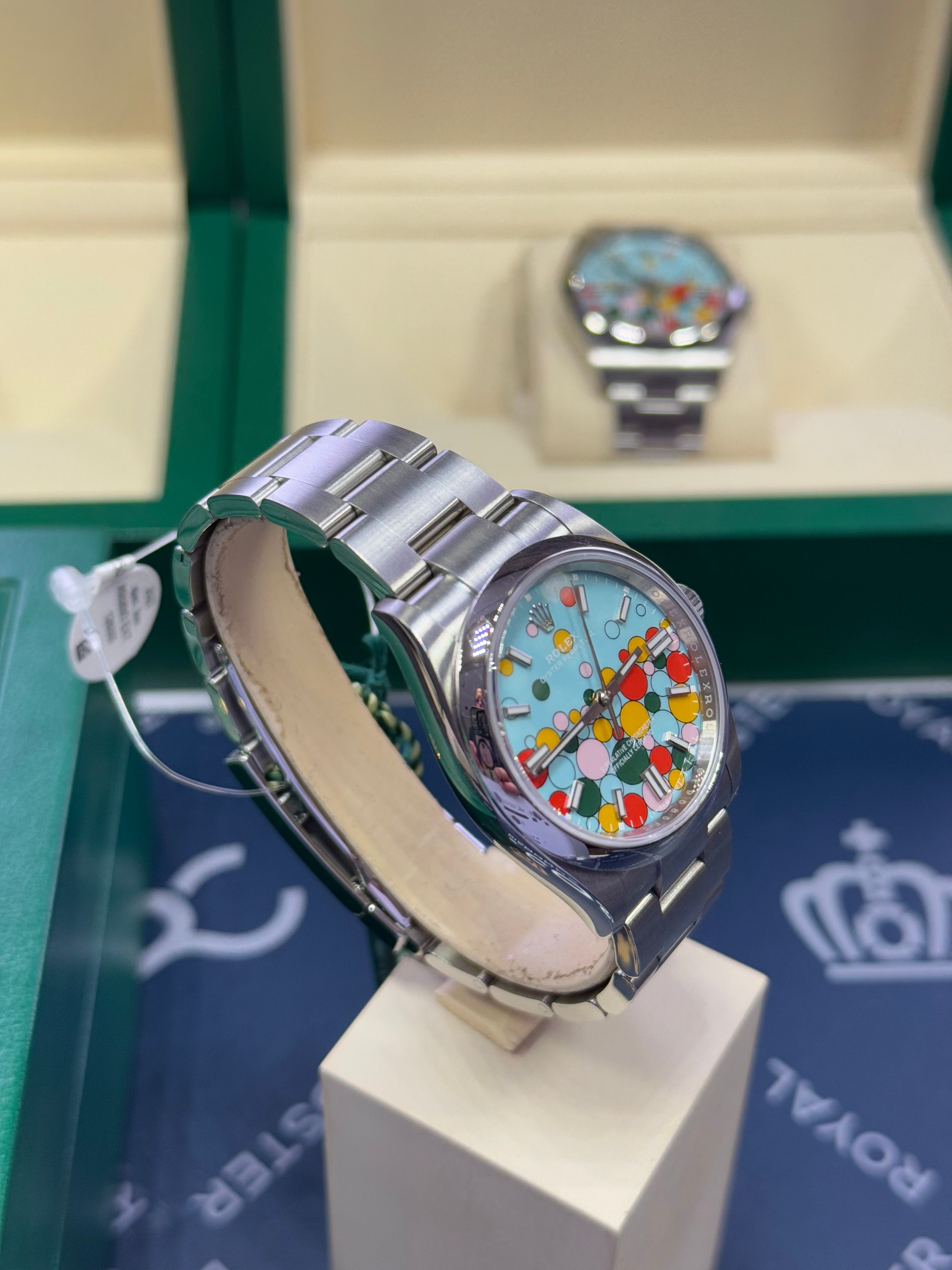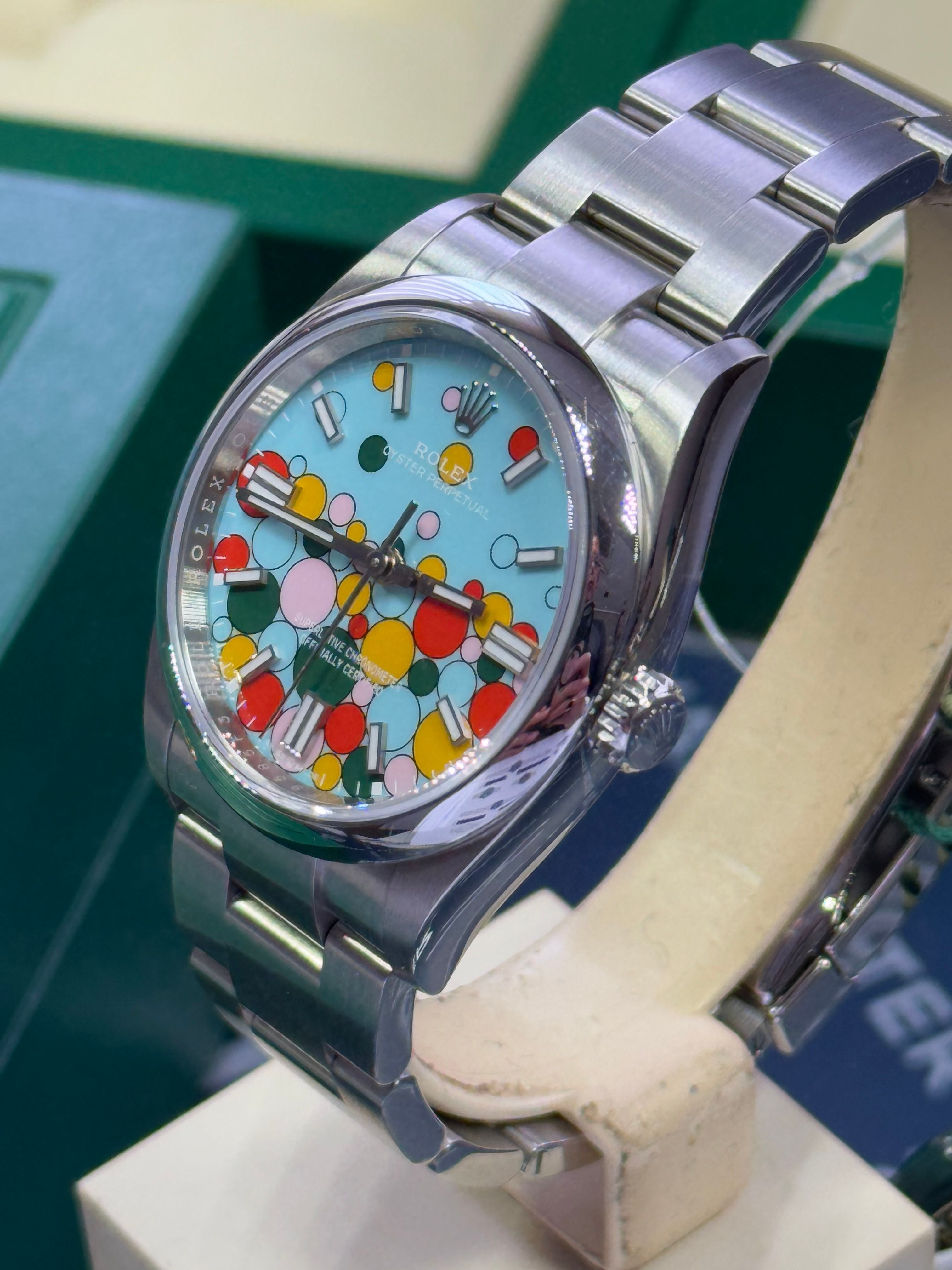 El modelo "Celebrations" OP 126000, que ha sido descontinuado, en 36 mm. Esta esfera tiene todos los colores de esfera que Rolex entregó en los OP hasta la primavera de 2025. Ahora han sido retirados del sitio web de Rolex, y no es posible comprarlos más que en el mercado de segunda mano. Este reloj está prácticamente como nuevo y está completo, y lo ofrecemos al mejor precio en Wristler y en ese otro sitio. La tarjeta de garantía fue sellada en septiembre de 2023.