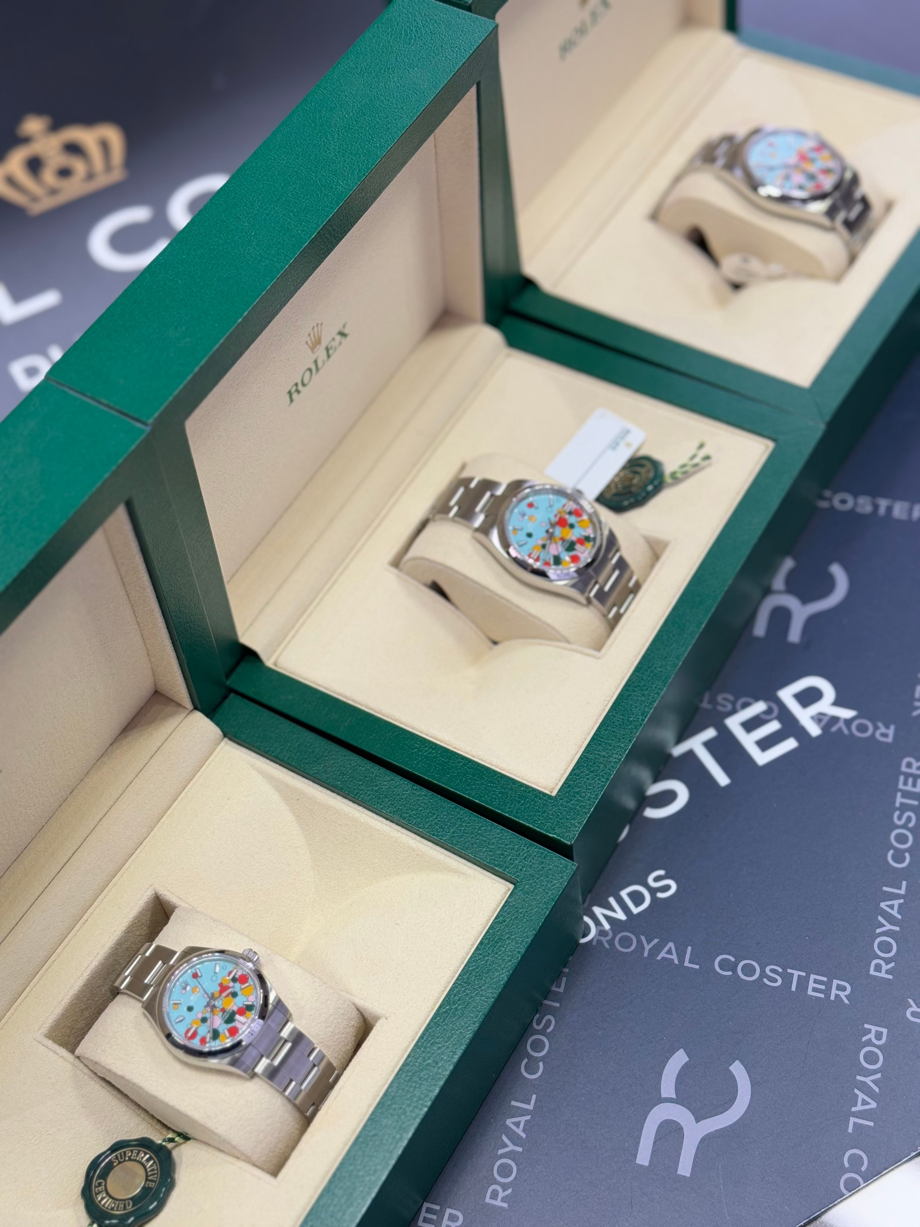 The discontinued "Celebrations" OP 126000 in 36mm. This dial has all the dial colors that Rolex delivered on the OPs until spring 2025. They are now taken of the Rolex website, and it is not possible to purchase anymore other than the second hand market. This watch is basically as good as new and all complete and we offer it for the best price on Wristler and that other site. The guarantee card has been stamped in September of 2023.The watch can be ordered and picked up at Wristler or at Royal Coster Diamonds in Amsterdam (on the Museumplein). Let us know what your preference is so we can make sure the watch is at the correct location.