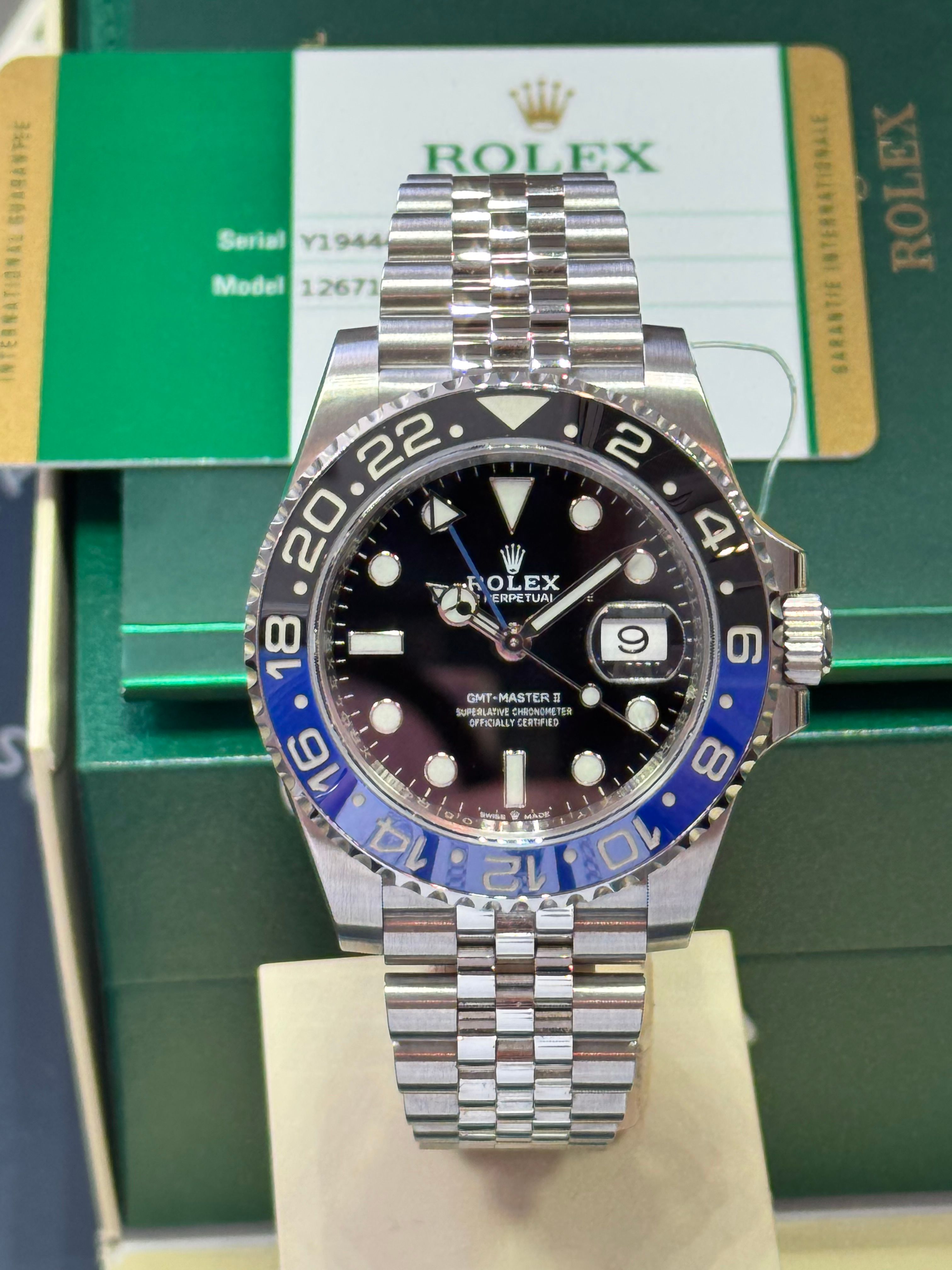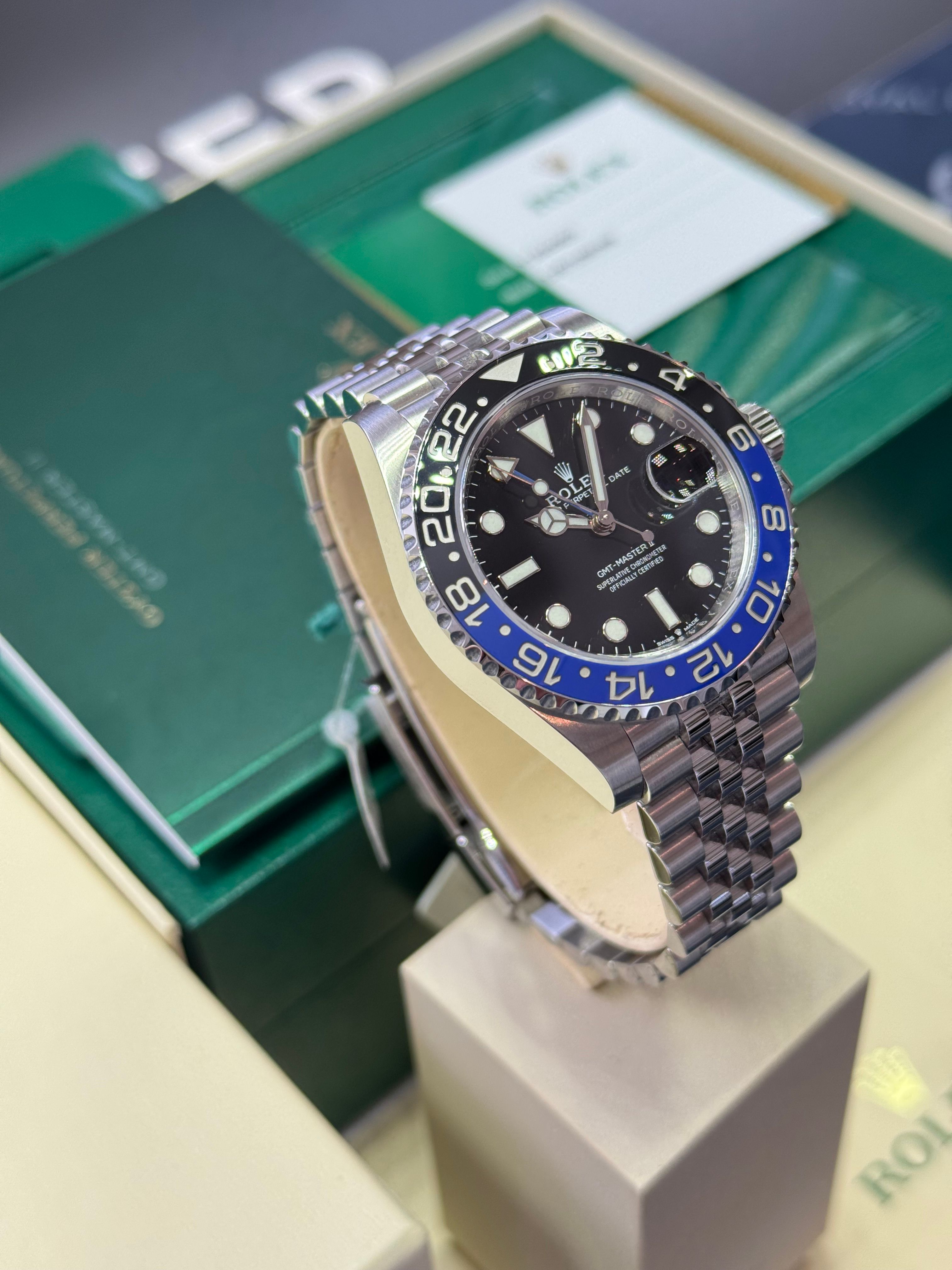 El Rolex GMT Master II 126710BLNR (Bleu Noir) también se conoce como "la Batichica". Con este brazalete Jubilee es una fantástica pieza de joyería y, además, ¡dice la hora! Estampado en 2019, todo completo.