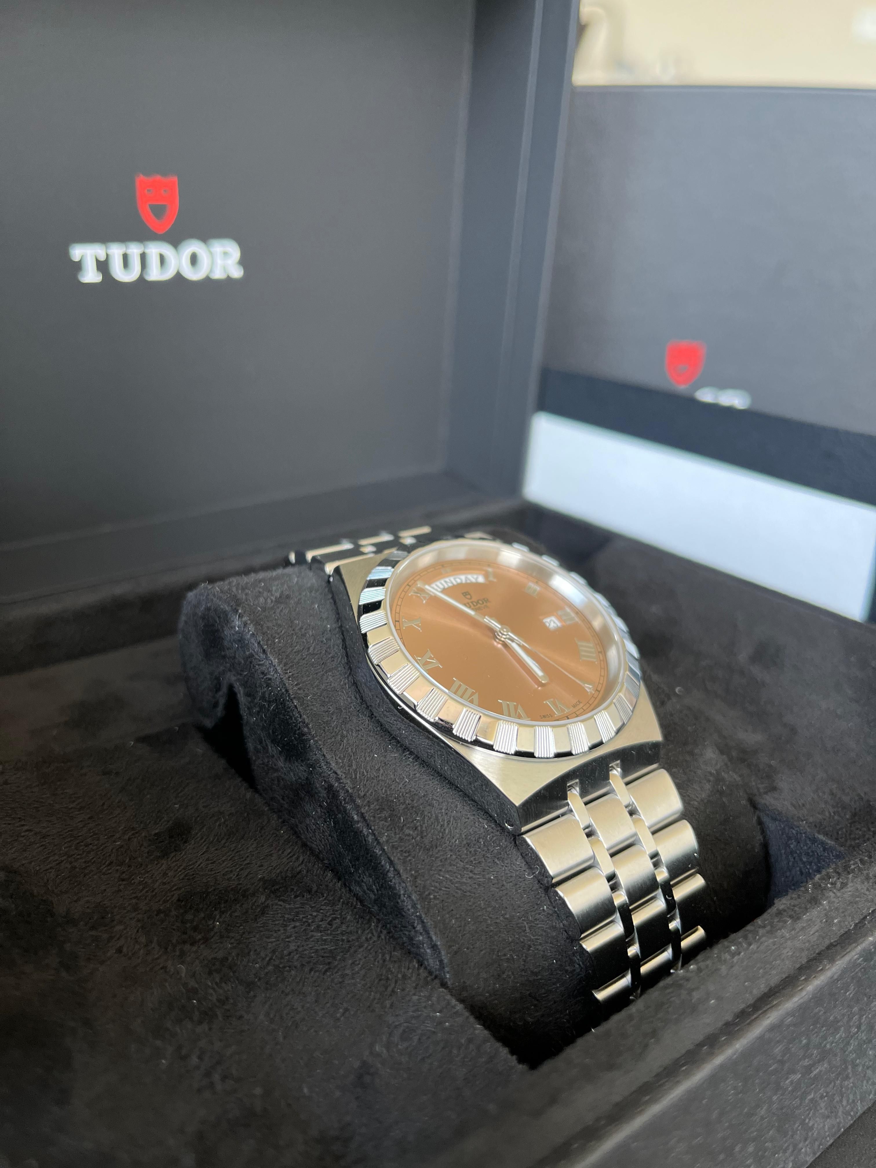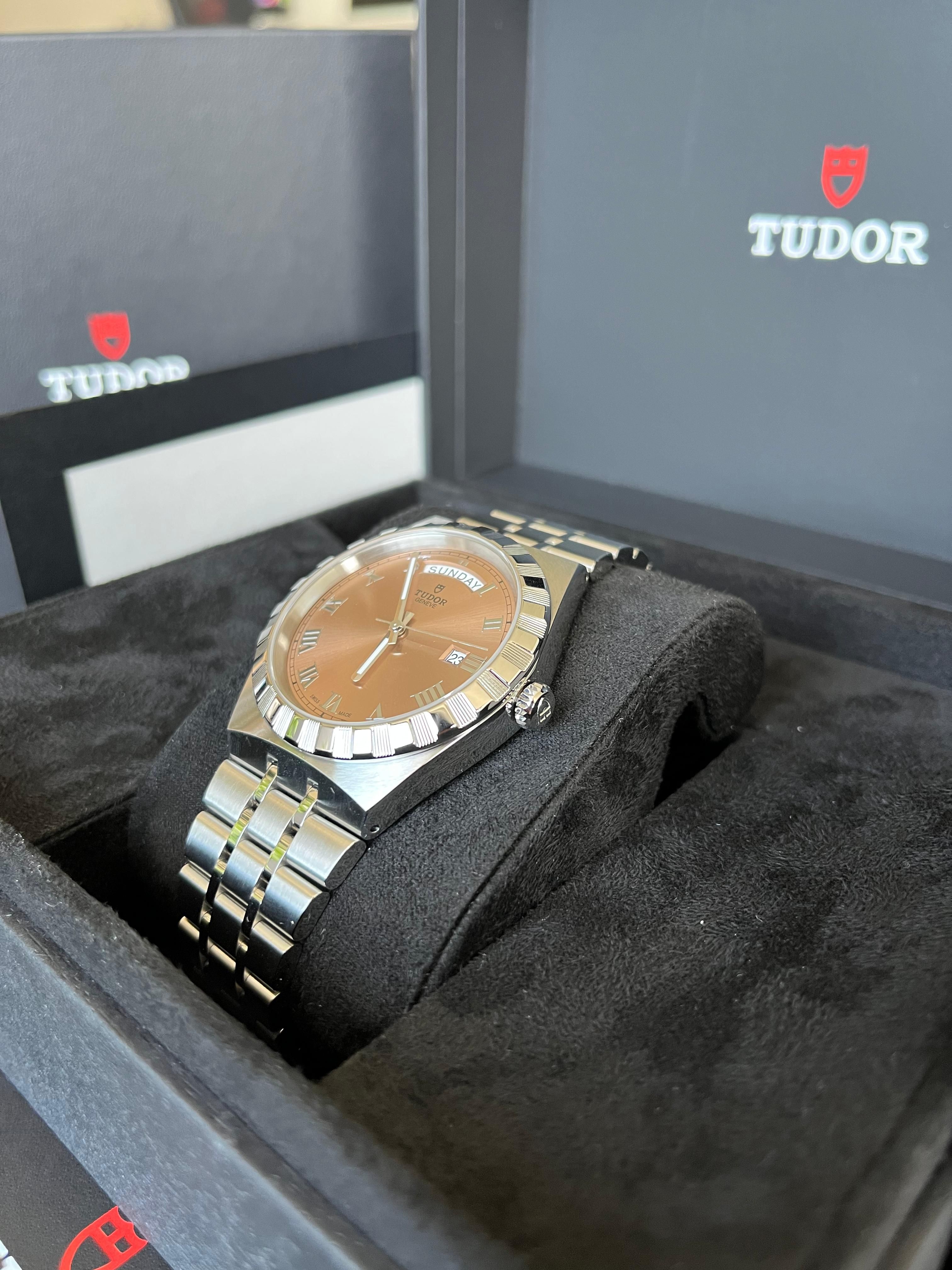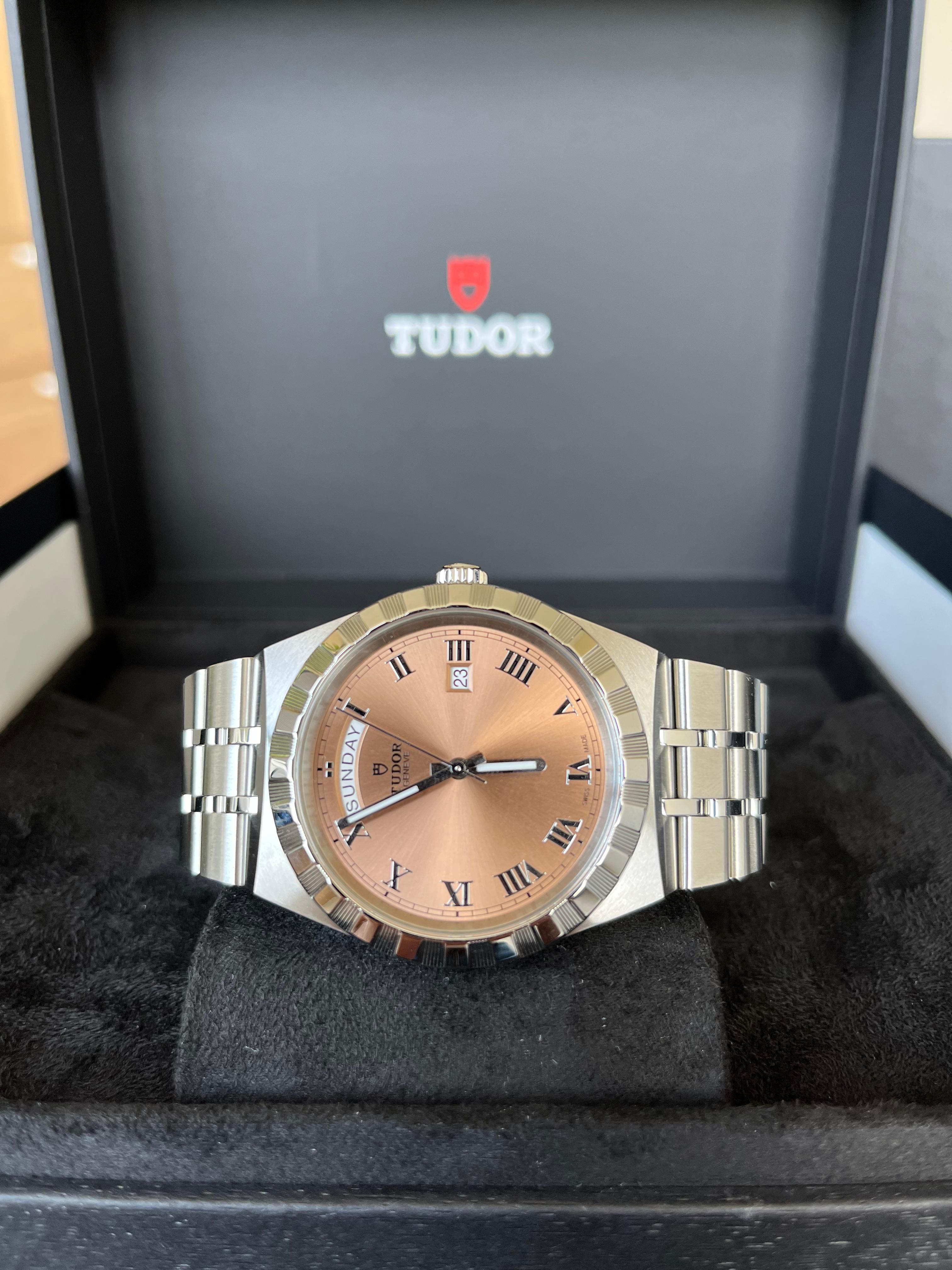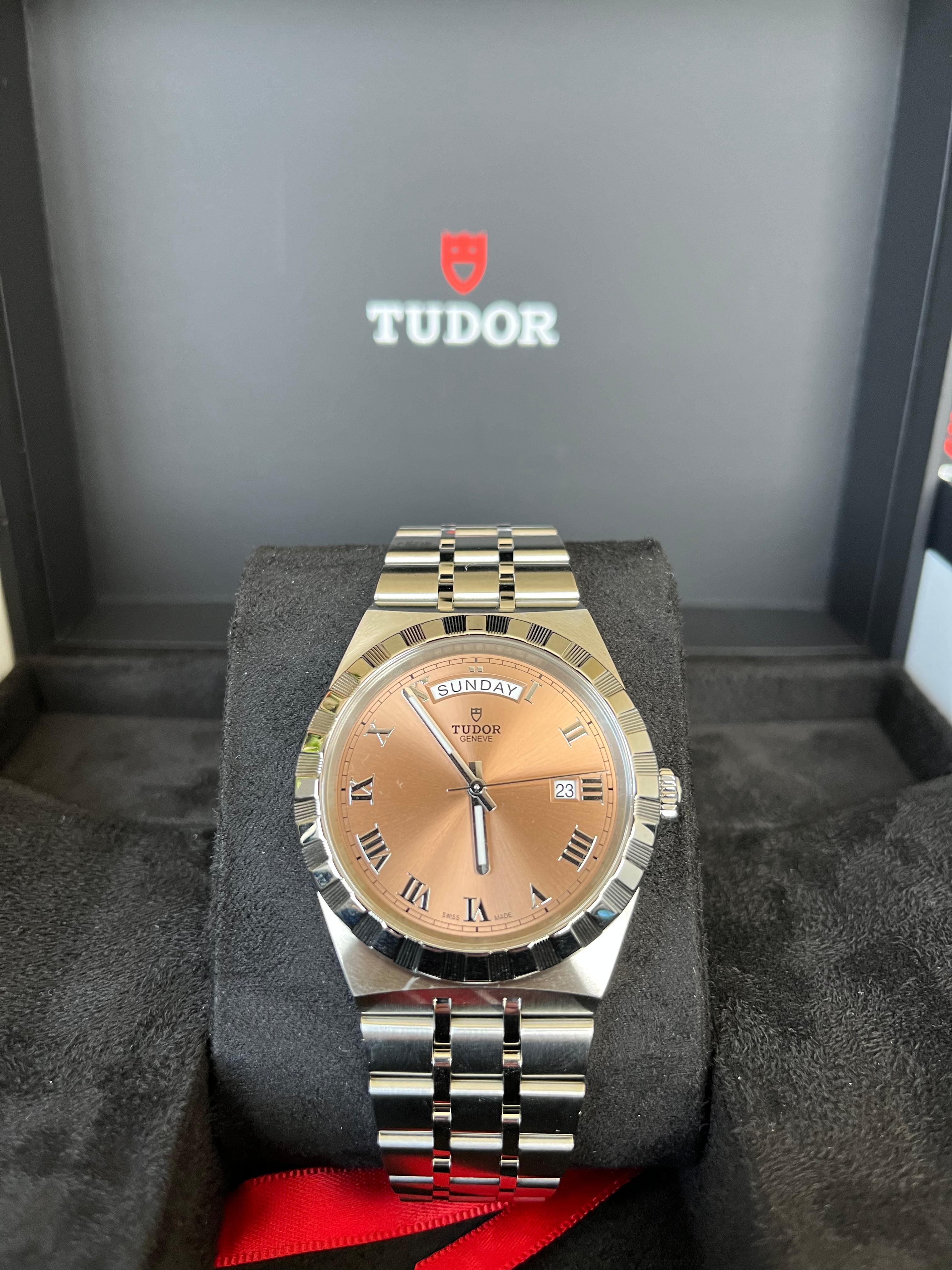 Tudor Royal 41mm – Salmon Dial (M28600)A bold twist on classic elegance. The Tudor Royal M28600 features a striking salmon sunray dial, Roman numerals, and day-date display—all housed in a 41mm steel case with notched bezel. Sporty, refined, unmistakably Tudor.