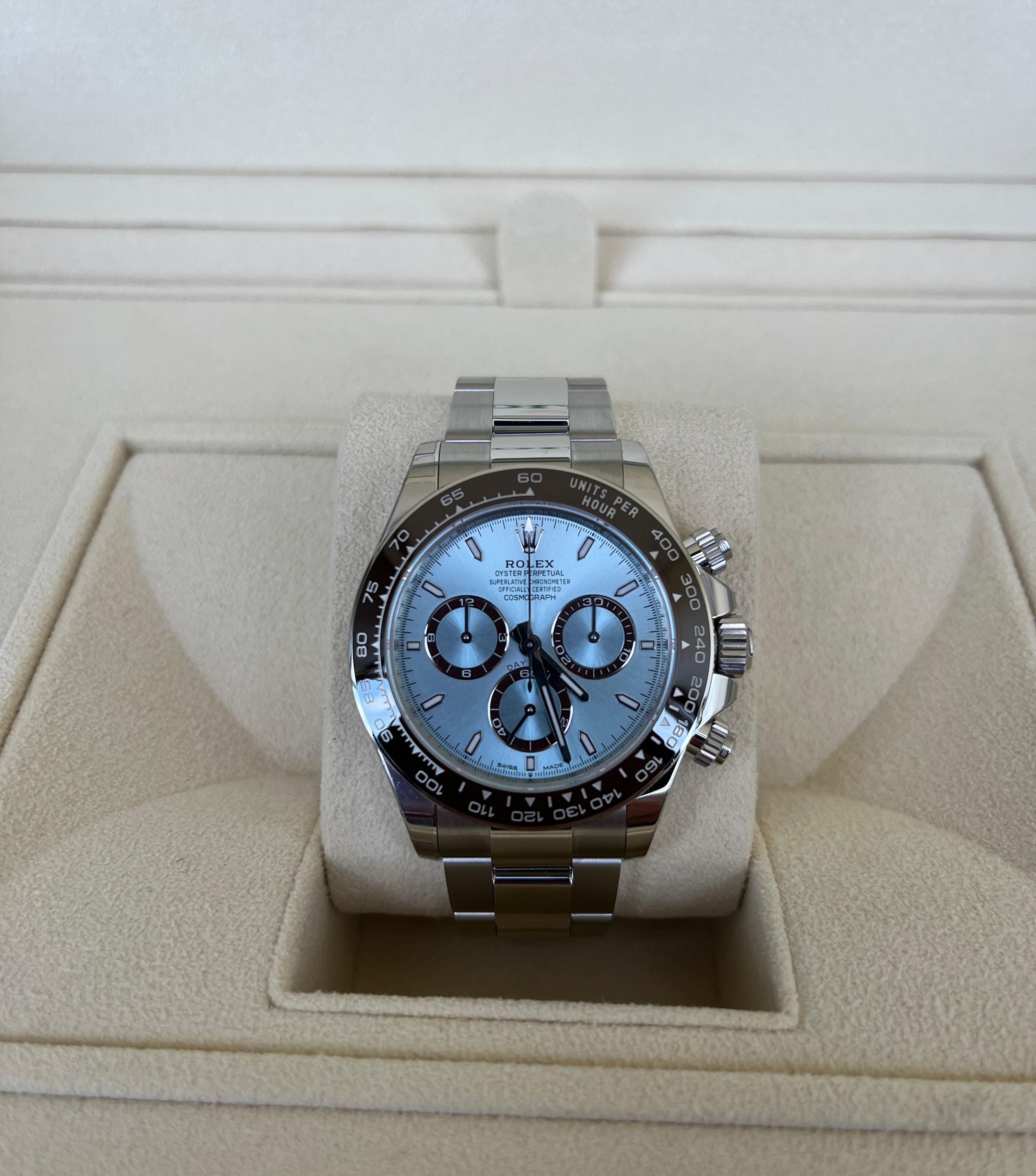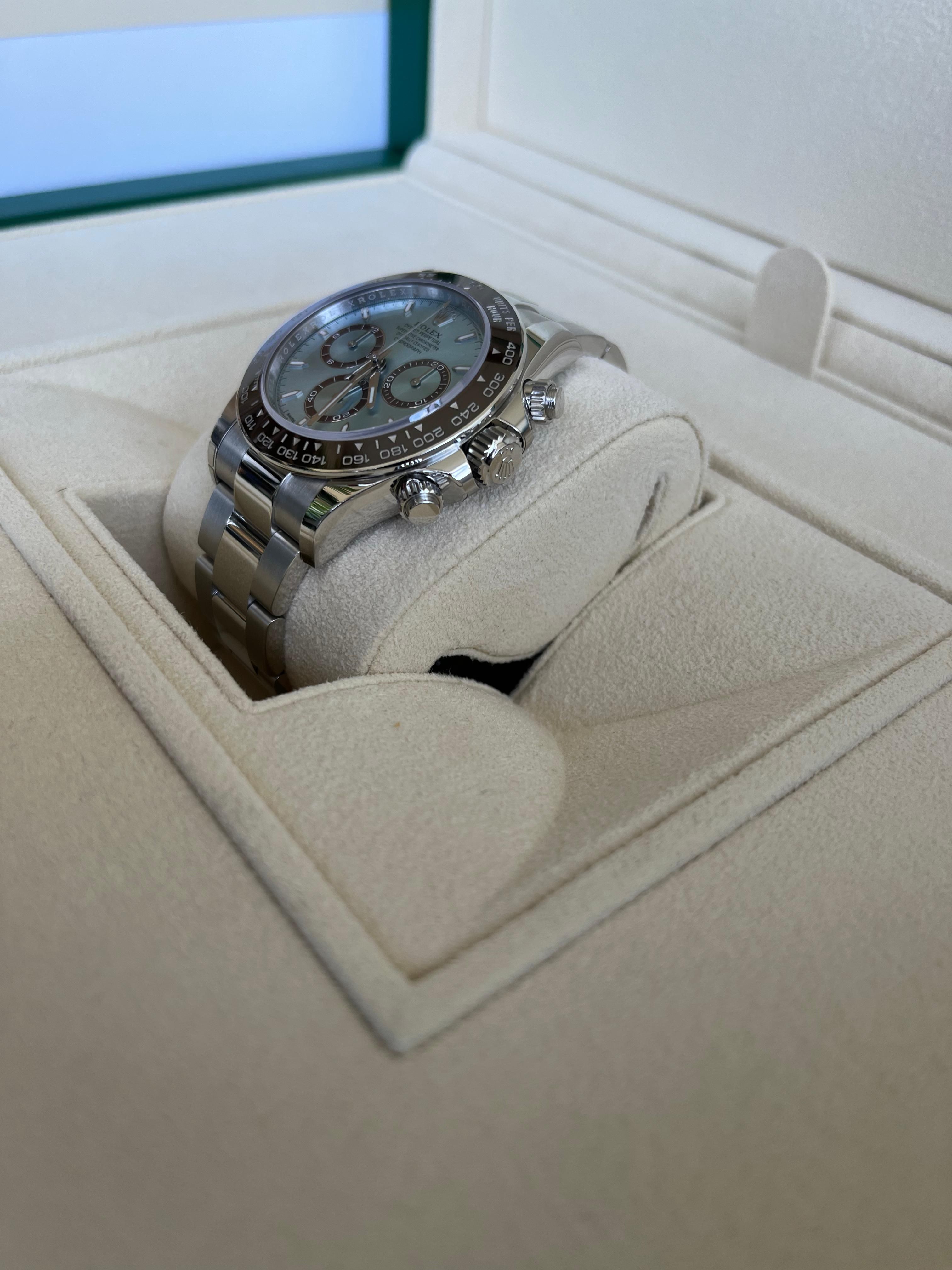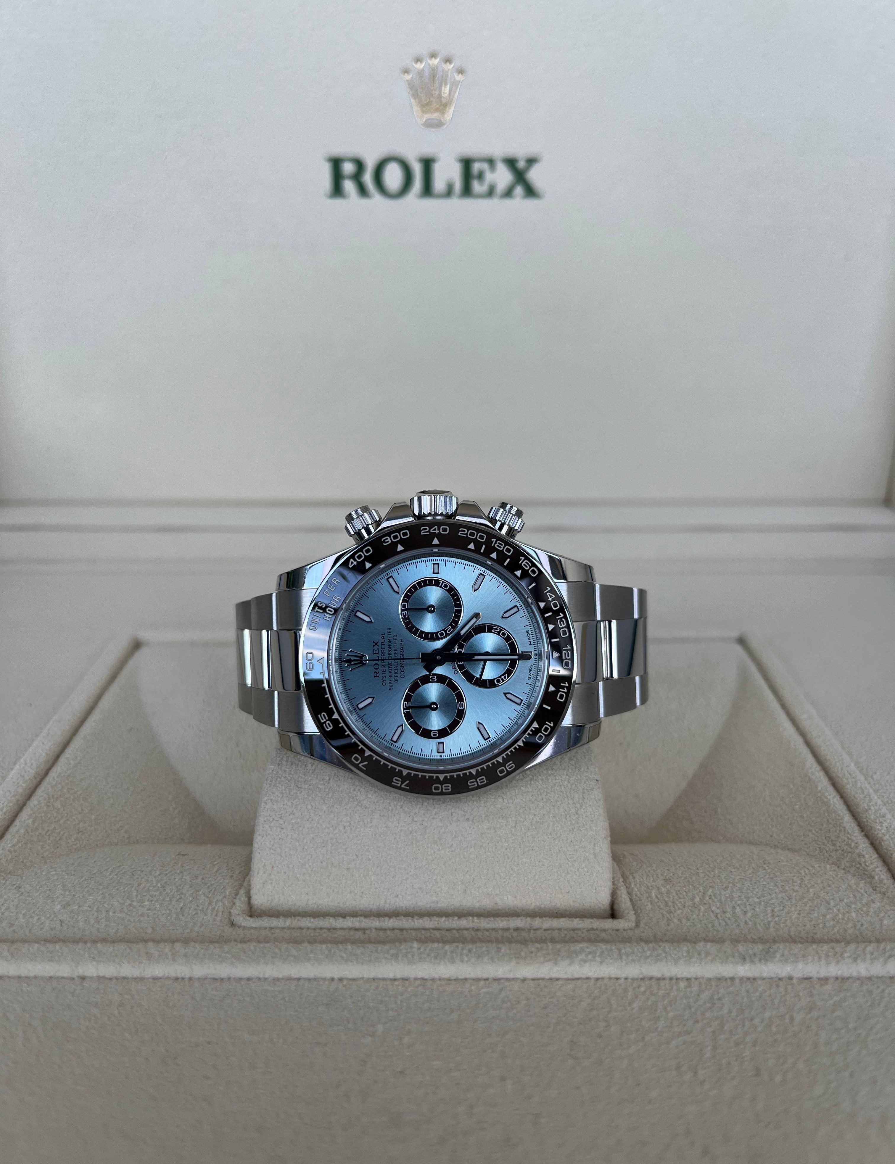 Rolex Daytona 126506 – Ice Blue Dial (2025 Model)The ultimate Daytona. Crafted in platinum, this 2025 Rolex 126506 features the signature ice blue dial and chestnut brown Cerachrom bezel. A perfect blend of luxury, precision, and racing heritage. Now available, brand new in stickers.