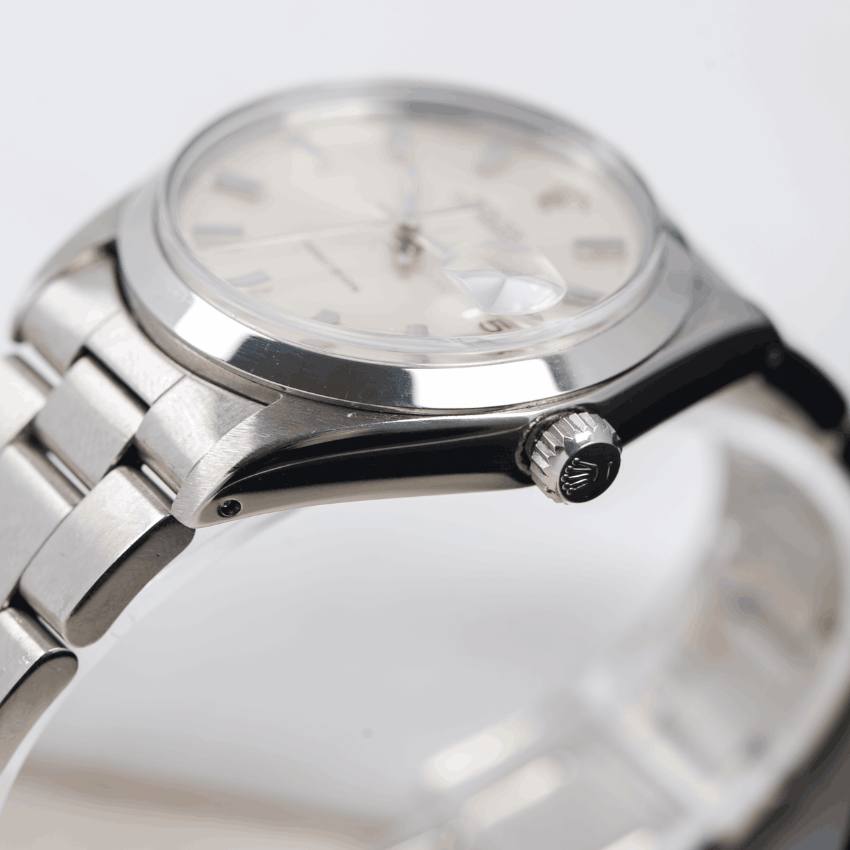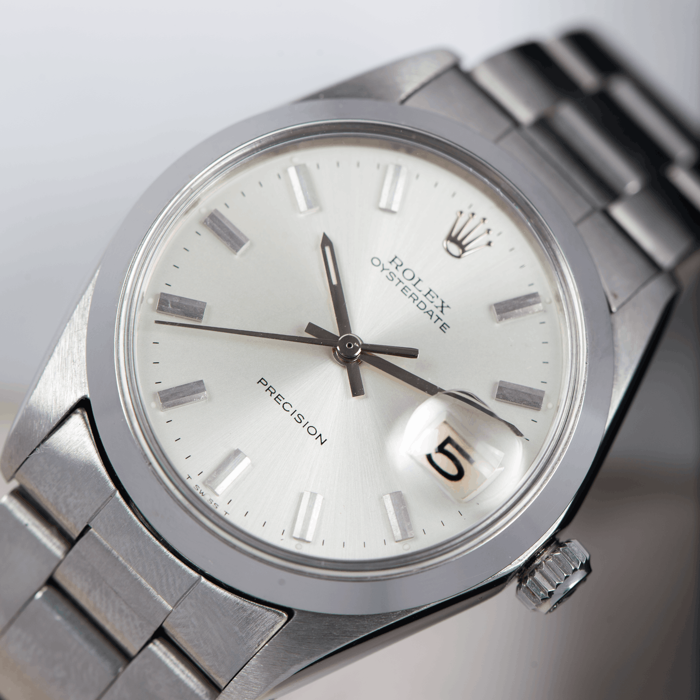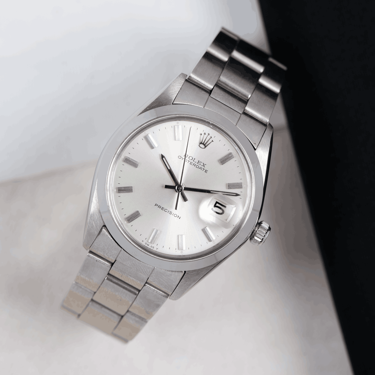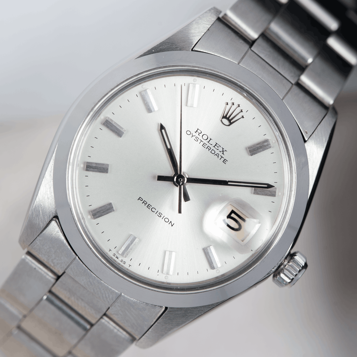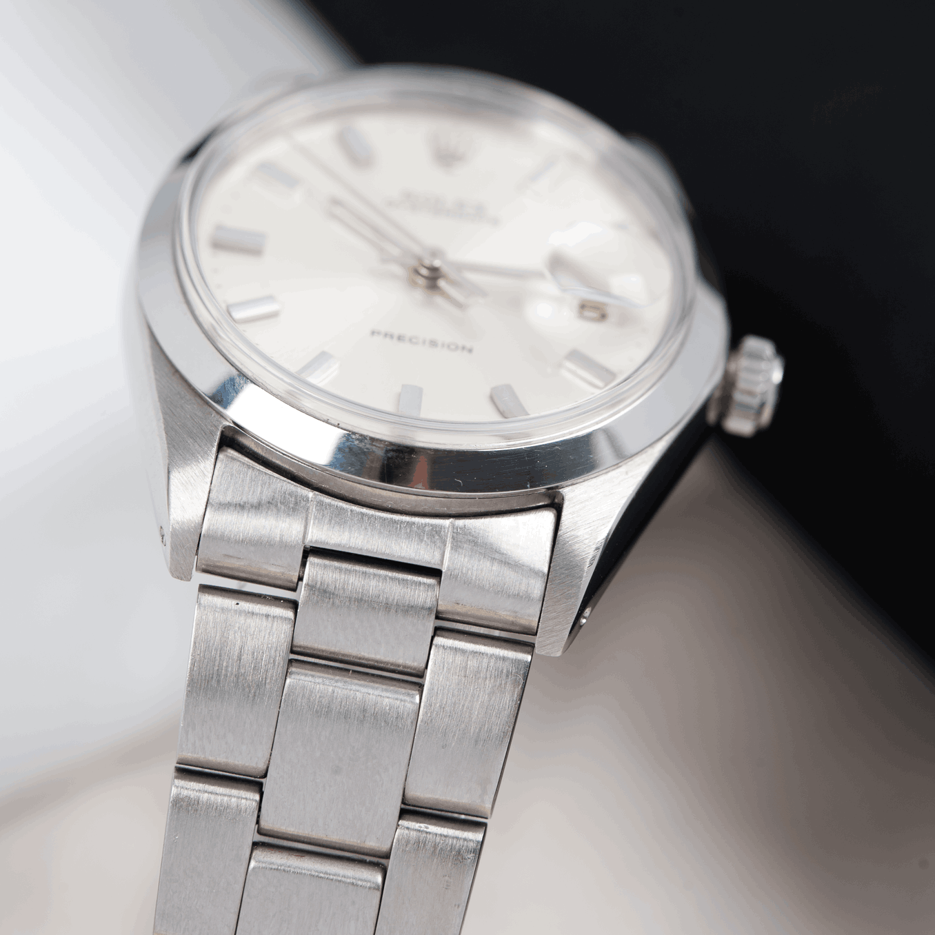 Original 'Rolex Oysterdate Precision 6694 Silver Dial' from the year 1973. First released in 1959, the Rolex Oysterdate Precision is of course unmissable when you think of Rolex. The beautiful Oyster Bracelet, with the Smooth bezel, combined with the hand-winding movement that this watch is known for, gives this watch a beautiful look. This watch features a beautiful Original Rolex Silver Dial. The dial features the famous text “Rolex Oysterdate Precision” and the T swiss T Printing, leading to the use of tritium in the original hands and around the hour markers. This Rolex Oysterdate Precision 6694 has the 1225 Handwind movement, which this watch is known for and which at the same time gives it tremendous character.