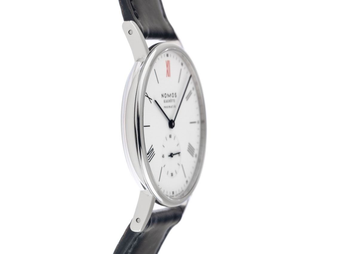 Caja de acero inoxidable de tres piezas, pulida, diámetro de la caja sin corona 38,5mm, altura de la caja 7,0mm. Correa de piel Shell Cordovan negra con costura decorativa, ancho de asas 19mm, hebilla de pasador con logo del fabricante. Esfera blanca plateada, galvanizada con números romanos y marcadores en negro, así como agujas azules. Movimiento automático, calibre de manufactura Nomos DUW3001 con 27 rubíes, reserva de marcha de aproximadamente 43 horas. Indicador de horas y minutos desde el centro, segundero pequeño con parada de segundos para un ajuste preciso de la hora a las 6 en punto. Cristal de zafiro resistente a los arañazos. Corona con logo del fabricante. Fondo de acero inoxidable grabado con ventana de cristal de zafiro. Peso del reloj incluyendo la correa 47g. Resistente al agua hasta 5 ATM. Número de referencia: 250.S2, ID: ST116042100525H-3200, número de artículo: 10000080364. Caja original de Nomos con caja exterior y documentos de garantía de mayo de 2025, Full Set. Nuevo. Tiempo de entrega inmediato.