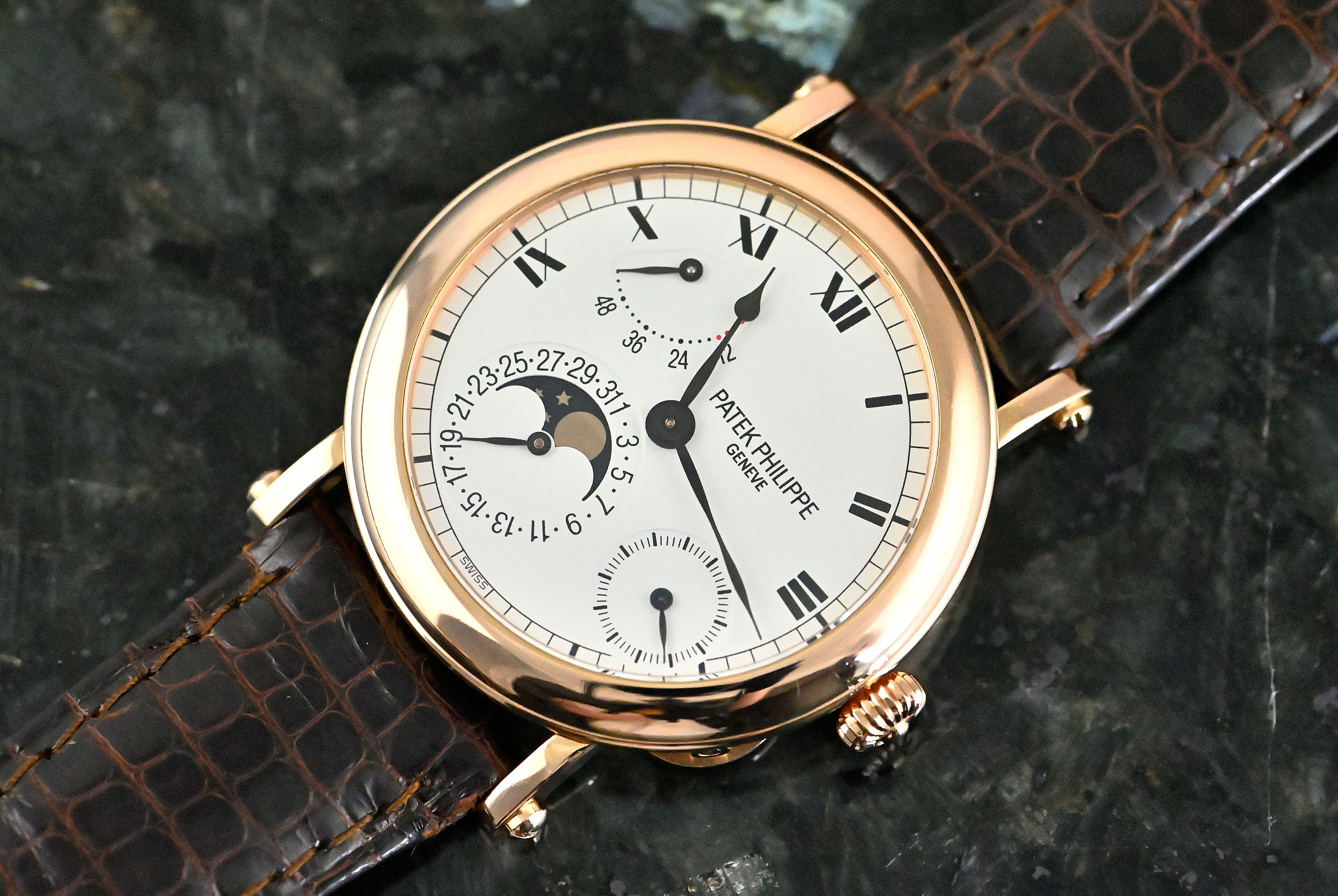 Pequeña complicación "Oficial" Patek Philippe | referencia 5054R-001 | en oro rosa de 18 quilates | lo más destacado del reloj es el fondo de caja abatible | Calibre automático Patek 240 PS IRM C LU con las siguientes funciones: Indicador de horas y minutos - segundero pequeño - aguja de fecha entre las 6 y las 9 horas - indicador de fase lunar - indicador de reserva de marcha | La referencia 5054 se fabricó de 1999 a 2005 en tres versiones de oro | los coleccionistas consideran que la versión de oro rosa y la versión de platino son las versiones más raras y visualmente más atractivas | se puede establecer una comparación con el emblemático Nautilus 5712, que utiliza el mismo calibre con idéntica disposición de la esfera | el 5054 encarna la alternativa clásica y discreta | otras características llamativas de la caja de oficial son las sólidas asas atornilladas de la caja y la característica corona de cebolla | buen estado de uso, con sólo ligeros signos de desgaste | correa de piel Patek Philippe original con el cierre desplegable PP original de oro rosa de 18 quilates | el primer propietario adquirió este cierre desplegable en 2004 por un cargo adicional, normalmente esta referencia sólo se entregaba con una hebilla de pasador | juego completo con la caja Patek original y el cartón exterior - certificado de garantía PP original / certificado de origen (vendido en febrero de 2004 por un concesionario PP alemán) - folleto / descripción del 5054 - carpeta de piel PP - folletos.