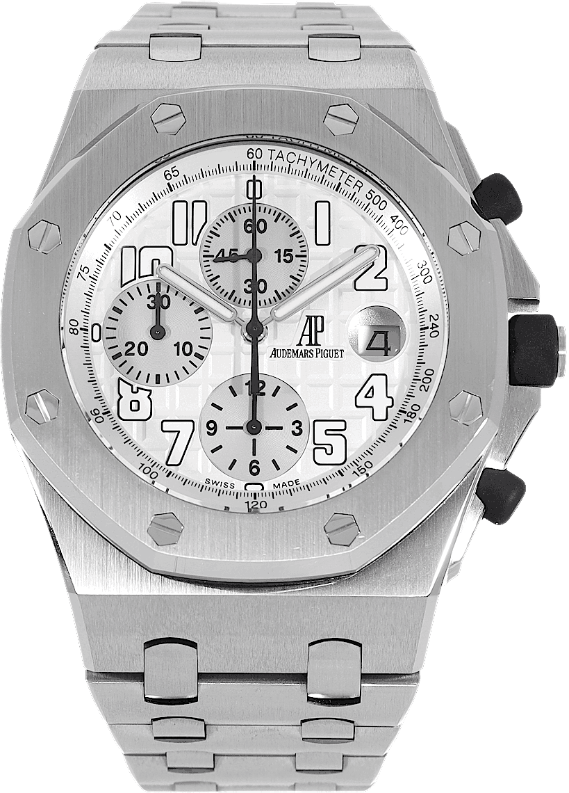 Audemars Piguet Royal Oak Offshore, Reference: 25721ST.OO.1000ST.07.A, Gender: Male, Size: 42mm, Dial color: Silver, Strap material: Stainless Steel, Movement: Automatic, Year: 2007, Condition: Previously worn, minor to no signs of usage. The movement is flawless and the case has been cleaned. watch tested ensure full functionality. An inspection by our certified watchmakers guarantees its authenticity., Documents: Original papers, CHRONEXT Certificate