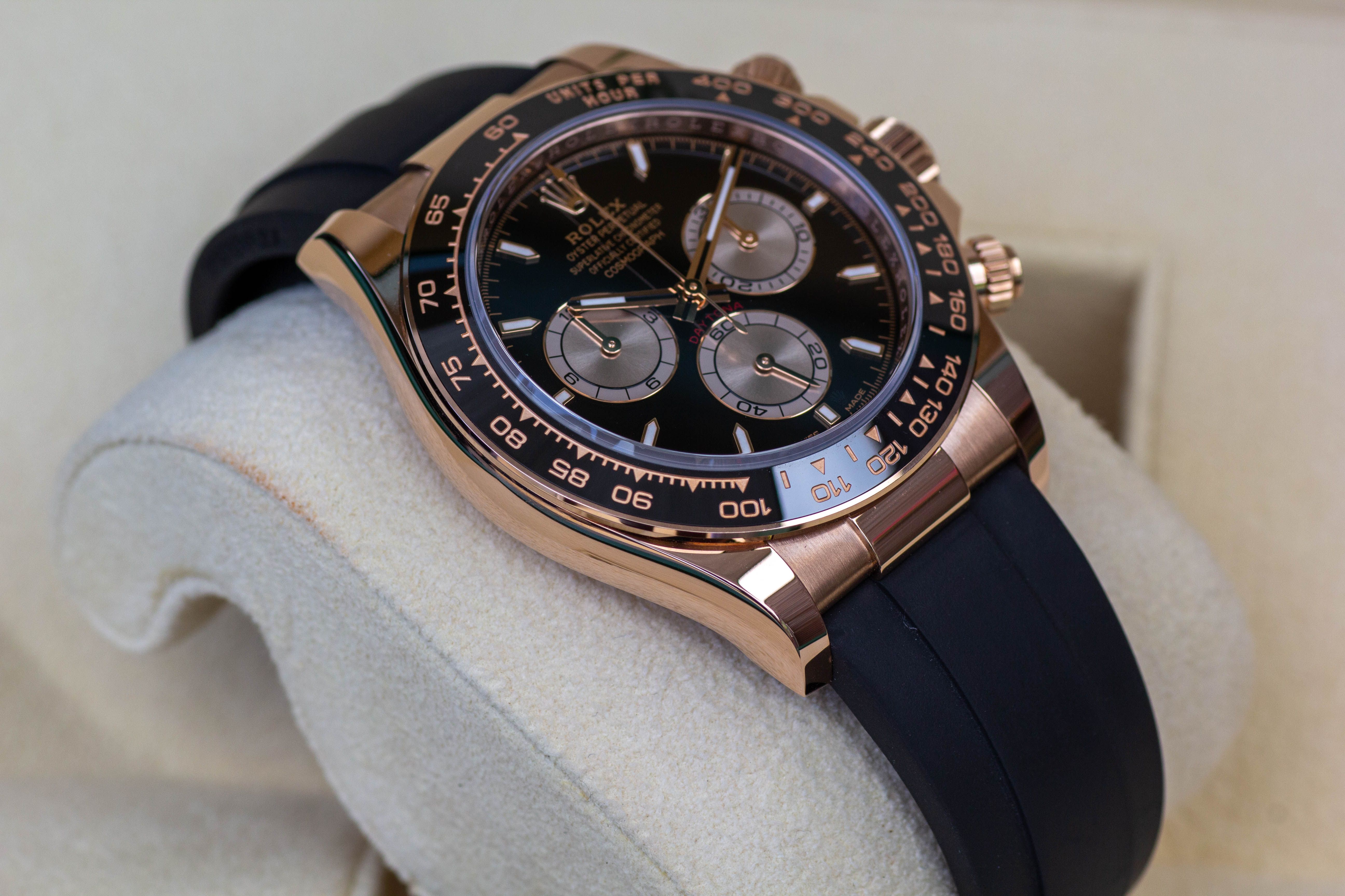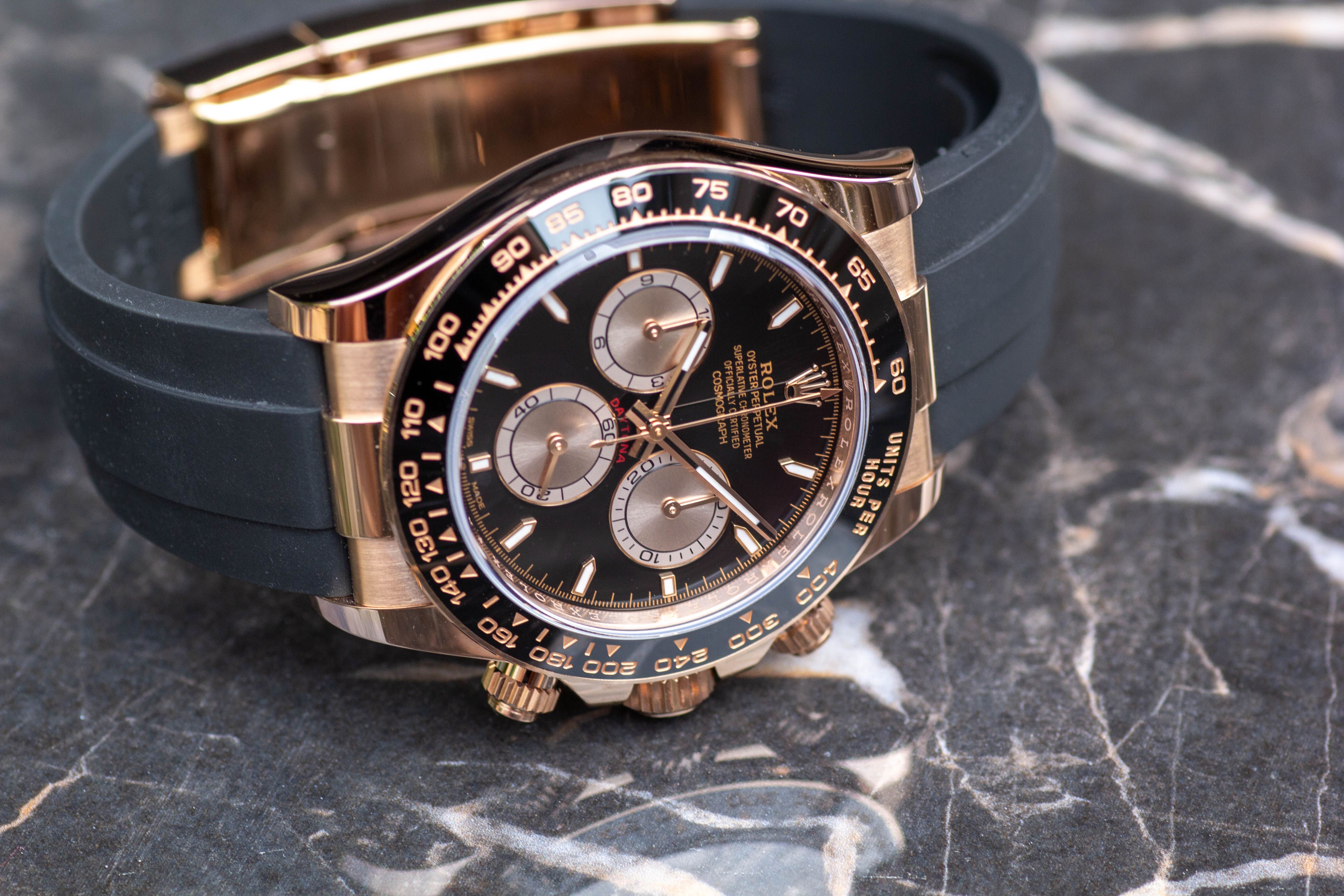 Friesland Luxury Watches te ofrece este extravagante Rolex Daytona 126515LN con correa negra de sol!