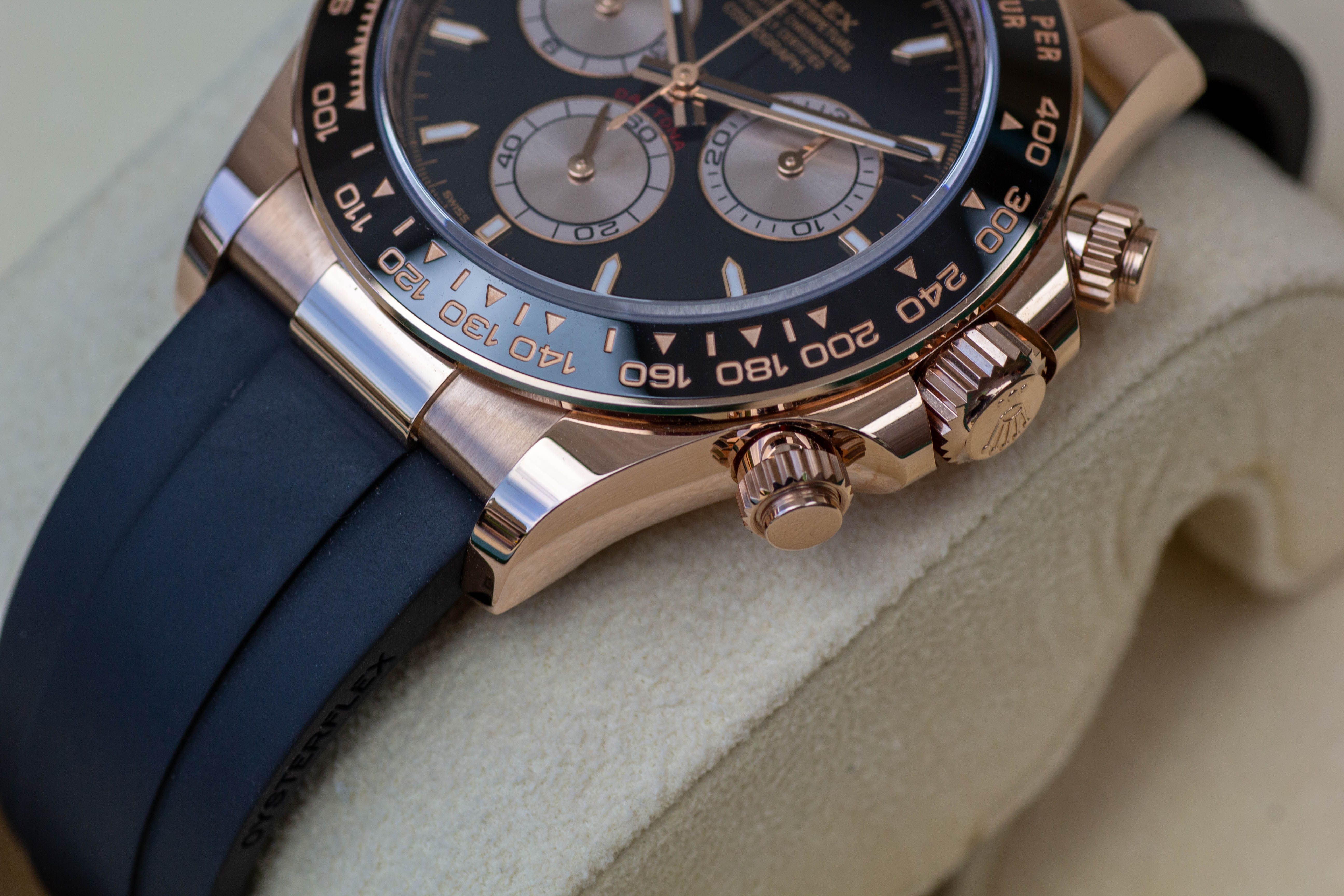 De Rolex Daytona 126515LN is een toonbeeld van sportieve elegantie en technisch vernuft. Deze iconische chronograaf, uitgevoerd in 18 kt Everose-goud, combineert luxueuze uitstraling met functionaliteit op topniveau. De zwarte sunburst-wijzerplaat speelt subtiel met het lich, terwijl de roségouden accenten en de zwarte Cerachrom-bezel een harmonieuze balans creëren. De Oysterflex bracelet verenigt het comfort van rubber met de robuustheid van metaal, waardoor de Daytona zowel op het circuit als in het dagelijks leven indruk maakt. Een uurwerk dat kracht, precisie en stijl naadloos samenbrengt.