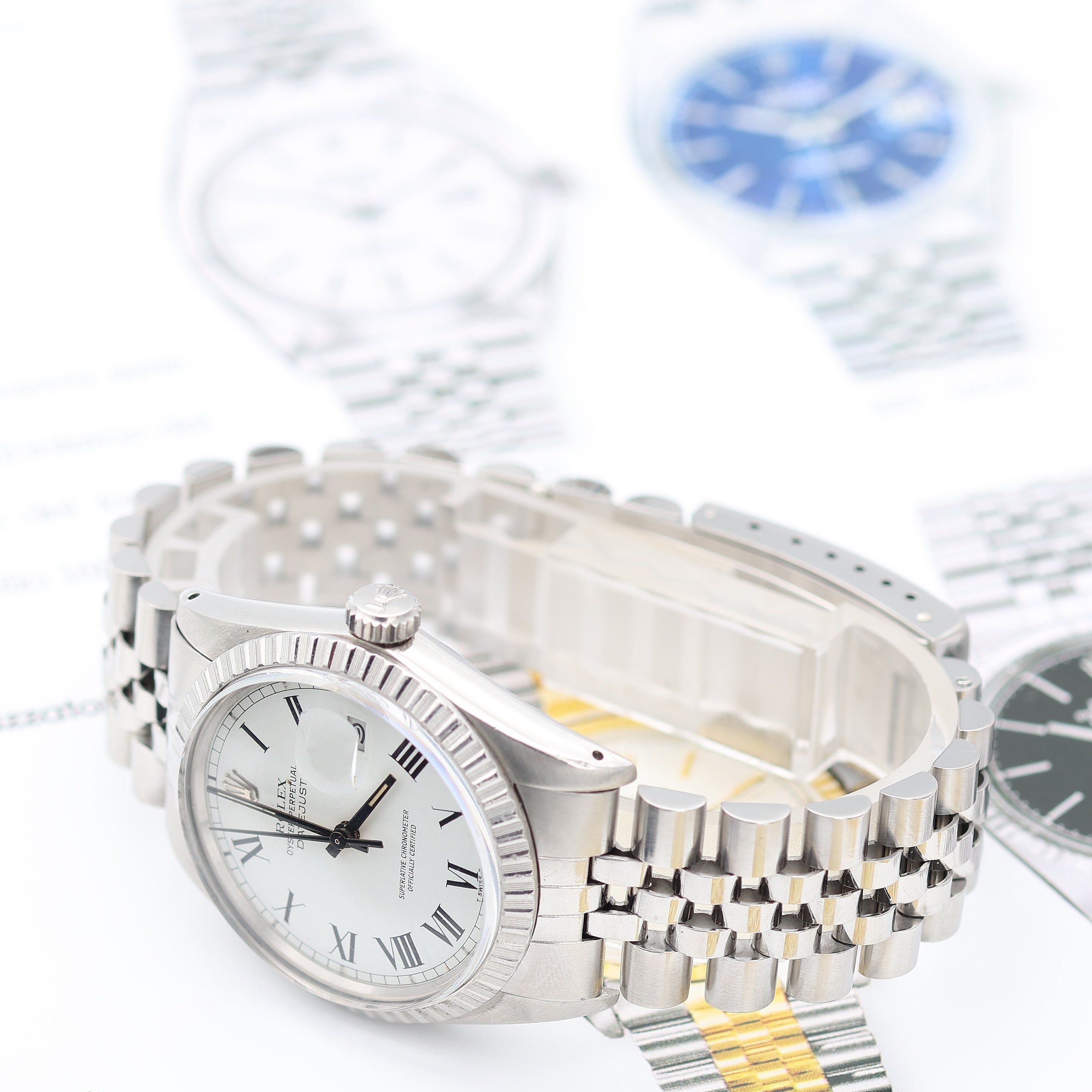 For sale at Debonar Watches: pre-owned Rolex Datejust ref. 16030 in steel with a bright white dial with roman numbers (this dial is called "Buckley" due to its characteristic style).In many collector’s eyes, Rolex’s ref. 16XXX family represents the last of the vintage Datejust models, and the all-steel ref. 16030 especially. By the time the series was released in 1977, the name was already more than 30-years old, having been launched the same year World War II ended. It took over from the four-digit ref. 16XX references—the range that had really finalized the overall design for the Datejust—and took it all the way up to 1988. The ref. 16030 somehow managed to be understated but include a little touch of flamboyance that set it apart from others in the lineup. The Datejust ref. 16030 was the direct replacement for the previous ref. 1603, which had been in production since 1959. As with that watch, the reference number for this new generation was used to describe a piece with a 36mm stainless steel case, topped with a steel, engine turned bezel. BRAND ROLEX MODEL DATEJUST 36 REFERENCE 16030 CASE MATERIAL STEEL MOVEMENT AUTOMATIC DIMENSION 36 MM DIAL WHITE BUCKLEY BEZEL STEEL CRYSTAL PLEXIGLASS BRACELET TYPE JUBILEE BRACELET MATERIAL STEEL BRACELET LENGHT 17 CM ORIGINAL BOX NO ORIGINAL PAPERS NO YEAR APPROX. THE '80s CONDITION VERY GOOD