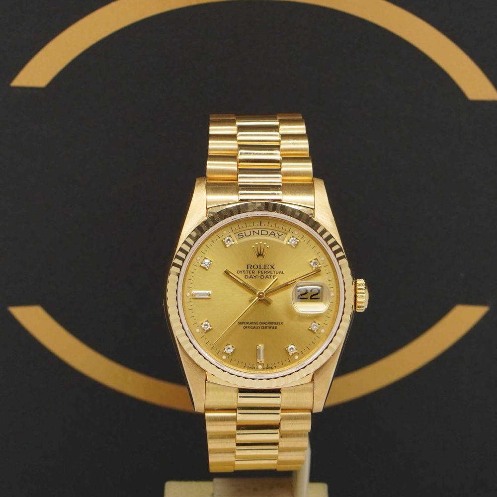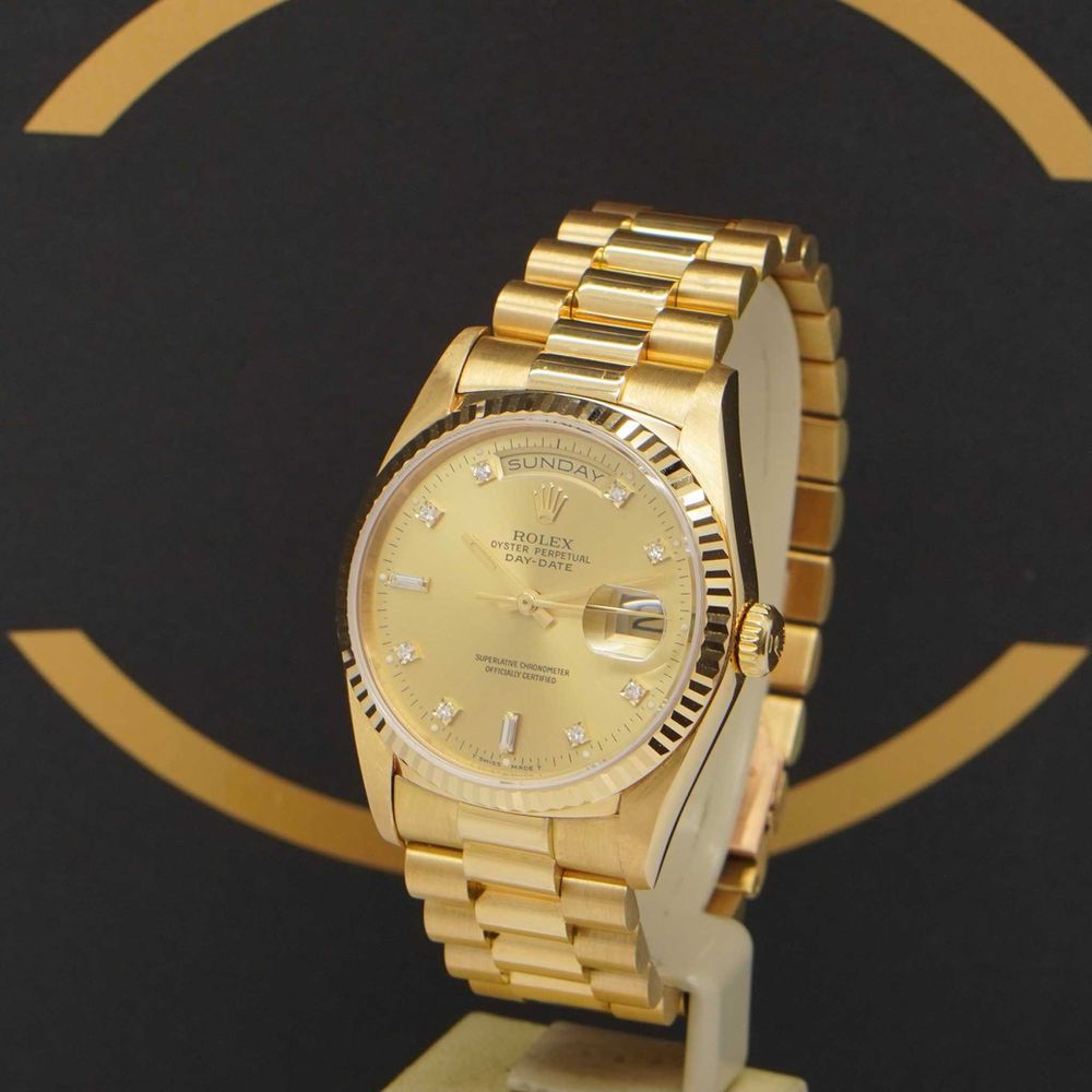 Rolex Day-Date 36 18238 with Box & Papers from 1992. Very good condition. Every watch is checked on authenticity by our master watchmakers. With every sale an authenticity certificate is given. On every watch there is a warranty of 12 months on the watch and movement. Although it is rarely used since watches are maintained and - if neccesary - serviced before being sold.