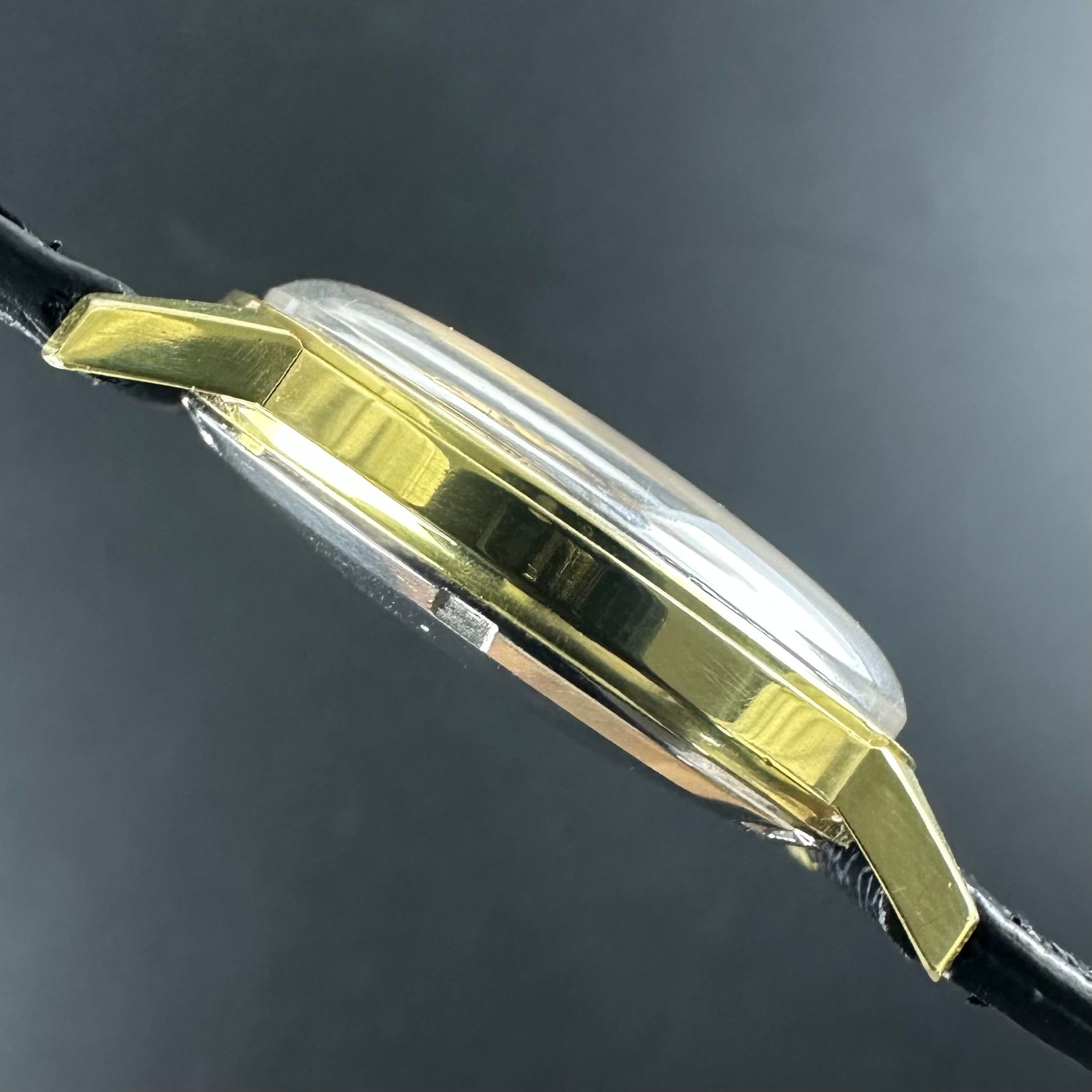 Este Omega Seamaster automático vintage se fabricó en 1967 y tiene una esfera blanca con efecto sol en buen estado, con detalles dorados. Tiene números arábigos a las 12, 6 y 9, y una ventanilla de fecha a las 3. La caja de 34,5 mm está chapada en oro, y la corona original muestra un desgaste notable, pero se ha conservado en aras de la autenticidad. En su interior hay un movimiento automático de calibre 565, recién revisado en julio de 2025 y que actualmente funciona de forma excelente. El reloj va acompañado de una correa de piel de becerro de grado 3 con grano de cocodrilo y un ligero acabado brillante. En general, la pieza está en buen estado.