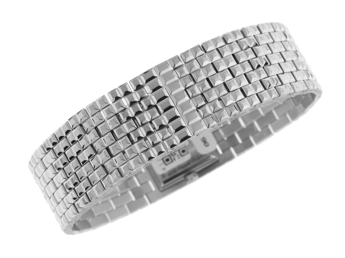 Gehäuse Edelstahl poliert, Gehäusemaße ohne Krone (L x B x H) 25,7 x 20 x 6,45mm. Lünette Edelstahl mit Pyramiden poliert. Brazalete de Edelstahl con pirámides pulidas, con dos bolsillos dobles de Edelstahl. Zifferblatt schwarz mit Edelstahl Zeigern. Reloj de cuarzo, calibre Frederique Constant. Anzeige von Stunde und Minute über Zeiger aus der Mitte. Saphirglas kratzfeste. Krone im Gehäuse eingelassen. Boden Edelstahl graviert. Gewicht der Uhr inklusive Armband 67g, Länge des Armbandes inklusive Gehäuse 180mm. Número de referencia: FC-200ONB1MC6B, ID: ST254618960725H-1895, Artikelnummer: 10000081742. Caja original Frederique Constant con caja de cartón y papel de garantía, juego completo. Nuevo. Lieferzeit sofort.