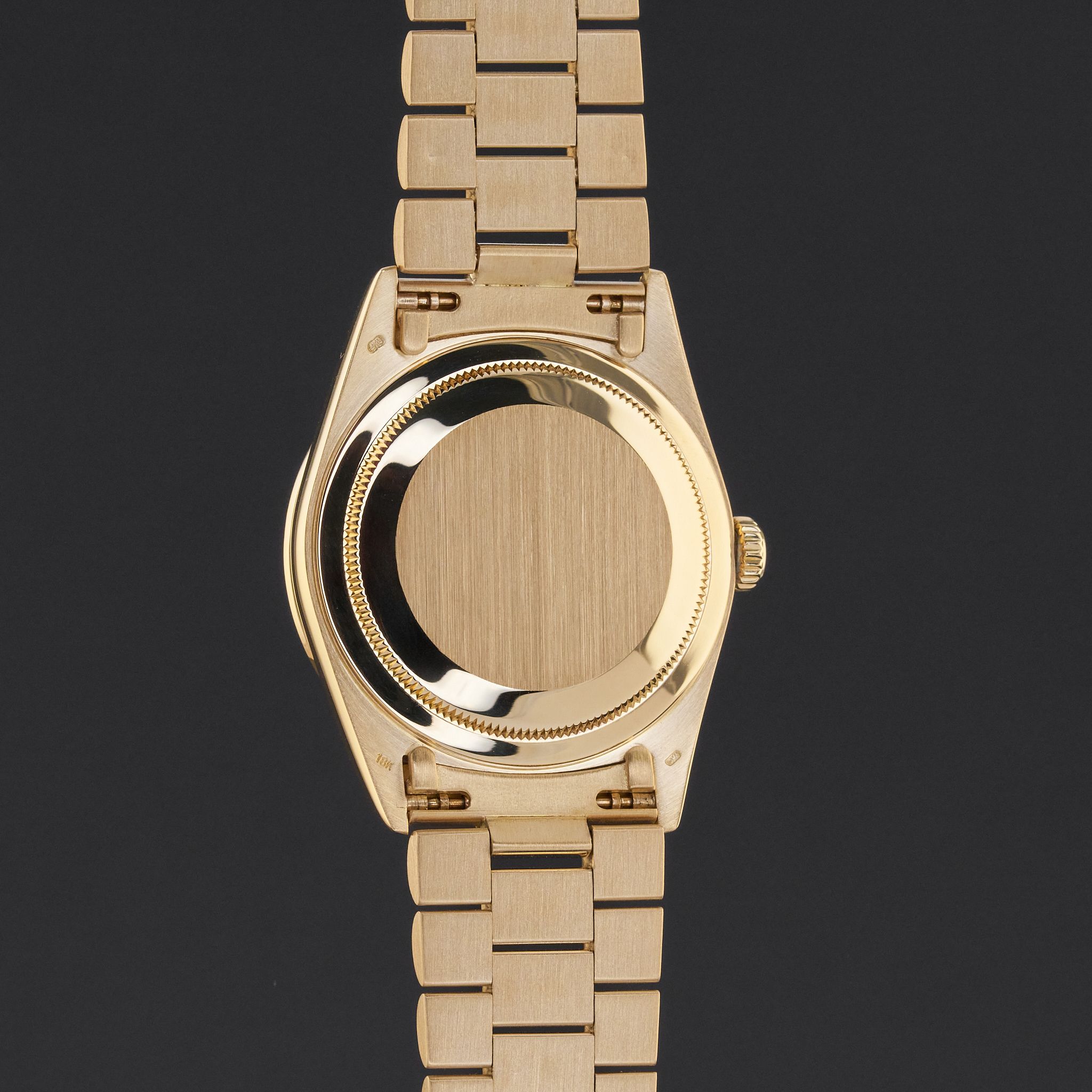 Rolex Day-Date 18388 - Brillo intemporal en oro y diamantesEste particular Rolex Day-Date, presentado en 1990, es una refinada expresión del lujo, con una esfera color champán adornada con la elegante configuración de diamantes en "cuerda". Cada marcador de hora está engastado con diamantes, formando un elegante arco que realza la armonía visual del reloj. Fabricados totalmente en oro amarillo de 18 quilates, la caja y el brazalete President proporcionan el peso y la presencia inconfundibles que definen la línea Day-Date.Una pieza exquisita para quienes aprecian la opulencia discreta, la artesanía atemporal y el prestigio icónico de Rolex.Este Rolex Day-Date 18388 tiene una esfera de diamantes en forma de cuerda color champán y está fabricado en oro amarillo de 18 quilates, con un año de producción de 1990.