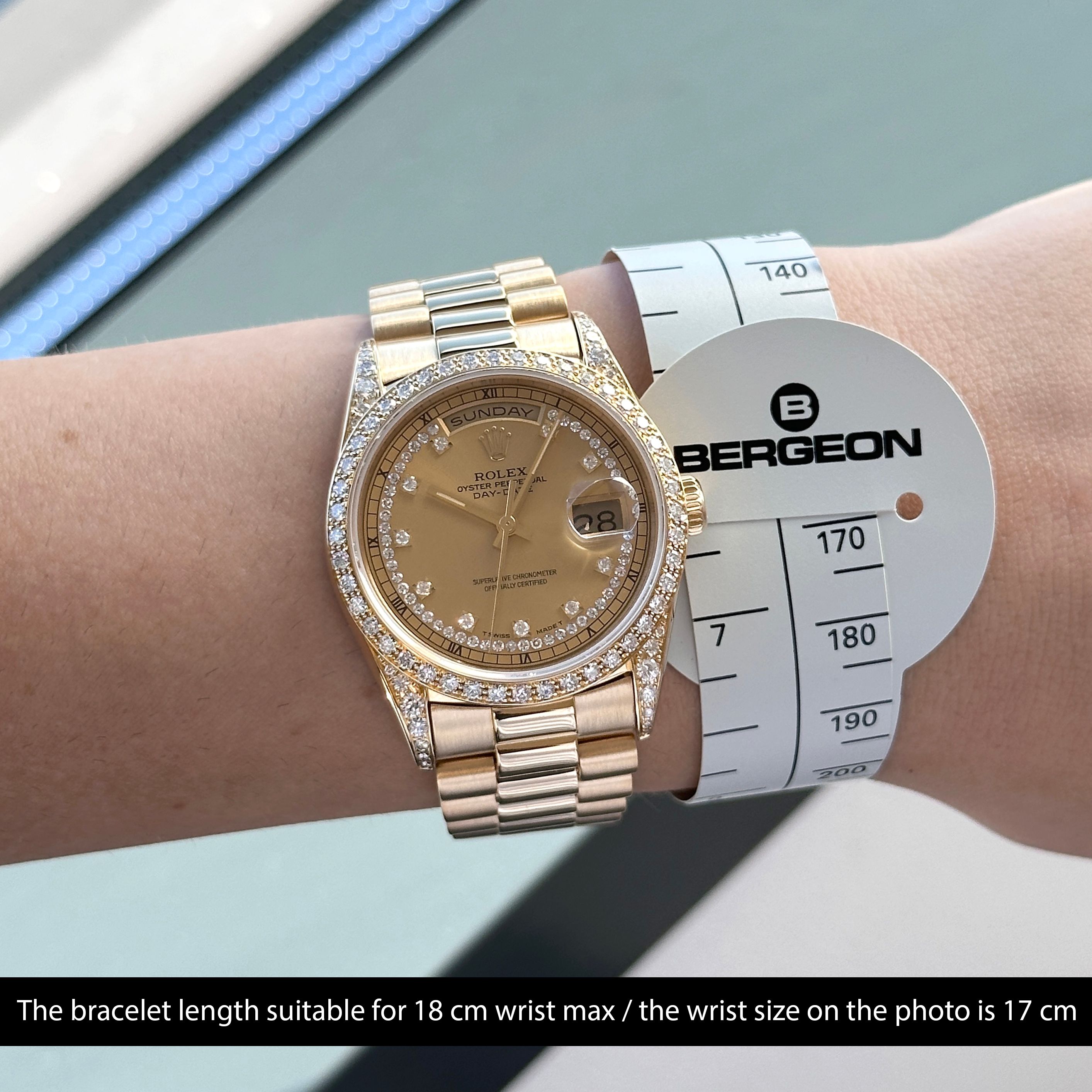 Rolex Day-Date 18388 – Timeless Brilliance in Gold and DiamondsThis particular Rolex Day-Date introduced in 1990, is a refined expression of luxury, featuring a champagne dial adorned with the elegant “string” diamond configuration. Each hour marker is set with diamonds, forming a graceful arc that enhances the watch’s visual harmony. Crafted entirely in 18k yellow gold, the case and President bracelet provide the unmistakable weight and presence that define the Day-Date line.An exquisite piece for those who appreciate understated opulence, timeless craftsmanship, and the iconic prestige of Rolex.This Rolex Day-Date 18388 features a Champagne string diamond dial and is crafted from 18K yellow gold, with a production year of 1990.Case No: E75XXXX