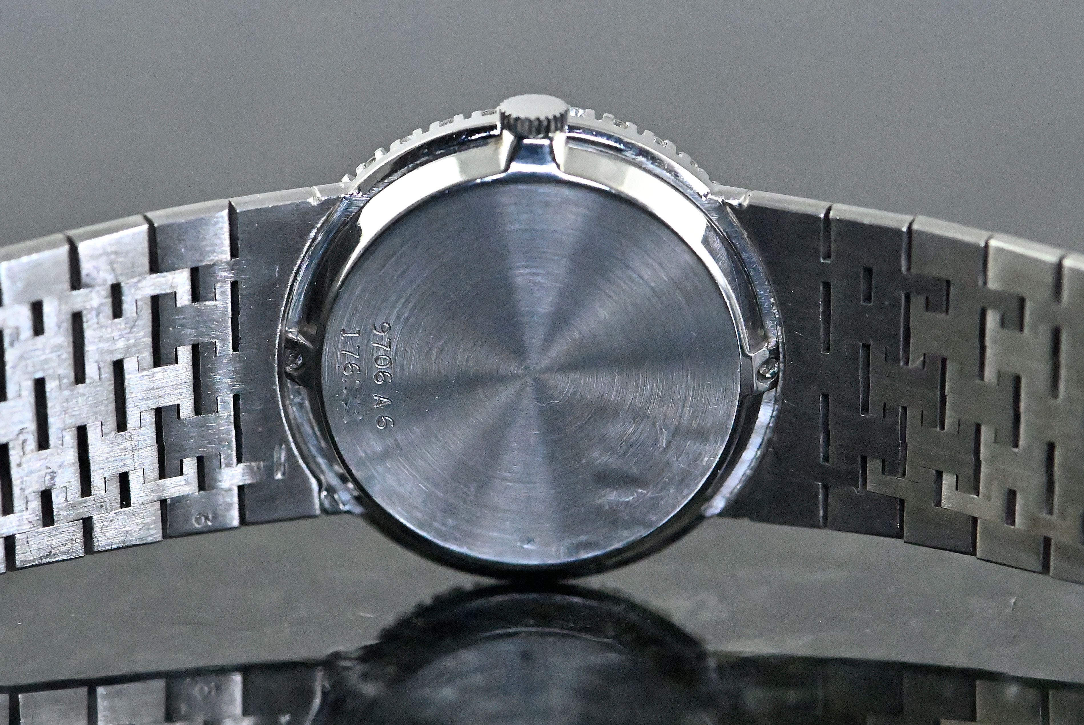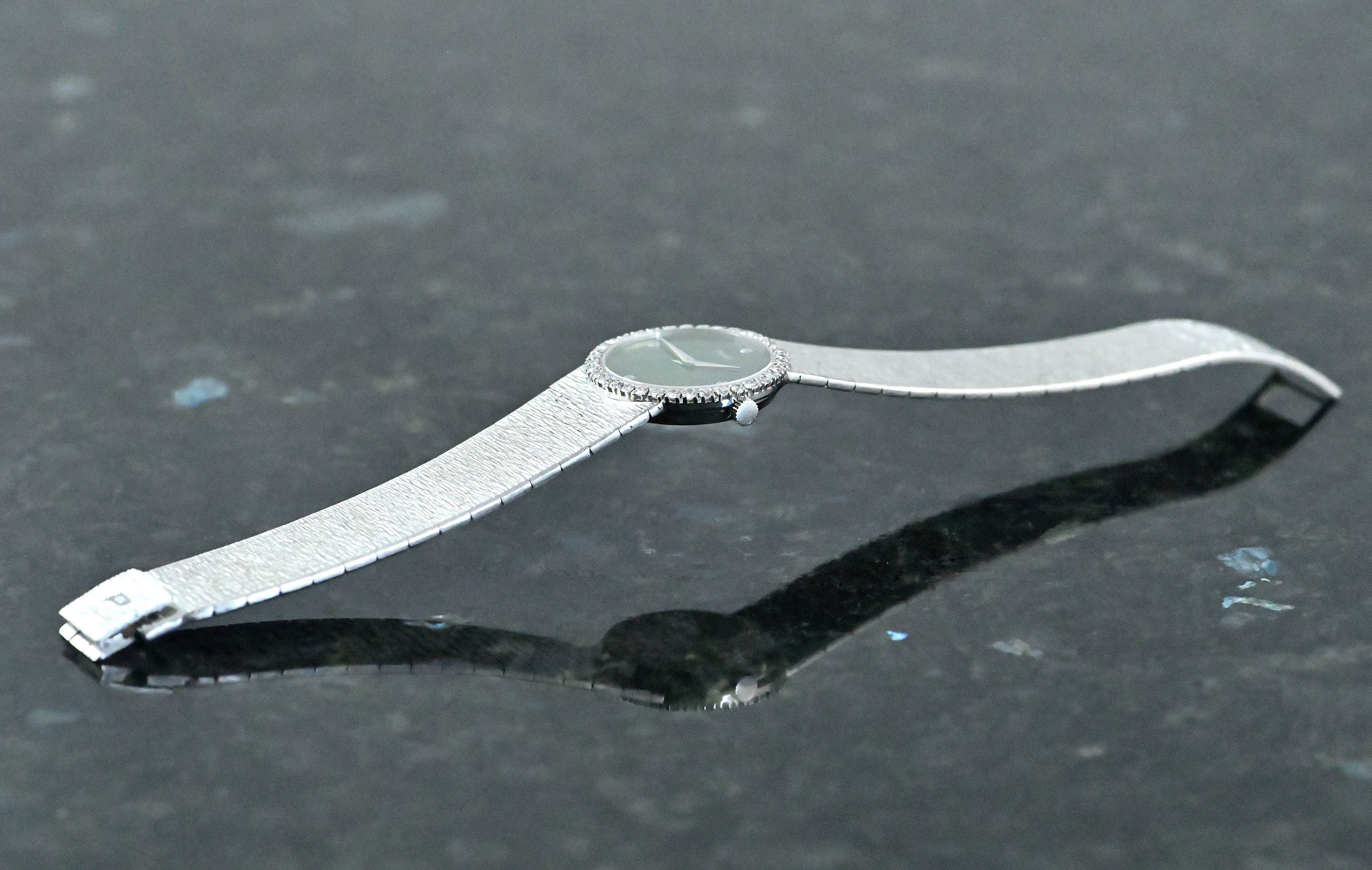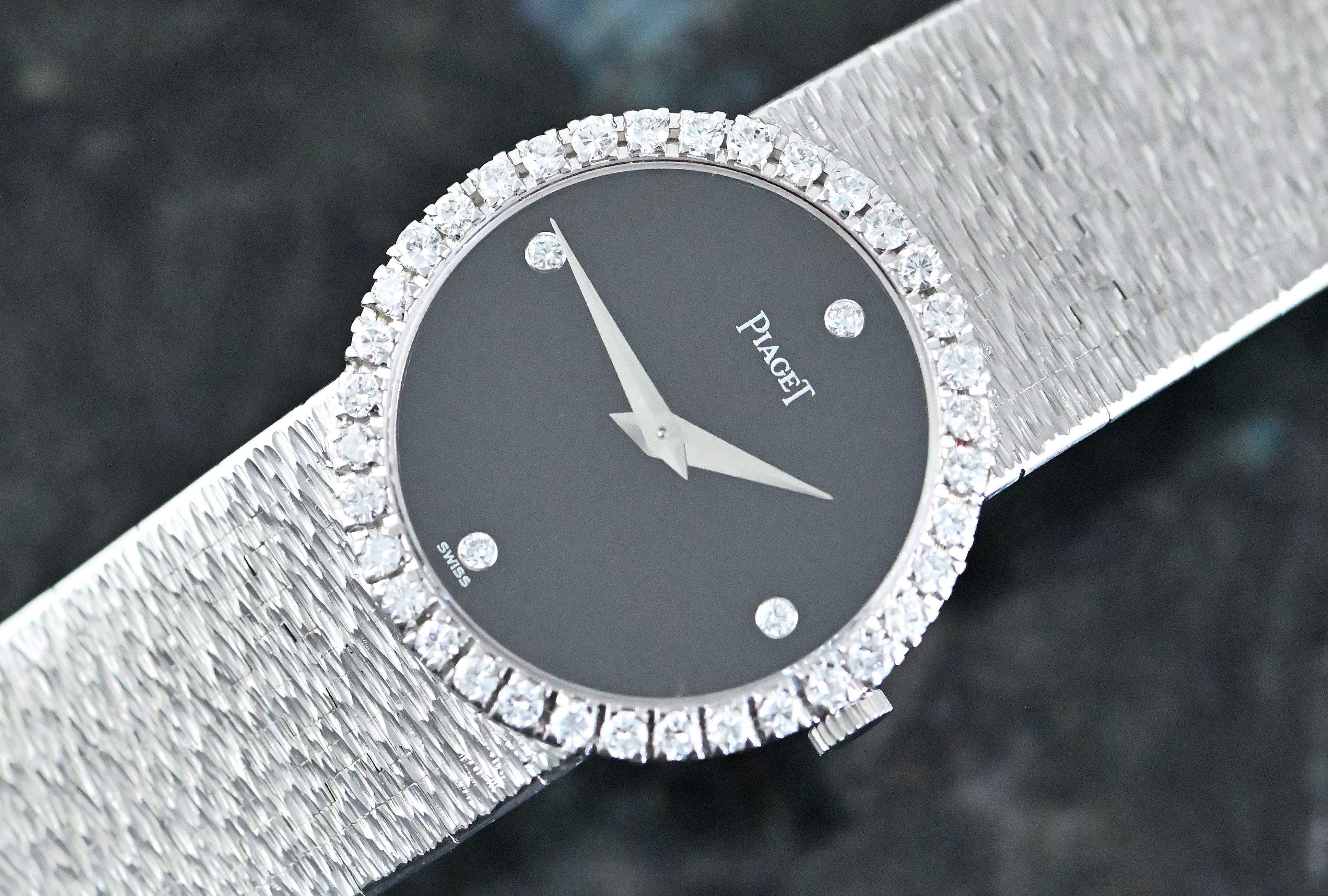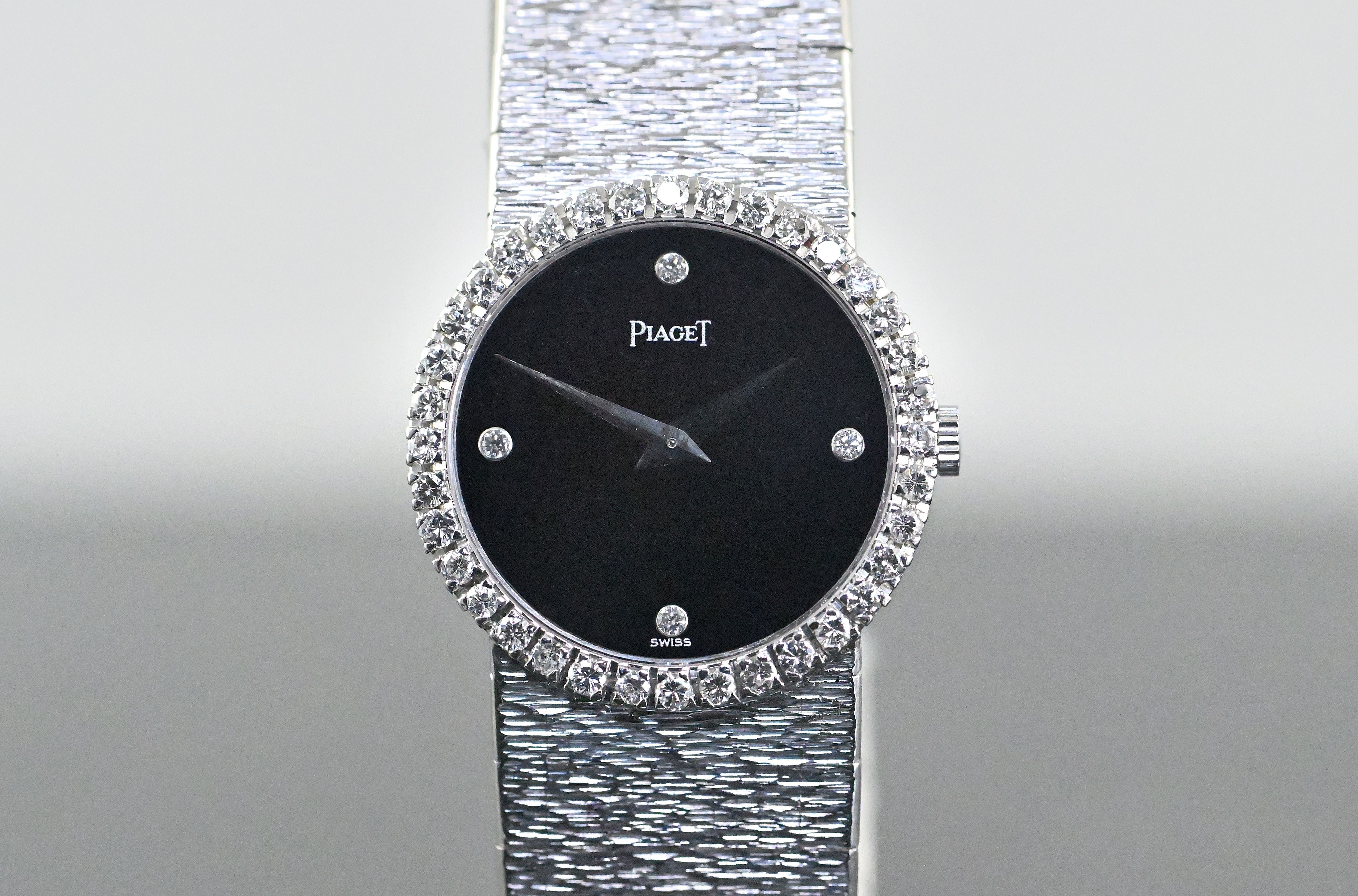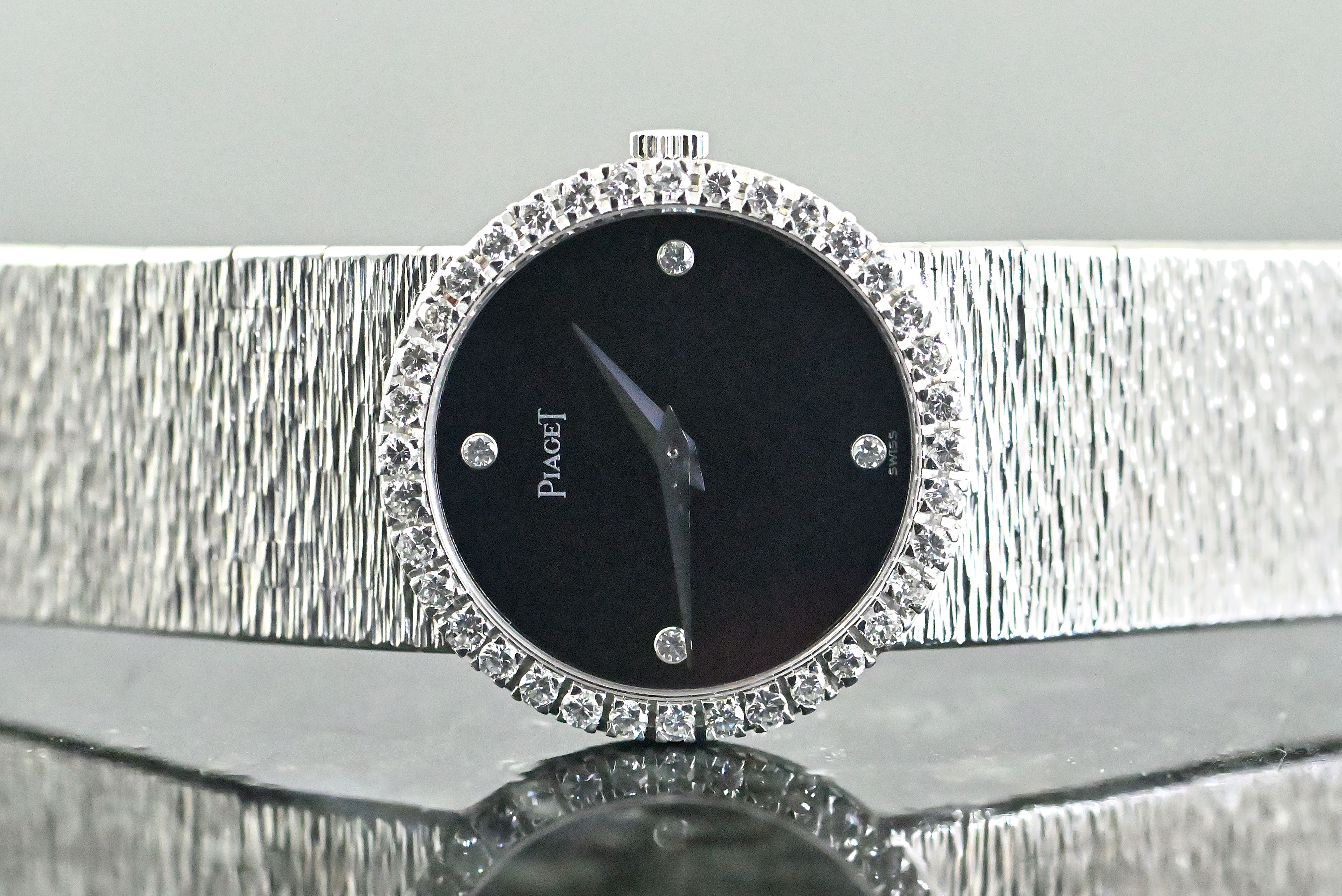 Elegant and extraordinary Piaget Vintage Dress Watch | reference 9706 A 6 | in 18k white gold | stunning Onyx diamond dial | Piaget hand-wound calibre 9P | total of 36 brilliant-cut diamonds on the bezel | beautiful onyx dial with 4 diamonds at 12, 3, 6 and 9 o'clock | perfect combination with the bezel | the Onyx has no cracks, chips or other damage | original Piaget bracelet and jewellery clasp in 18k white gold | in the past, the bracelet was lengthened by a very skilled goldsmith, and this work was carried out very well, from the outside, no change in the course of the bracelet can be seen | raised gold hallmark, which indicates that the watch has been carefully and lightly polished only a few times over its many decades | very good condition with no major dents or scratches | in August 2025, our master watchmaker performed a service, without refurbishing the case or bracelet | diameter of 24 mm (without the crown) | total weight of the watch is approx. 60.1 grams | bracelet has a total length of approx. 17.2 cm and can, of course, be shortened or lengthened by a good goldsmith | enclosed original Piaget warranty certificate (sold on 1 December 1972) and a Piaget watch case.