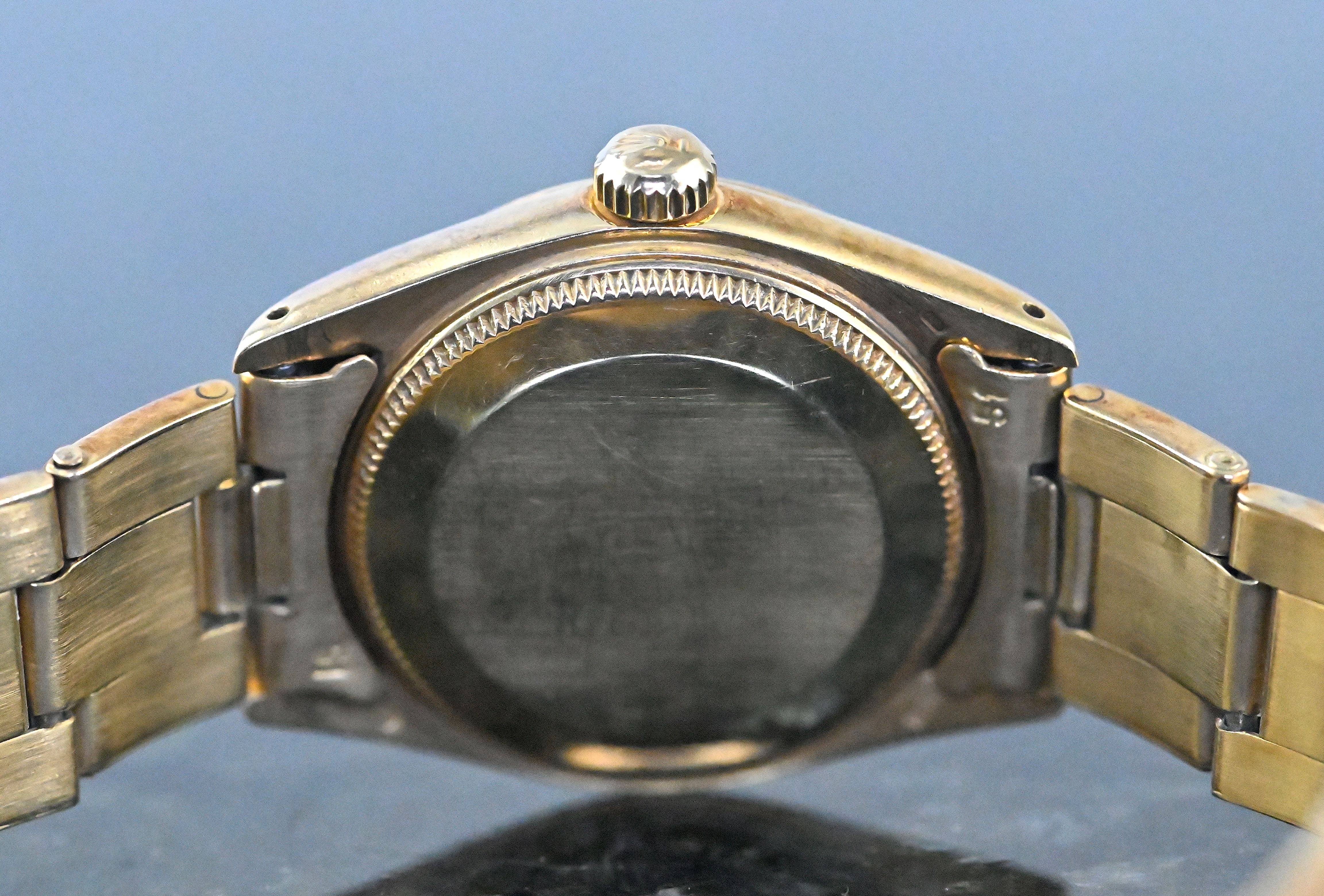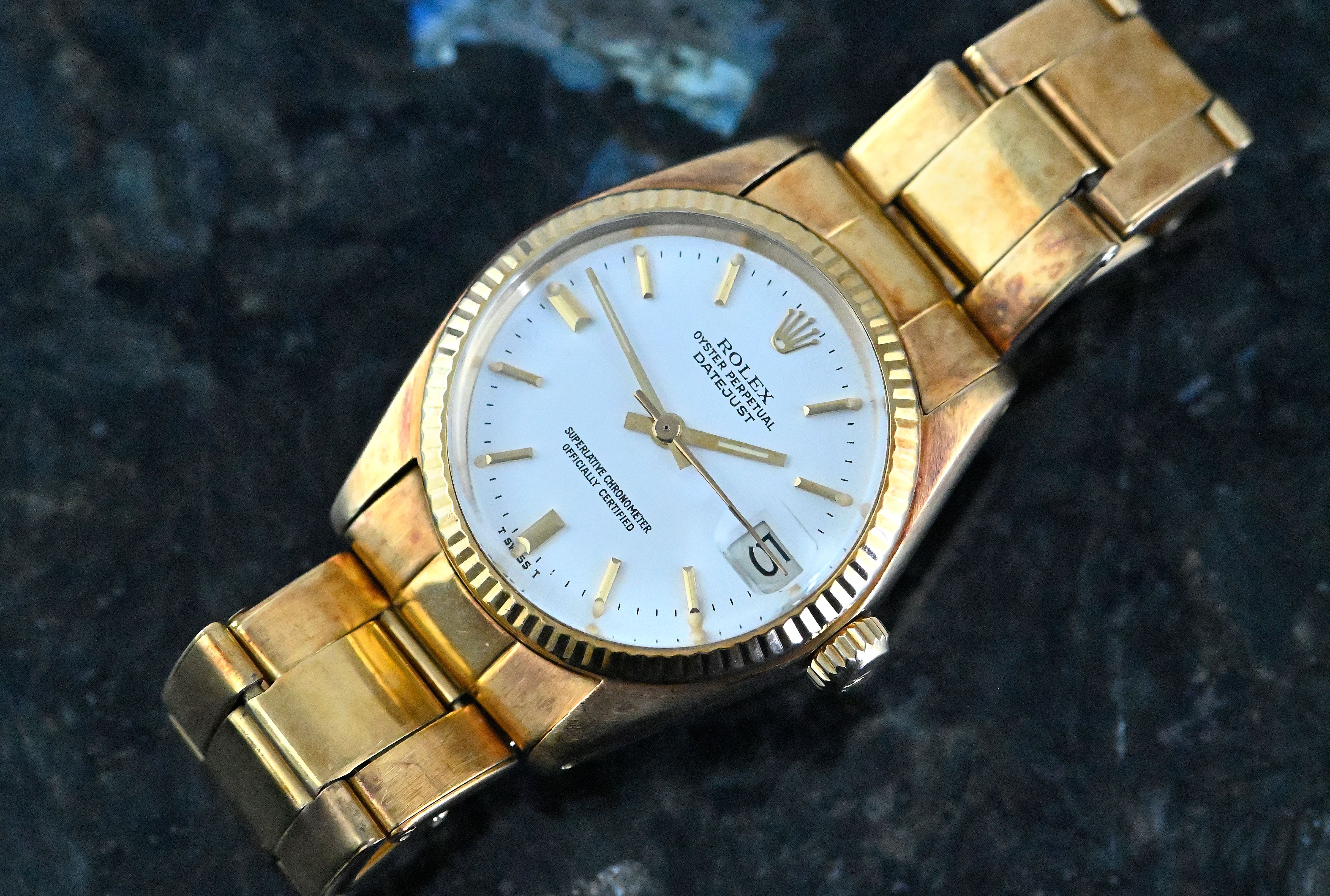 Rolex Datejust 31 vintage "esfera blanca" | referencia 6827 | en oro amarillo de 18 quilates | brazalete Oyster original con cierre desplegable en oro amarillo de 18 quilates | bisel fluted | número de serie 5.16 millones, lo que significa que se fabricó en 1977 | calibre automático Rolex 2030 | fantástico estado sin pulir con una oxidación loca y fría, que da al reloj un aspecto vintage perfecto | en agosto de 2025, nuestro maestro relojero realizó una revisión / servicio sin restaurar / pulir la caja ni el brazalete | la circunferencia interior del brazalete es de aprox. 16 cm | peso aprox. 75,5 gramos.