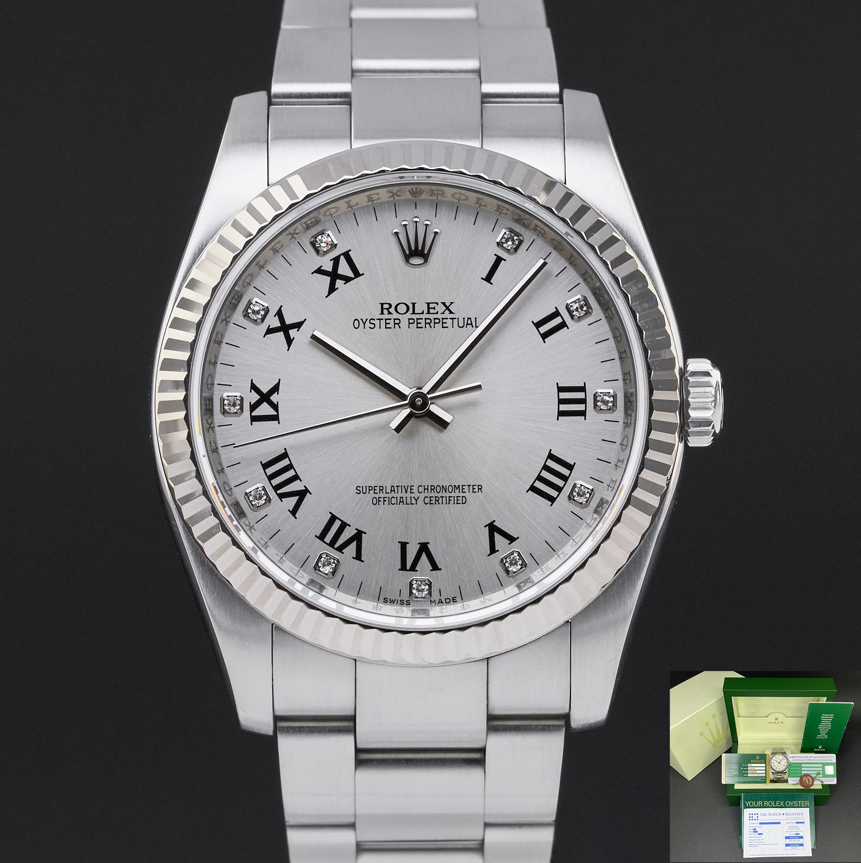 Rolex Oyster Perpetual 116034 – Timeless Elegance with a Refined TouchThis particular Rolex Oyster Perpetual introduced in 2008, features a silver dial adorned with diamond hour markers and Roman numerals. This blend of classic elements and precious detailing offers an elegant yet understated aesthetic.A versatile timepiece for those who value refined style and Rolex’s impeccable craftsmanship.This Rolex Oyster Perpetual 116034 features a Silver diamond Roman dial and is crafted from stainless steel, with a production year of 2008.Case No: M62XXXX