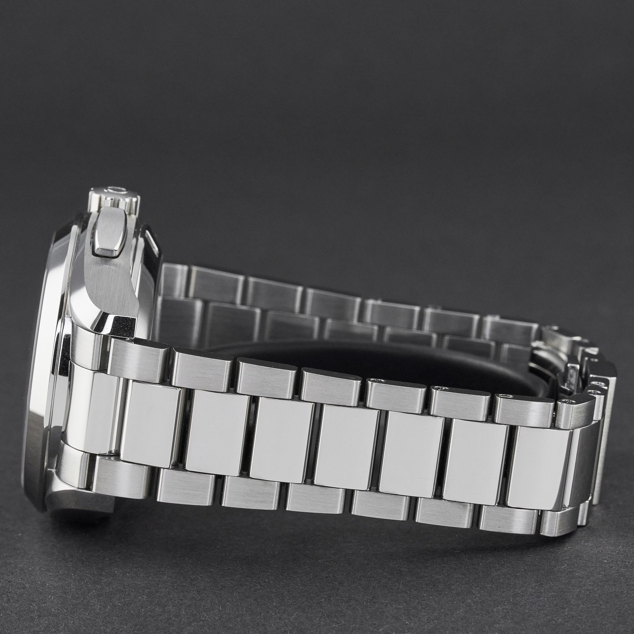 Este Omega Seamaster Aqua Terra Gmt, presentado en 2020, combina un carácter deportivo con elegancia en un cronógrafo versátil. La esfera gris, con un patrón de cubierta de teca, rinde homenaje a la herencia marítima de la marca, mientras que dos subesferas simétricas crean un aspecto equilibrado. En su interior late el movimiento automático Co-Axial, que ofrece tanto fiabilidad como precisión.