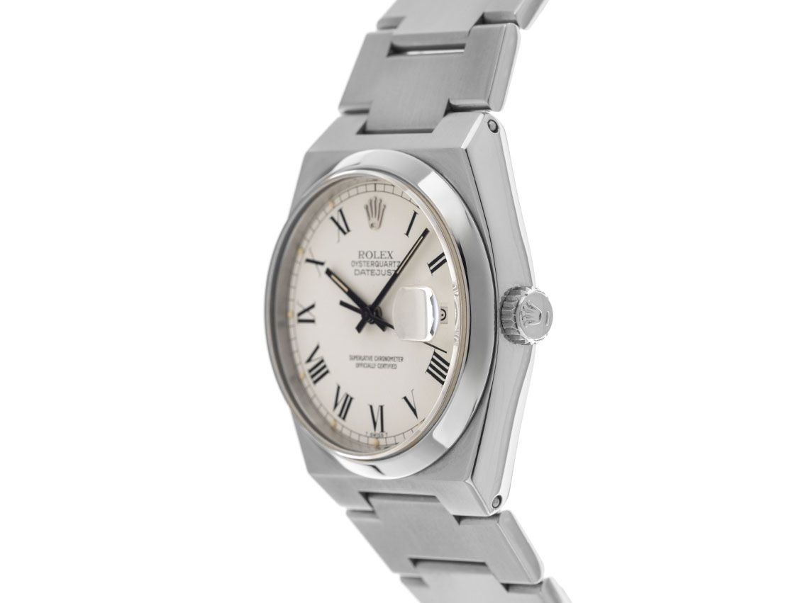 Rolex Datejust Oysterquartz Stahl Quarz Armband StahlGehäuse Edelstahl poliert und satiniert, Gehäusedurchmesser ohne Krone 36mm, Gehäusehöhe 12,7mm. Lünette Edelstahl glatt und poliert. Armband Edelstahl poliert und satiniert, Faltschließe Edelstahl mit Hersteller-Logo. Zifferblatt weiß mit schwarzen römischen Ziffern und schwarzen Zeigern, "T swiss T" Aufschrift bei 6 Uhr. Uhrwerk quarzgesteuert, Chronometer, Rolex Manufakturkaliber 5035 mit 11 Edelsteinen. Anzeige von Stunde, Minute und Sekunde über Zeiger aus der Mitte mit Sekundenstopp zur sekundengenauen Einstellung der Uhrzeit, Datumsanzeige mit Schnellverstellung unter Glaslupe bei 3 Uhr mit open 6/9 (offene 6 und 9 in der Datumsanzeige). Saphirglas kratzfest. Krone verschraubbar mit Hersteller-Logo. Boden Edelstahl verschraubt. Gewicht der Uhr inklusive Armband 120g, Länge des Armbandes inklusive Gehäuse 180mm. Referenznummer: 17000, Gehäusenummer: 5672XXX, Baujahr: 1978, ID: P134790000825H-10800, Artikelnummer: 10000081835. Mit Gangkontrolle, neuer Batterie und kompletter äußerlicher Aufarbeitung von August 2025. Original Rolex Box mit Umkarton und Beschreibung, Ledermäppchen, Übersetzungsheft, Rolex Chronometer-Siegel und Watchregister Auszug von August 2025, The Watch Register Zertifikat / ohne Eintrag (Internationale Datenbank für verlorene oder gestohlene Uhren)