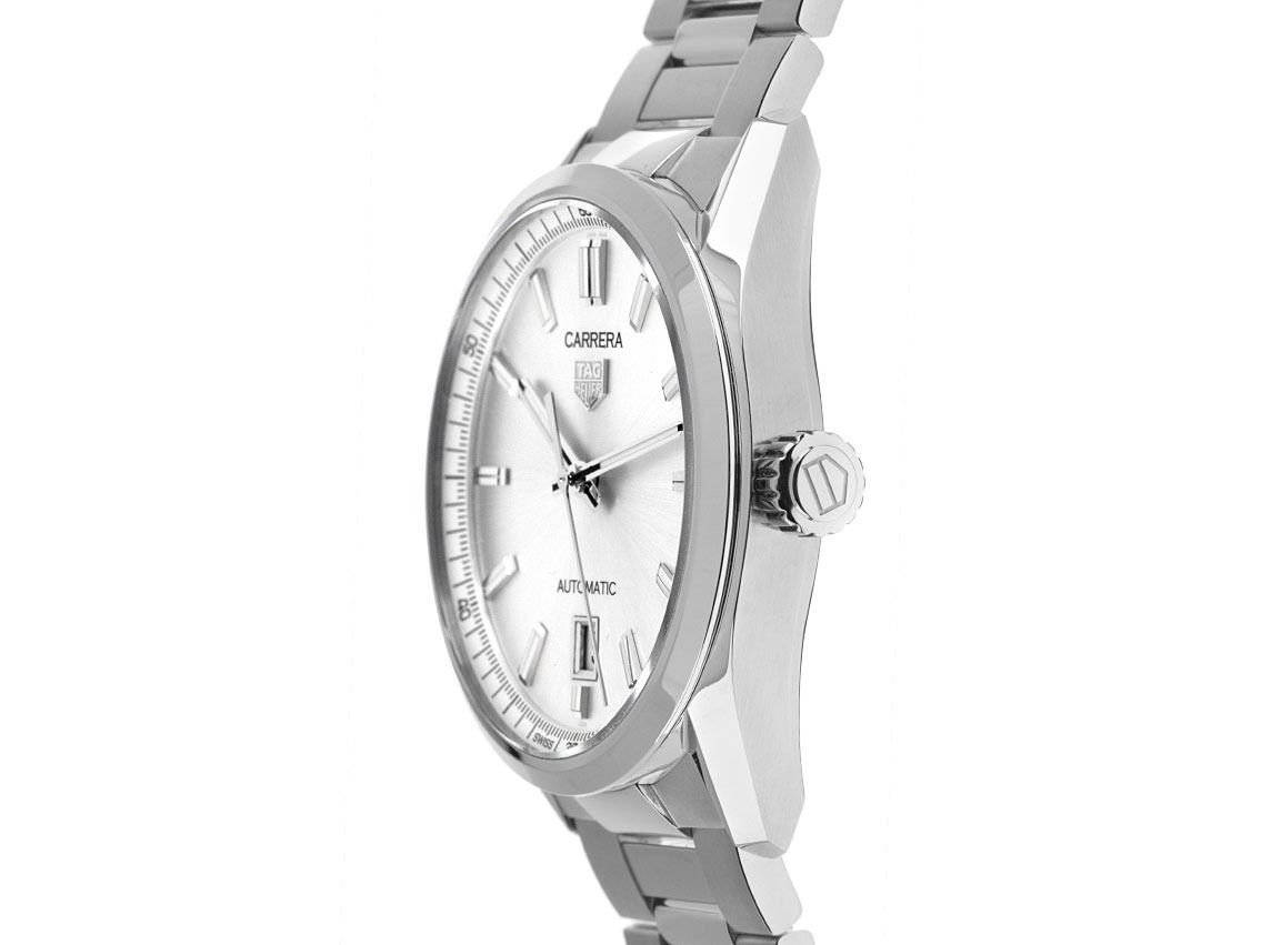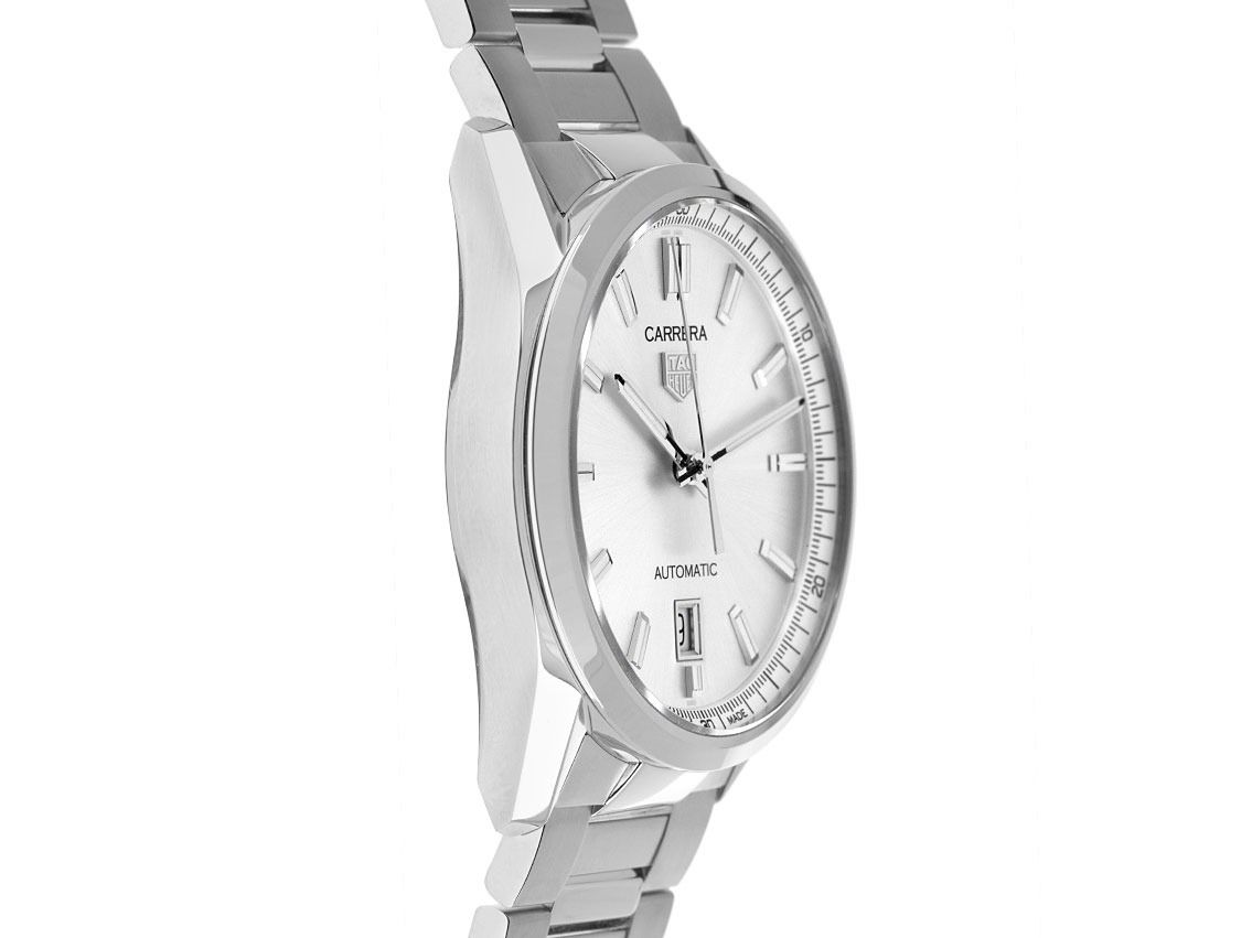 Tag Heuer Carrera Date Stahl Automatik Armband StahlGehäuse Edelstahl poliert, Gehäusedurchmesser ohne Krone 39mm, Gehäusehöhe 11,5mm. Lünette Edelstahl glatt und poliert. Armband Edelstahl poliert und satiniert, Sicherheitsfaltschließe Edelstahl mit Hersteller-Logo. Zifferblatt silberfarben mit aufgesetzten Edelstahl Leuchtindexen und polierten Edelstahl Leuchtzeigern. Uhrwerk Automatik, Kaliber Tag Heuer Calibre 5 mit 26 Edelsteinen, Gangreserve ca. 38 Stunden. Anzeige von Stunde, Minute und Sekunde über Zeiger aus der Mitte mit Sekundenstopp zur sekundengenauen Einstellung der Uhrzeit, Datumsanzeige mit Schnellverstellung bei 6 Uhr. Saphirglas kratzfest und gewölbt. Krone mit Hersteller-Logo. Boden Edelstahl verschraubt und graviert mit Saphirglas Sichtfenster. Gewicht der Uhr inklusive Armband 127g, Länge des Armbandes inklusive Gehäuse 190mm. Wasserdicht bis 10 ATM. Referenznummer: WBN2111.BA0639, ID: ST580646720825H-3550, Artikelnummer: 10000082184. Original Tag Heuer Box mit Umkarton und Garantie Papiere von August 2025, Full Set. Ungetragen. Lieferzeit sofort.