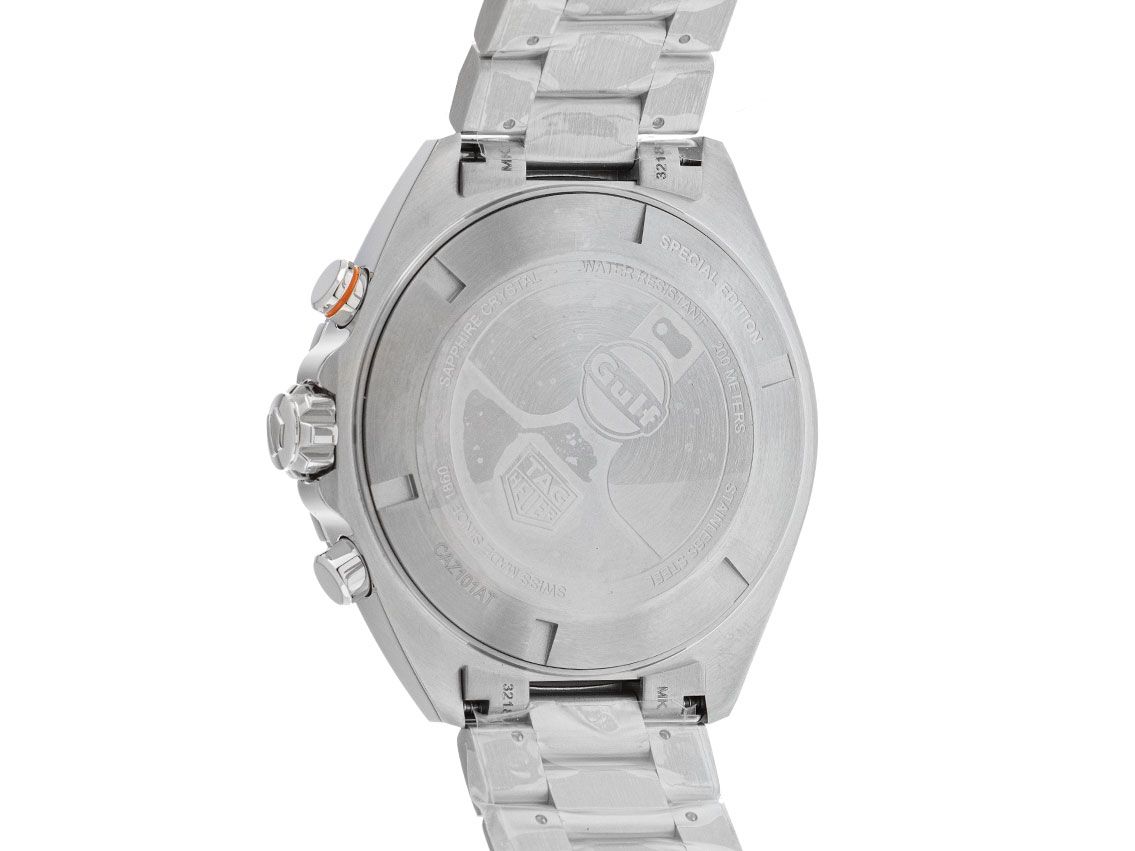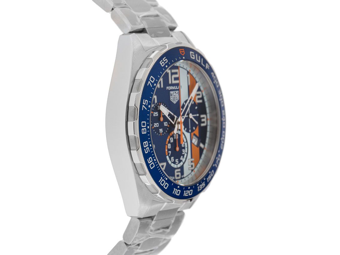 Tag Heuer Formula 1 X Gulf Stahl Quarz Chronograph Armband StahlGehäuse Edelstahl satiniert, Gehäusedurchmesser ohne Krone 43mm, Gehäusehöhe 12,4mm. Lünette Edelstahl mit blauem Inlay und Speedometerskala. Armband Edelstahl satiniert, Sicherheitsfaltschließe Edelstahl mit Hersteller-Logo. Zifferblatt blau mit Streifen, arabischen Leuchtziffern und Edelstahl Leuchtzeigern. Uhrwerk quarzgesteuert, Chronograph, Kaliber Tag Heuer. Anzeige von Stunde und Minute über Zeiger aus der Mitte, kleine Sekunde mit Sekundenstopp zur sekundengenauen Einstellung der Uhrzeit bei 3 Uhr, Datumsanzeige mit Schnellverstellung bei 4 Uhr. Saphirglas kratzfest. Krone verschraubbar mit Hersteller-Logo. Boden Edelstahl verschraubt und graviert. Gewicht der Uhr inklusive Armband 184g, Länge des Armbandes inklusive Gehäuse 200mm. Wasserdicht bis 20 ATM. Referenznummer: CAZ101AT.BA0842, ID: ST580634220925H-2450, Artikelnummer: 10000082182. Original Tag Heuer Box mit Umkarton und Garantie Papiere von August 2025 sowie Beschreibung, Full Set. Ungetragen. Lieferzeit sofort.