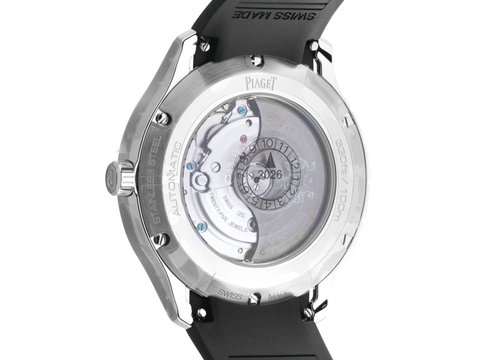 Gehäuse Edelstahl poliert und satiniert, Gehäusemaße ohne Krone 42mm, Gehäusehöhe 9,4mm. Pieza de mano de Edelstahl brillante, pulida y satinada. Armband Kautschuk schwarz, Anstoßbreite 21mm, Doppelsicherheitsfaltschließe Edelstahl mit Herstellerlogo. Zifferblatt schwarz guillochiert mit aufgesetzten Leuchtindexen und Leuchtzeigern. Reloj automático, cronómetro con aguja, calibre Piaget 1110P con 25 agujas, reserva de marcha de aprox. 50 horas. Anzeige von Stunde, Minute und Sekunde über Zeiger aus der Mitte mit Sekundenstopp zur sekundengenauen Einstellung der Uhrzeit, Datumsanzeige mit Schnellverstellung bei 6 Uhr. Saphirglas kratzfest. Cristal negro con logotipo del fabricante. Cuerpo de Edelstahl de 6 pulgadas recubierto y gravado con cristal de zafiro. Gewicht der Uhr inklusive Armband 108g. Consumo de agua hasta 10 ATM. Número de referencia: G0A47014, ID: ST5806178020925H-13300, Artikelnummer: 10000082212. Caja original Piaget con caja de cartón y papel de garantía de 2025, juego completo. Ungetragen. Lieferzeit sofort.