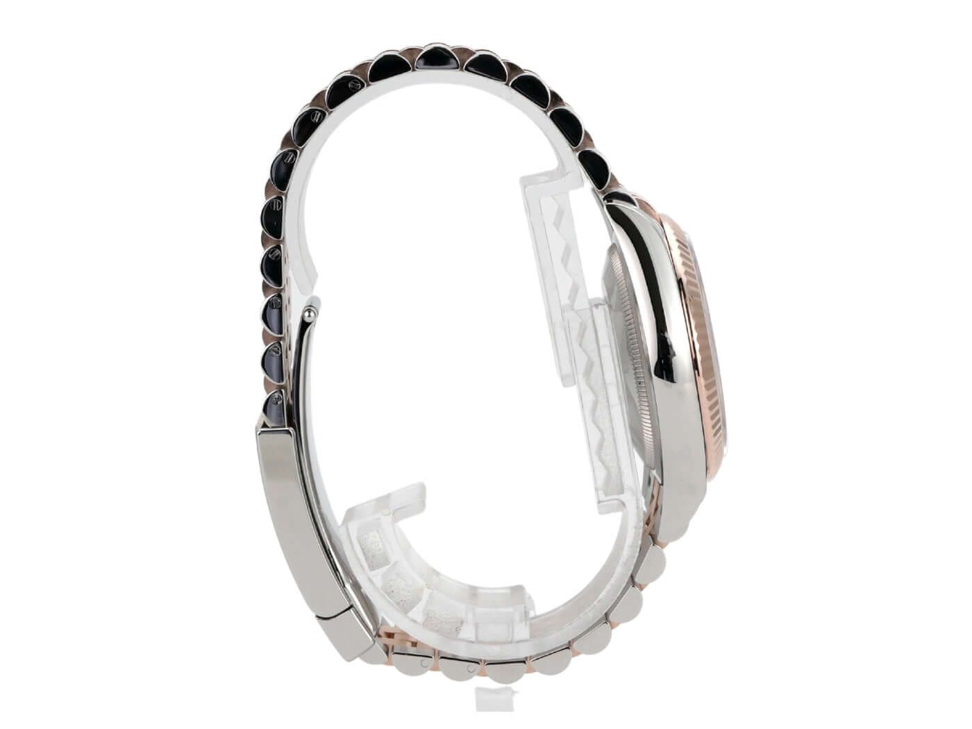 Caja de acero inoxidable pulido y satinado, diámetro de la caja 36 mm, bisel fluted de oro Everose de 18 kt, brazalete Jubilee de acero inoxidable pulido y satinado / oro Everose de 18 kt con cierre desplegable, esfera blanca con números romanos aplicados de oro rosa, agujas de oro rosa, movimiento automático, calibre 3235 de la manufactura Rolex con 31 rubíes, 28.800 A/h, 70 horas de reserva de marcha, indicador de fecha, cronómetro, cristal de zafiro resistente a los arañazos, corona atornillada de oro Everose de 18 kt, fondo de la caja de acero inoxidable atornillado, hermético hasta 10 bar.