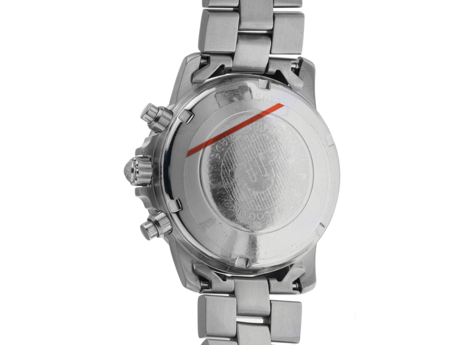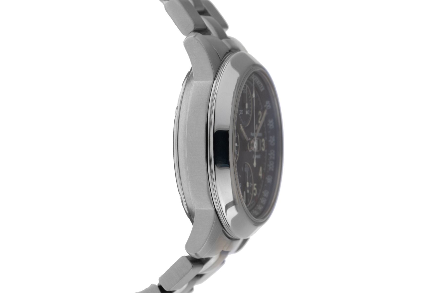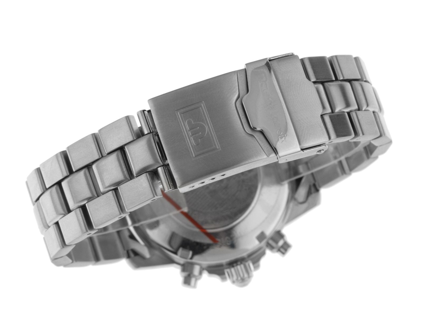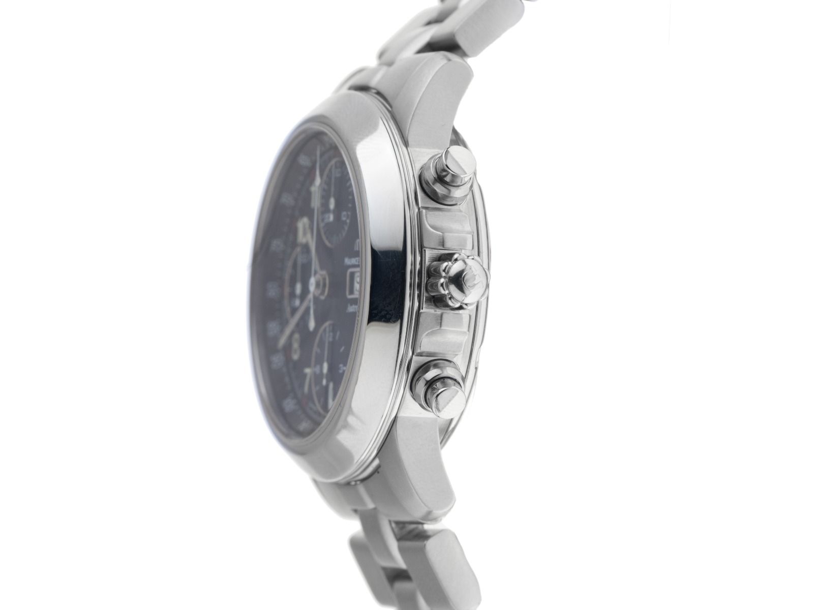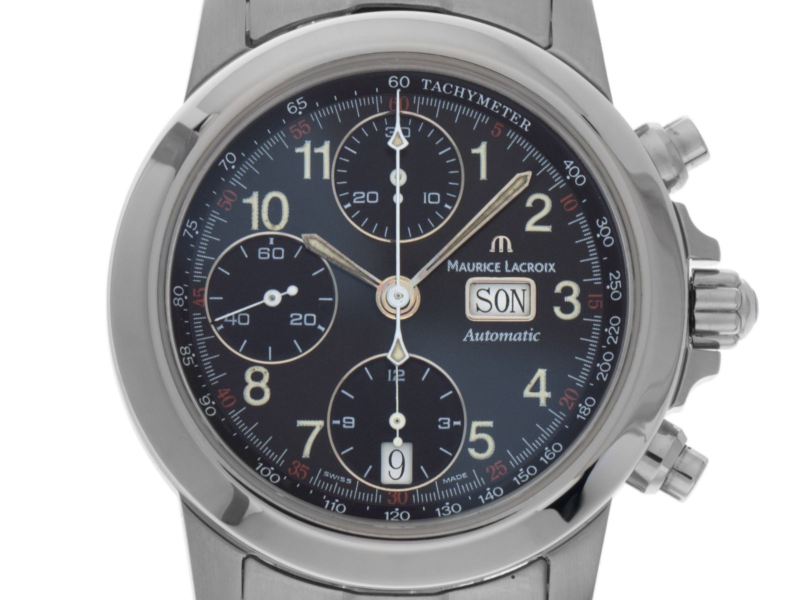 Gehäuse Edelstahl poliert, Gehäusedurchmesser ohne Krone 40mm, Gehäusehöhe 14,3mm. Lünette Edelstahl poliert mit Unterglas Tachymeter-Skala. Brazalete de Edelstahl satinado, correa de seguridad de Edelstahl con logotipo del fabricante. Zifferblatt schwarz mit arabischen Ziffern und Edelstahl Zeigern. Reloj automático, cronógrafo, calibre 7750 con 25 agujas. Anzeige von Stunde und Minute über Zeiger aus der Mitte, kleine Sekunde mit Sekundenstopp zur sekundengenauen Einstellung der Uhrzeit bei 9 Uhr, Datumsanzeige mit Schnellverstellung bei 6 Uhr und Wochentagaganzeige mit Schnellverstellung in Deutsch bei 3 Uhr. Saphirglas kratzfest. Krone Edelstahl verschraubbar mit Herstellerlogo. Cuerpo de acero pulido y pintado. Gewicht der Uhr inklusive Armband 147g, Länge des Armbandes inklusive Gehäuse 170mm. Número de referencia: 39721, Gehäusenummer: 10XXX, Baujahr: 1998, ID: P15036000925H-2600, Artikelnummer: 10000082244. Mit Gangkontrolle und kompletter äußerlicher Aufarbeitung von September 2025. Caja original Maurice Lacroix con caja de cartón y papel de garantía sin fecha y descripción, caja de madera y registro de relojes de septiembre de 2025, The Watch Register Zertifikat / ohne Eintrag (Internationale Datenbank für verlorene oder gestohlene Uhren), juego completo. Muy buen estado. Lieferzeit sofort.