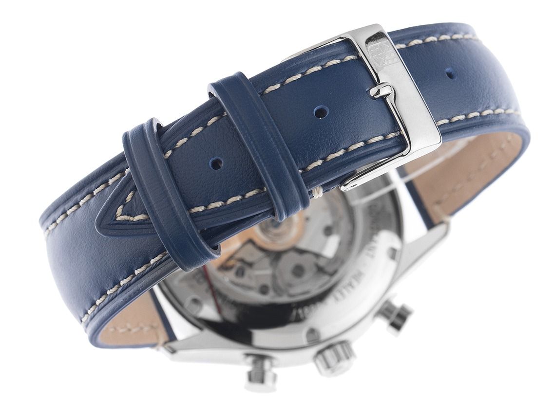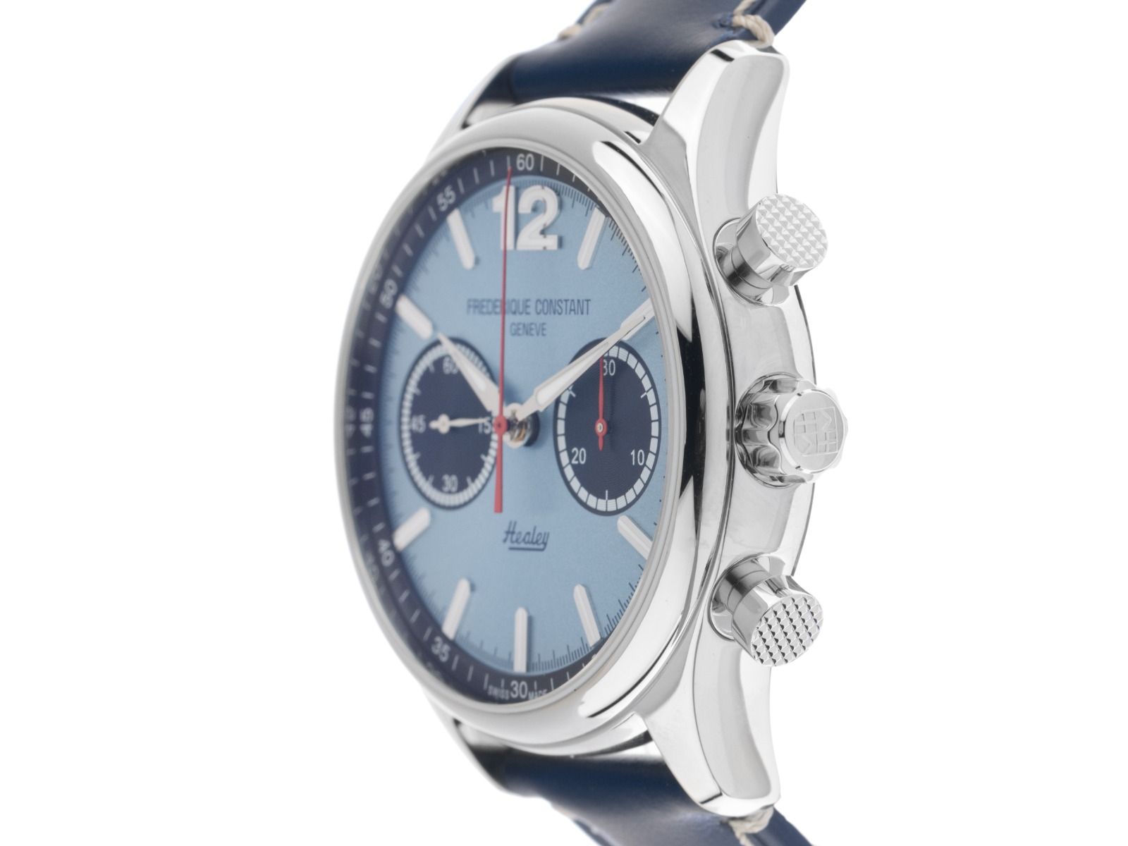 Frederique Constant Vintage Rally Healey Stahl Automatik Armband Leder LimitiertGehäuse Edelstahl poliert, Gehäusedurchmesser ohne Krone 42mm, Gehäusehöhe 14,45mm. Lünette Edelstahl glatt und poliert. Armband Leder blau mit weißer Ziernaht, Anstoßbreite 21mm, Stiftschließe Edelstahl mit Hersteller-Logo. Zifferblatt Eisblau mit aufgesetzten Edelstahl Leuchtindexen, arabischer Leuchtziffer 12 und Edelstahl Leuchtzeigern mit "Healey" Schriftzug. Uhrwerk Automatik, Chronograph, Frederique Constant Kaliber FC-397 Basis SW500 mit 27 Edelsteinen, Gangreserve ca. 62 Stunden. Anzeige von Stunde und Minute über Zeiger aus der Mitte, kleine Sekunde mit Sekundenstopp zur sekundengenauen Einstellung der Uhrzeit bei 9 Uhr. Saphirglas kratzfest und gewölbt. Krone mit Hersteller-Logo. Boden Edelstahl verschraubt und graviert mit Saphirglas Sichtfenster. Gewicht der Uhr inklusive Armband 91g. Wasserdicht bis 5 ATM. Referenznummer: FC-397HLBN5B6, ID: ST254640400725H-3395, Artikelnummer: 10000081755. Original Frederique Constant Box mit Umkarton und Garantie Papiere sowie Beschreibung, Modellauto Austin Healey, Full Set. Limitiert auf 1888 Exemplare. Neu. Lieferzeit sofort.