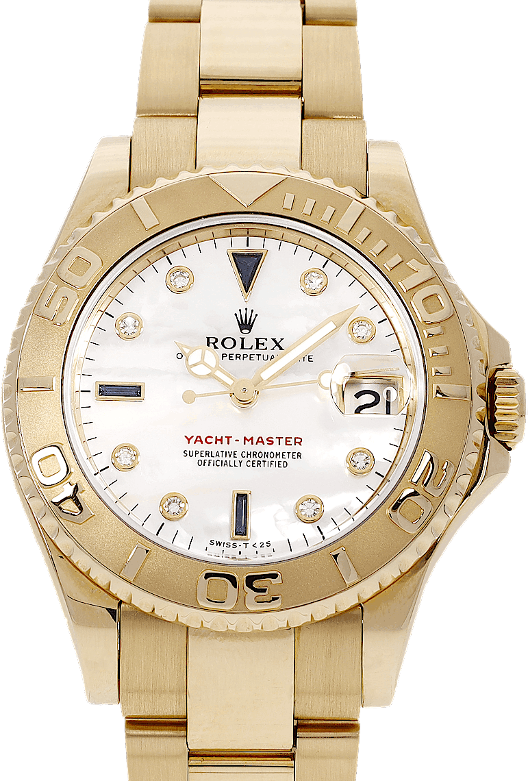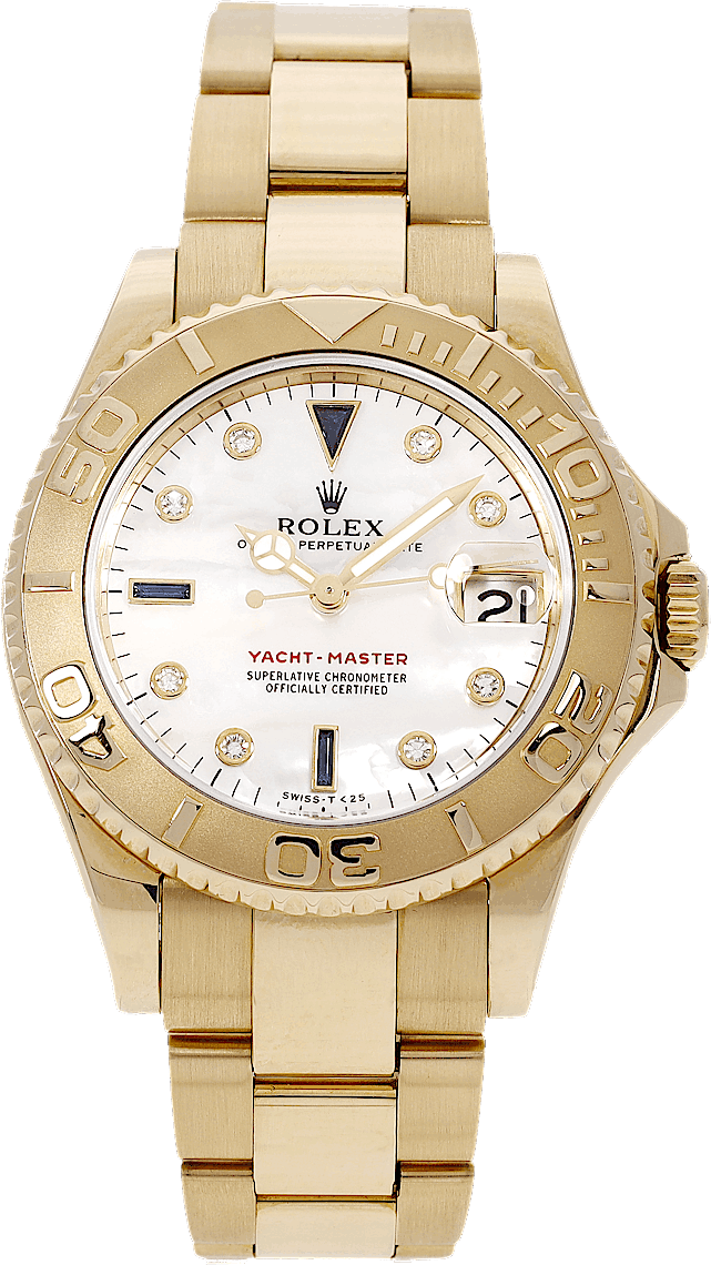 Rolex Yacht-Master, Reference: 16628, Gender: Female, Size: 35mm, Dial color: Mother of Pearl, Strap material: Yellow Gold, Movement: Automatic, Condition: Previously worn with some signs usage. The movement is flawless and the case has been cleaned. watch tested to ensure full functionality. An inspection by our certified watchmakers guarantees its authenticity., Documents: Chronext Certificate