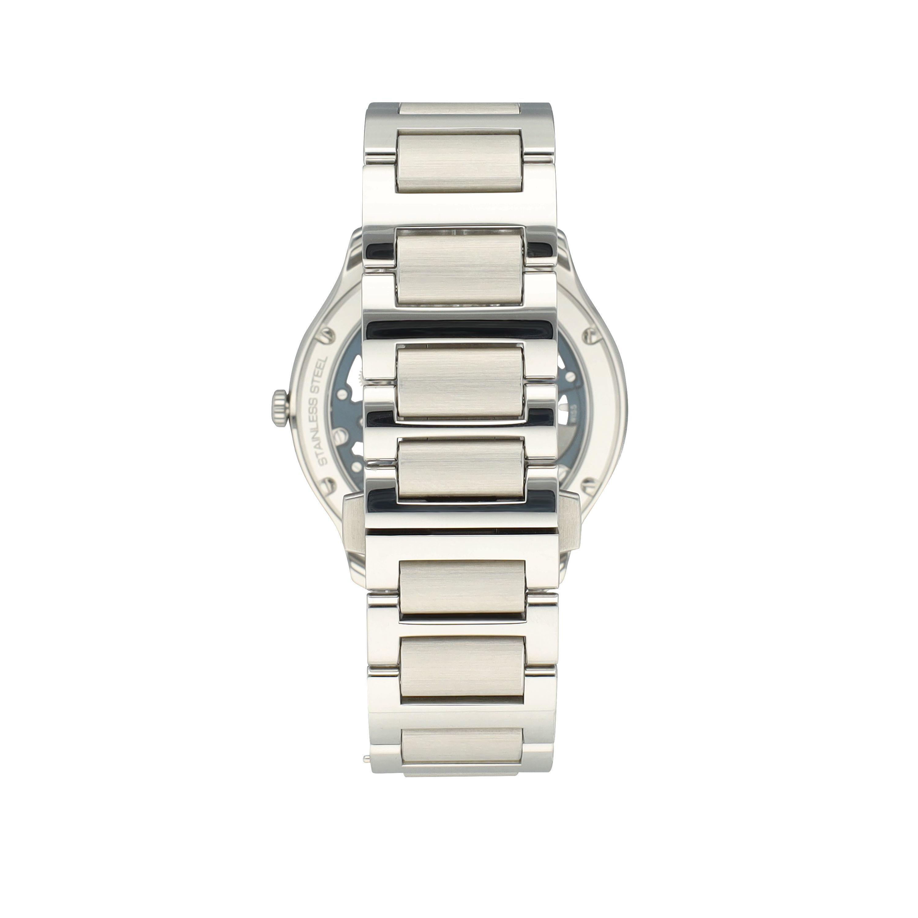 El reloj presenta una esfera guilloché horizontal de color azul oscuro con índices aplicados y contadores de cronógrafo plateados en contraste, que ofrecen los dos una profundidad visual y una gran legibilidad. La caja de acero inoxidable de 42 mm está emparejada con un brazalete de acero inoxidable integrado, que ofrece un ajuste perfecto y moderno en la muñeca.