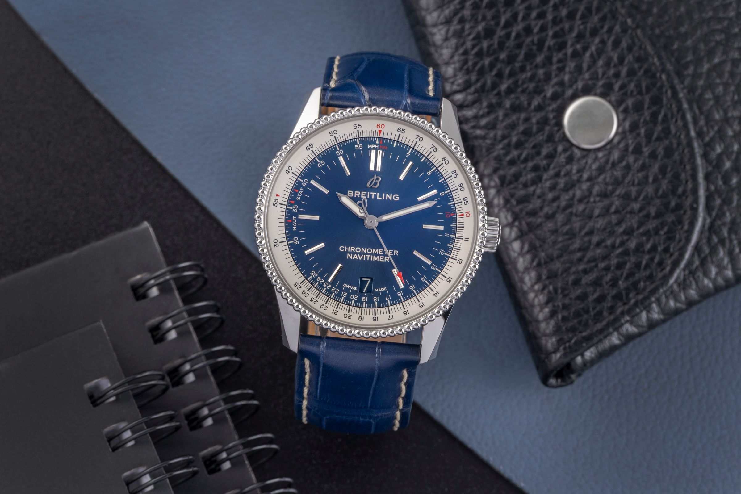 Alternative title: Breitling A17325211C1P1 Navitimer 1 38 Automatic Stainless Steel / Blue / Croco / Pin; Breitling Navitimer 38 Automatik Datum Stahl Herrenuhr Ref. A17325211C1P1 B&P [2504676]