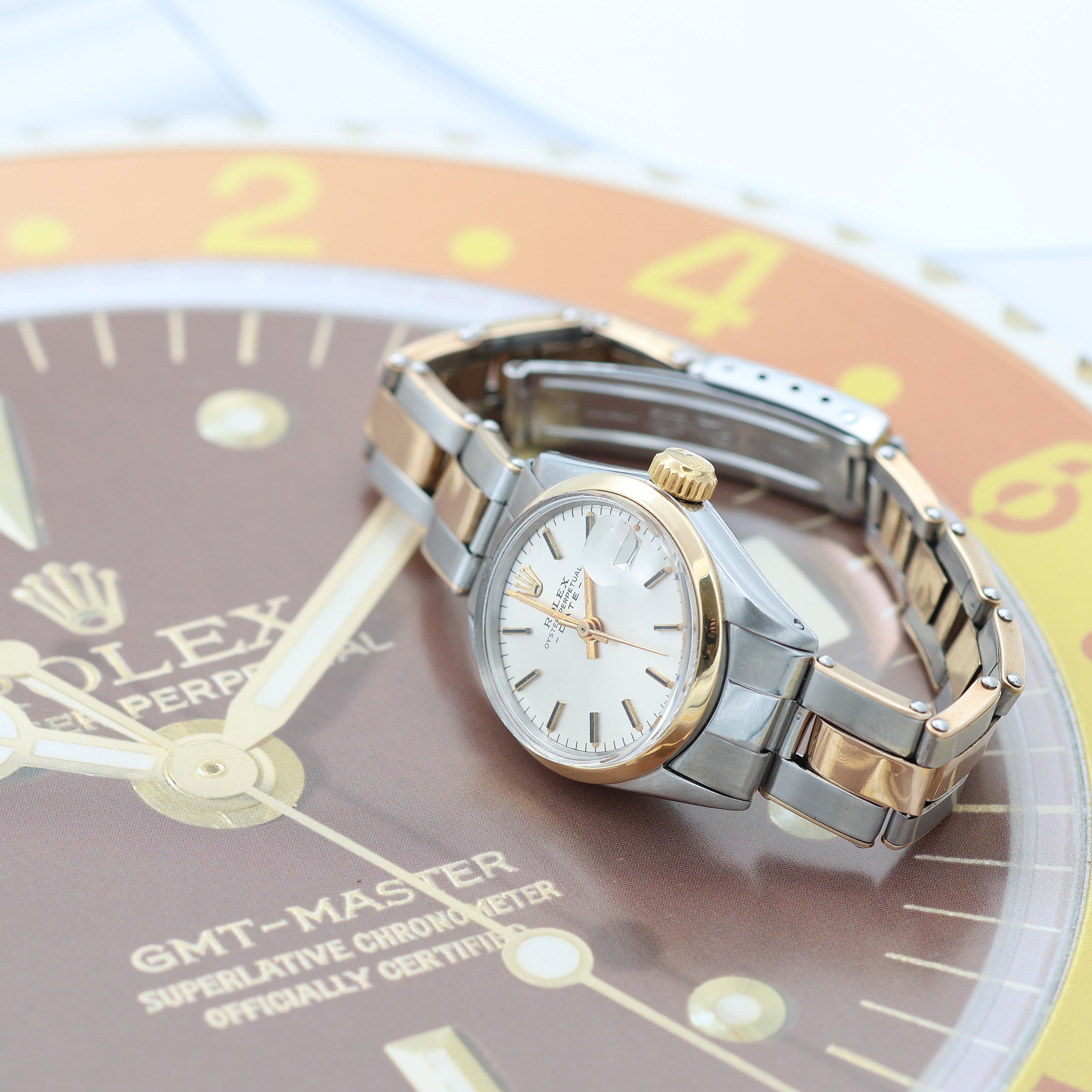 For sale: pre-owned Rolex Datejust Lady ref. 6516, in steel and yellow gold on an oyster rivet bracelet, automatic, from the '70s, with a bright silver dial. The Rolex 6516 is a vintage women's timepiece from the Oyster Perpetual collection, produced primarily in the 1950s and 1960s. Known for its classic elegance and compact size, the 6516 features an automatic movement housed in a 26mm Oyster case, typically crafted in solid gold. It showcases Rolex’s iconic fluted bezel and a date function at the 3 o’clock position, protected by the brand’s signature Cyclops lens. With its timeless design and reliable performance, the 6516 remains a sought-after model among collectors of vintage Rolex watches. The example sold here has been worn throughout its life, but is still in good condition. Please study the pictures in this listing well: they show the watch in the condition that it is in, with no digital enhancements to make it look better than it is.Contact us in case of any doubts/inquiry. BRAND ROLEX MODEL OYSTER PERPETUAL DATEJUST LADY REFERENCE 6516 CASE MATERIAL YELLOW GOLD/STEEL MOVEMENT AUTOMATIC DIMENSION 26 MM DIAL SILVER BEZEL YELLOW GOLD CRYSTAL PLEXIGLASS BRACELET TYPE OYSTER (RIVET) BRACELET MATERIAL YELLOW GOLD/STEEL BRACELET LENGHT 16 CM ORIGINAL BOX NO ORIGINAL PAPERS NO YEAR APPROX. THE '70s CONDITION VERY GOOD